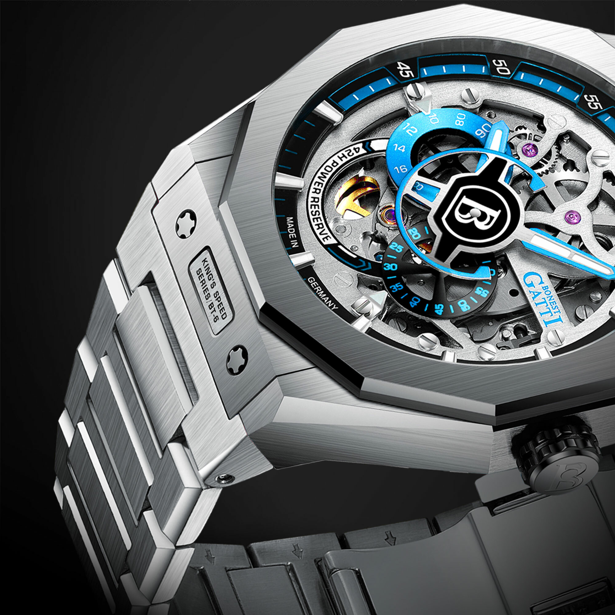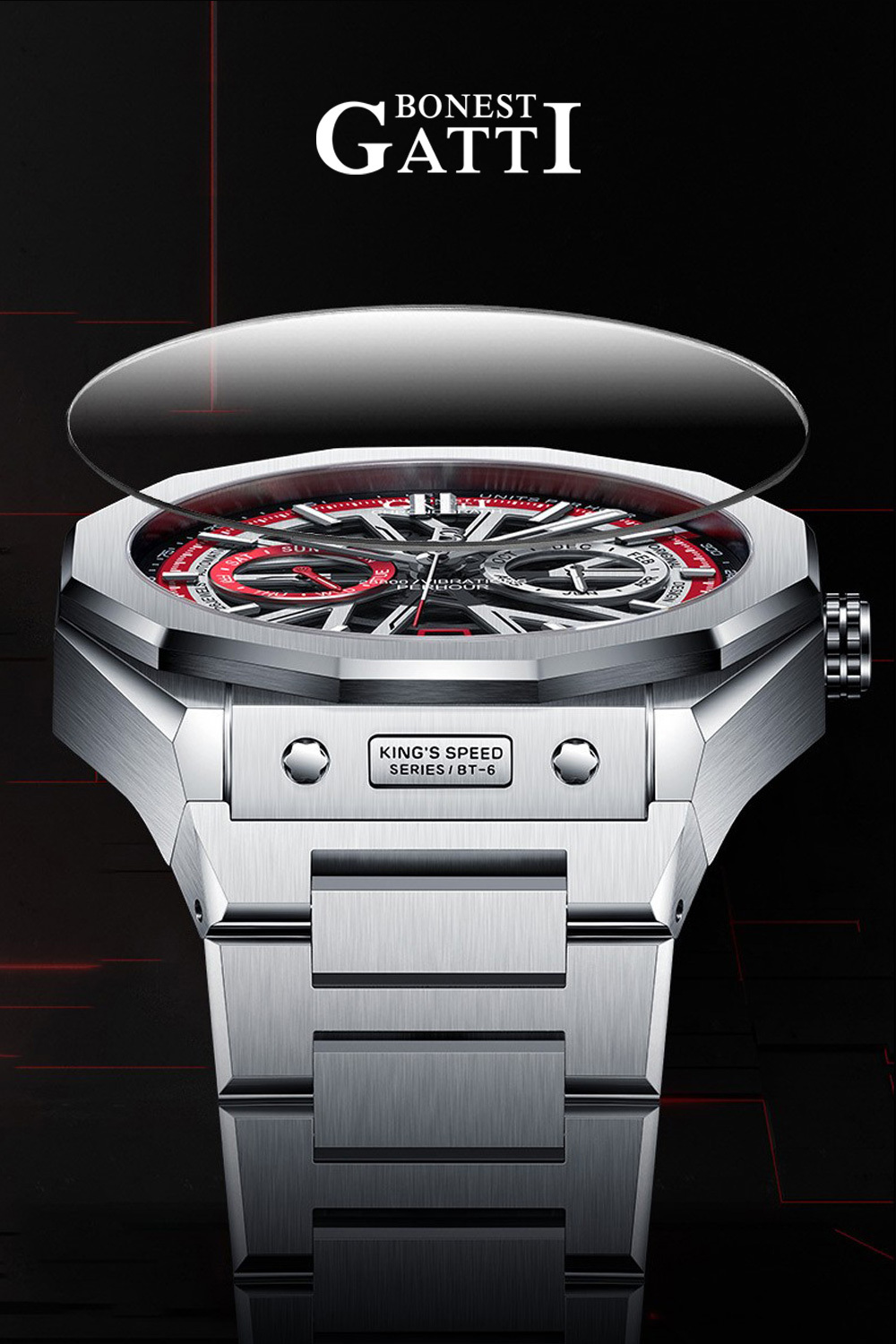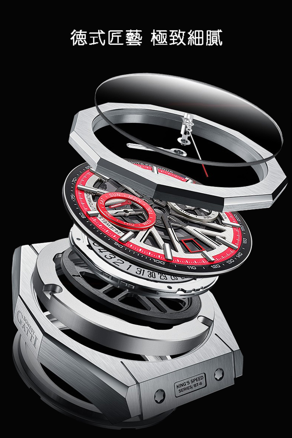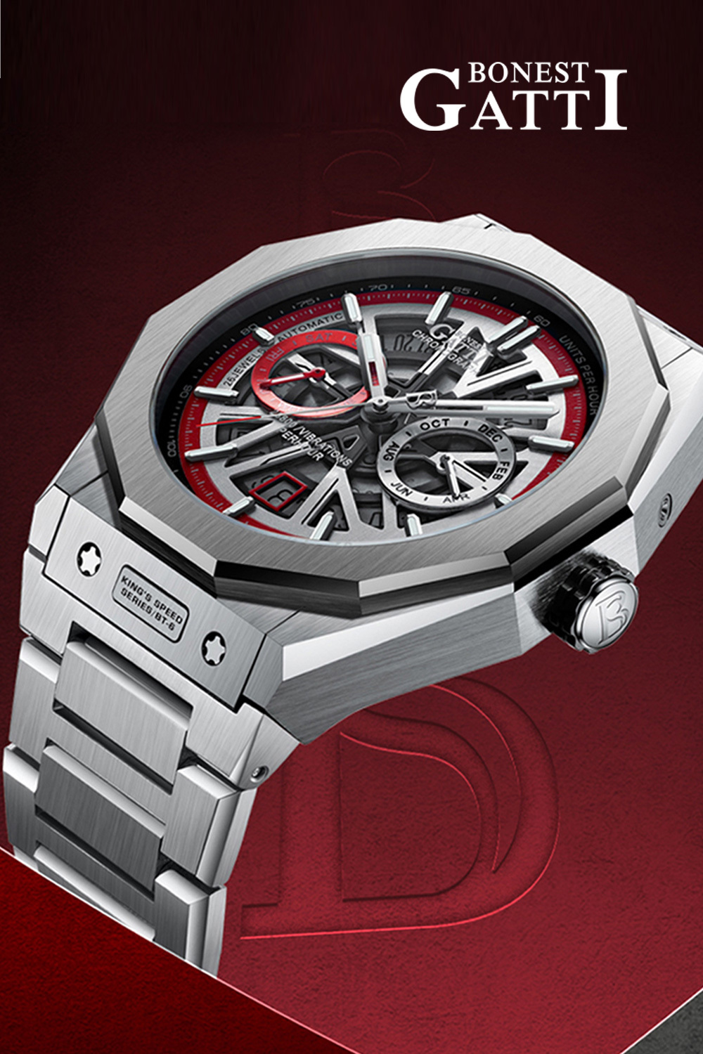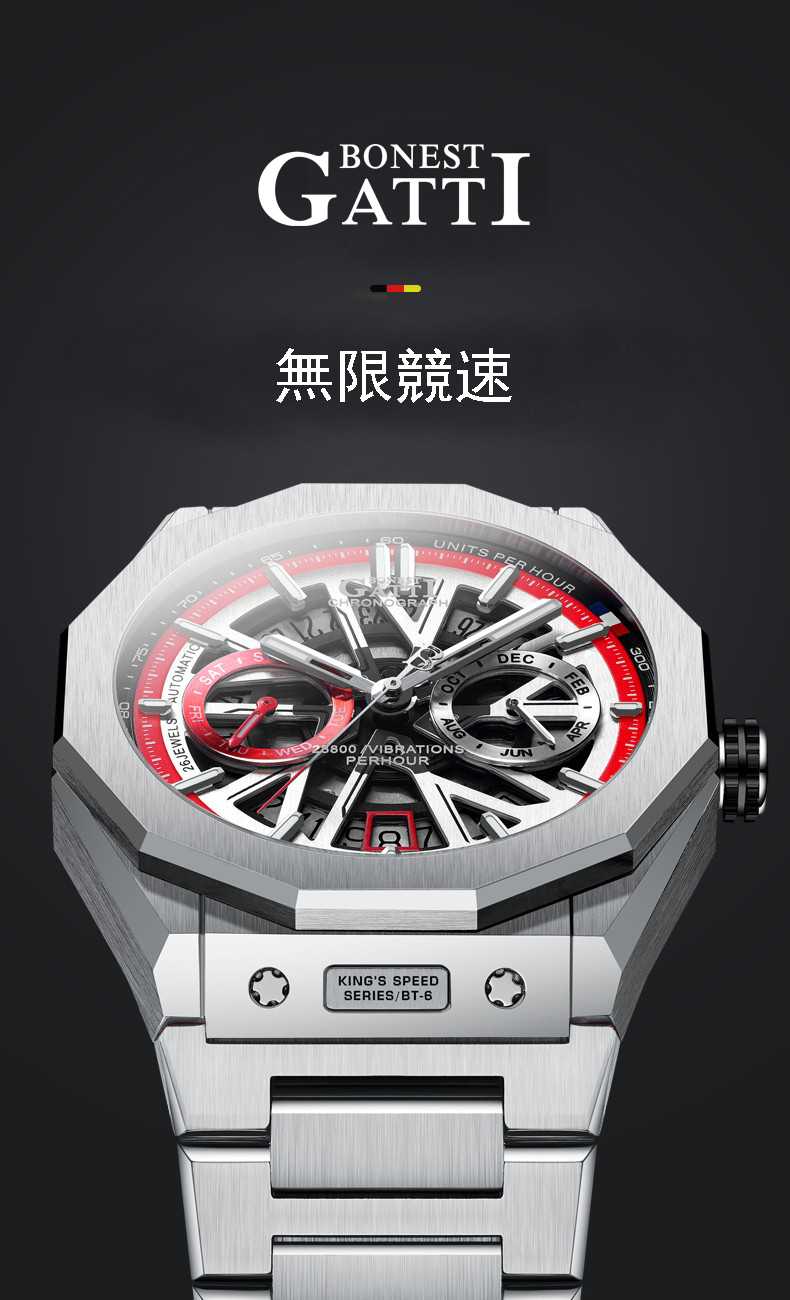 BONEST GATTI 寶加地腕錶為滿足每個男人追求速度的賽車夢想,將這份熱血注入腕錶設計中,融合鮮明奔放的超跑元素,以前衛的潮流理念,讓高端製錶工藝與現代美學設計撞擊出耀眼火花,誕生出流露濃烈超跑速度熱情的King Speed 競速系列腕錶。