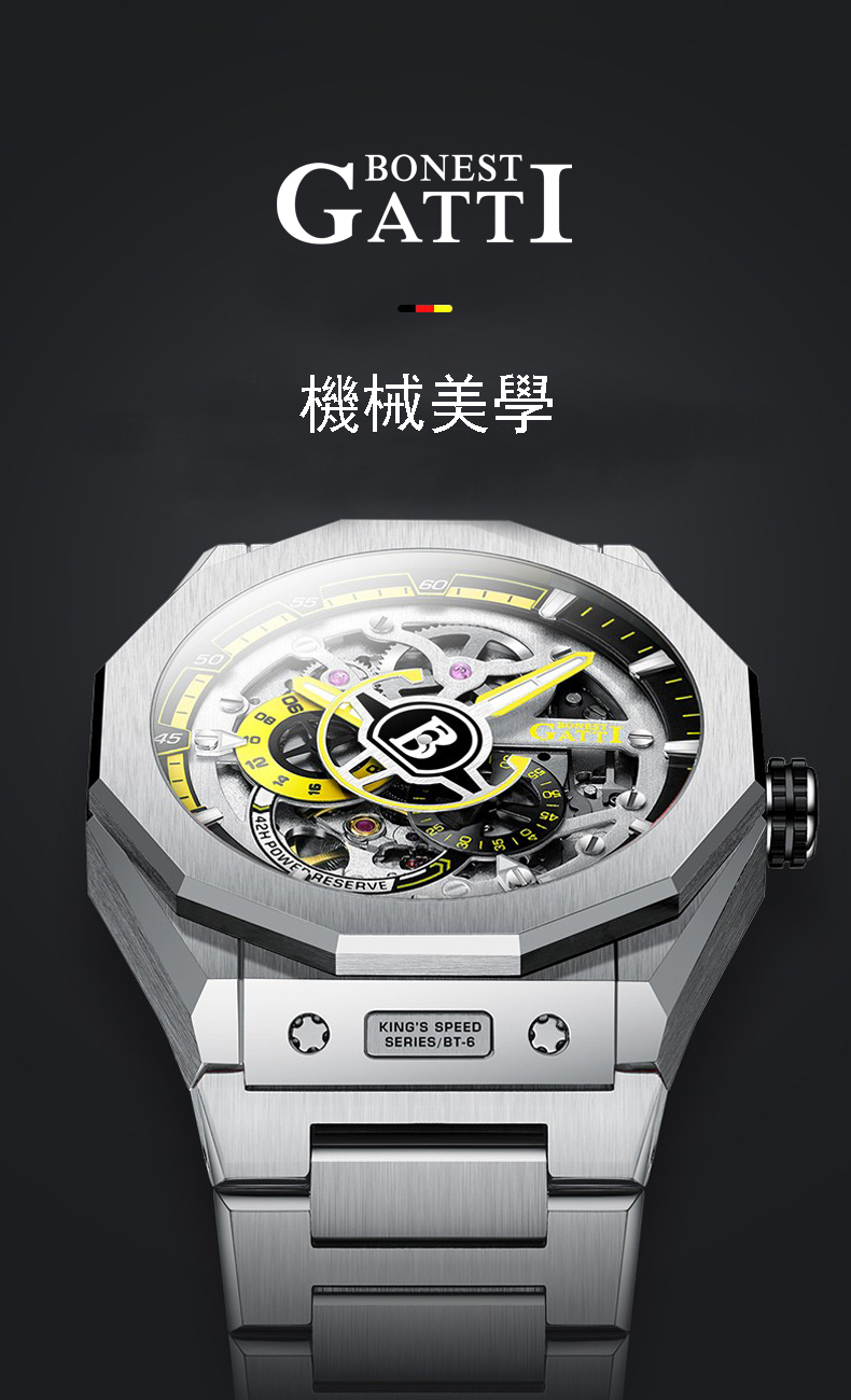 敢於別人所不敢的嘗試,【BONEST GATTI 寶加地】競速系列全以鏤空機芯呈現,讓運動錶有了截然不同的味道。鏤空機芯的線條感來自超跑的流線元素,而大膽前衛的撞色與層層堆疊的錶盤設計,更是將機械美學展現的淋漓盡致!