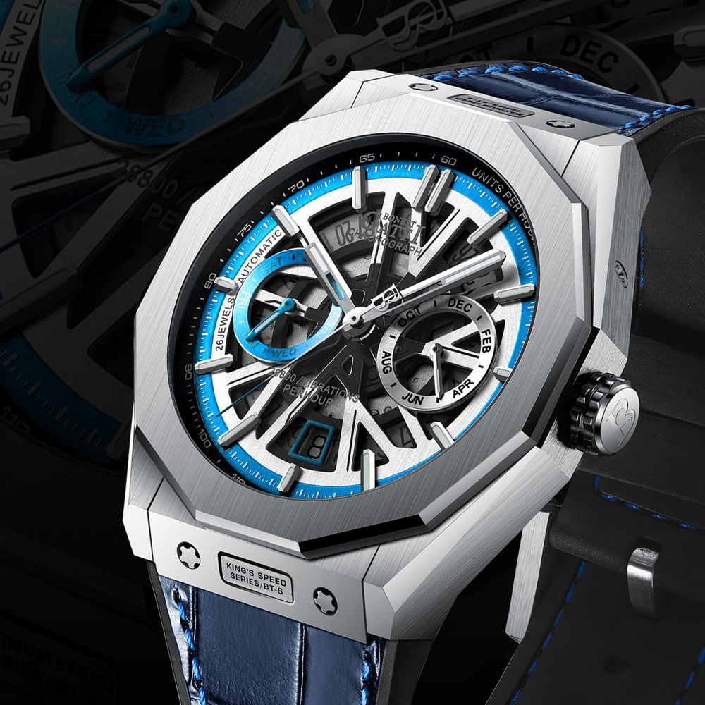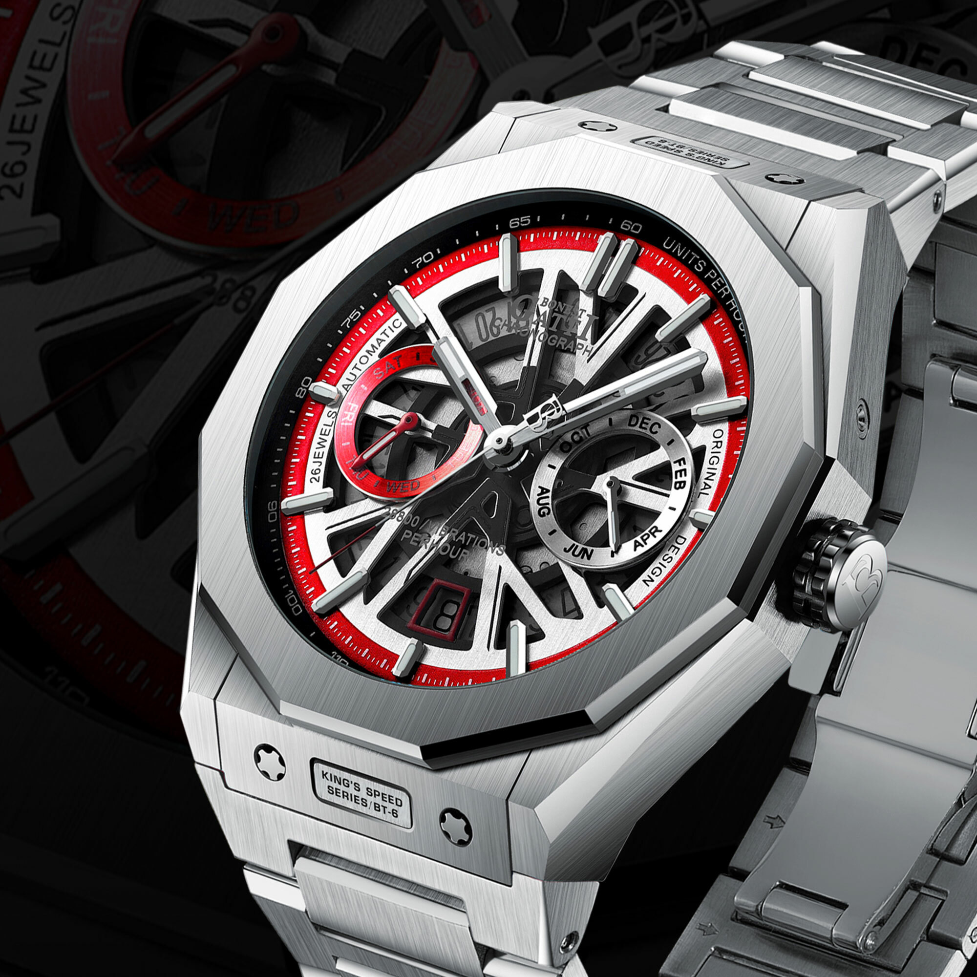 基於對傳統機械結構的熱愛,King Speed 競速系列錶款皆採用日本MIYOTA自動上鍊機械機芯,為了彰顯與眾不同的品味,每款腕錶都以混搭撞色與多層次結構設計,讓材質配色與機械結構之間能夠巧妙展現潮流與動感,滿足時下使用者求新求變的多元需求!