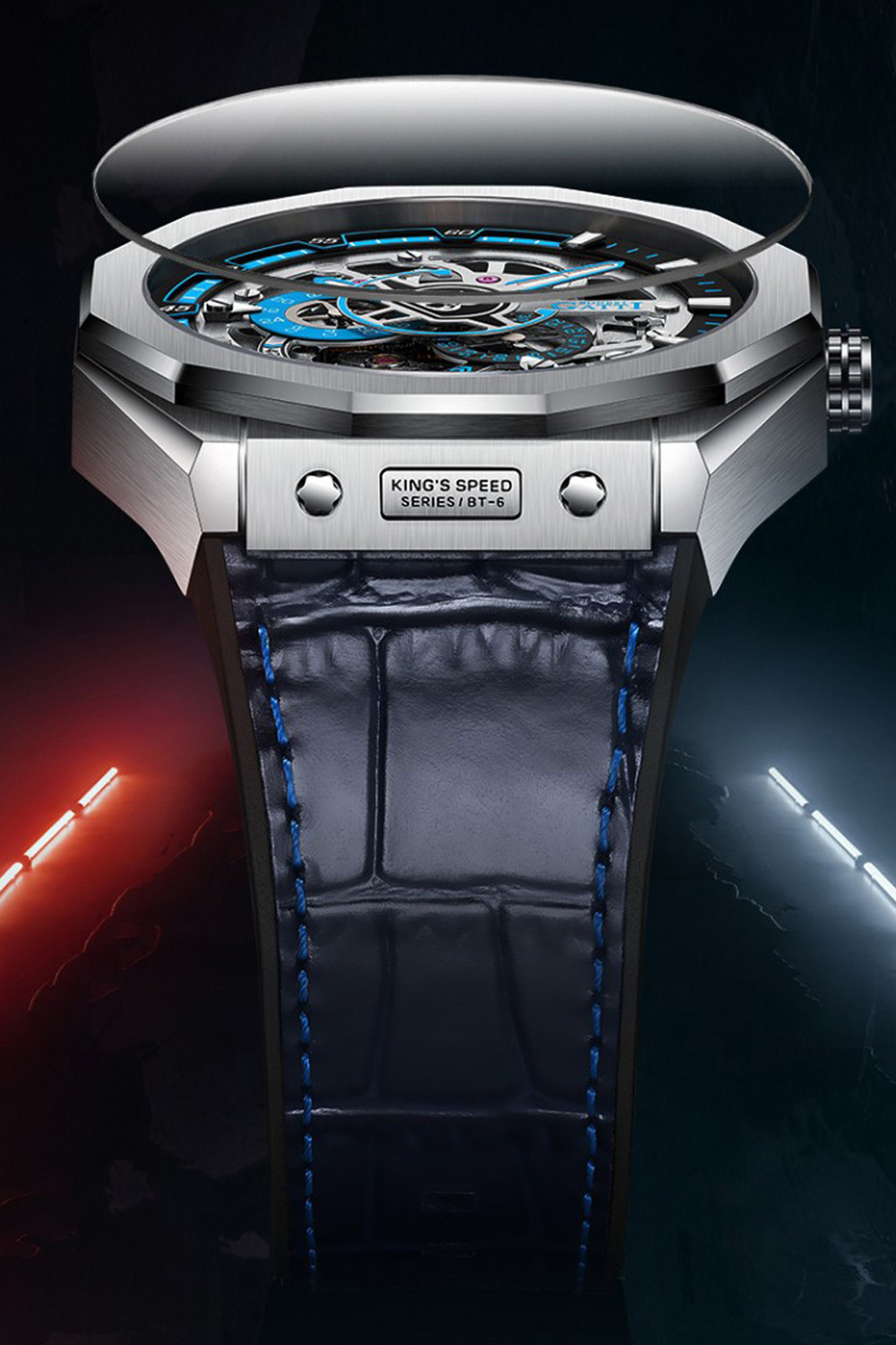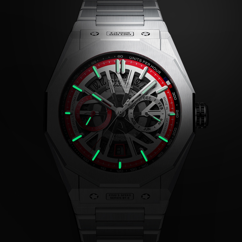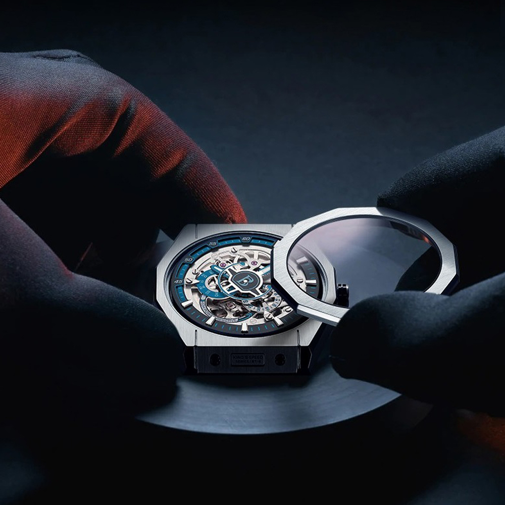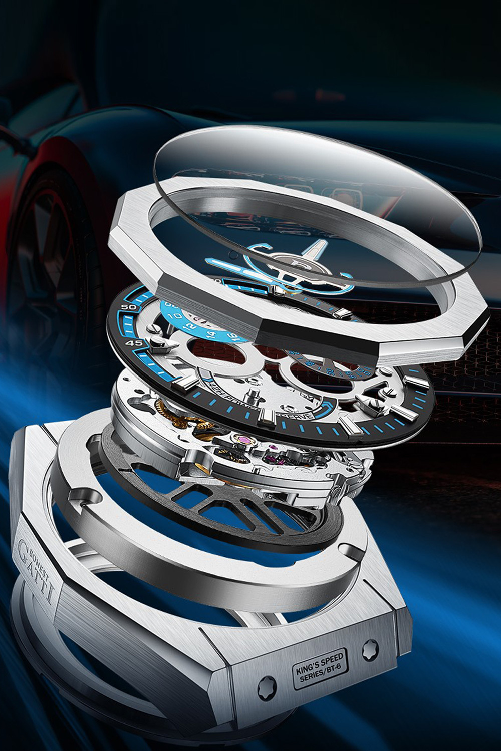 King Speed 競速系列腕錶以稜角分明的錶殼線條,展現超跑奔馳時呼嘯而過的快感;與眾不同的12邊形錶圈,象徵不凡的王者姿態;全系列錶款皆以鏤空面盤呈現,靈感源自於因應賽車運動而生、堅固且輕盈的鋼管車架,並能傳遞機械運作的美感,是超跑腕錶最為畫龍點睛的靈魂所在。