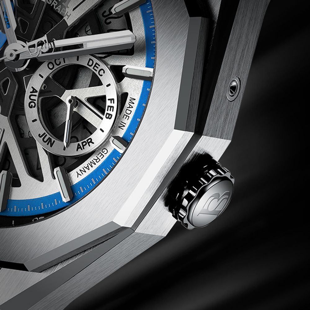 >> 以複雜的鏤空機芯為設計構思,將超跑元素一一納入錶盤與機芯之中。醒目的分針尾端造型,來自於F1賽車中的非圓形軛式方向盤;9點鐘方向的24小時制小錶盤與內錶圈上40分至5分的弧形大面積夜光刻度,宛如跑車儀表板上令人亢奮的時速及轉速表;機芯的自動盤設計成跑車輪圈造型,從透明底蓋中即可清楚感受旋轉時源源不絕注入的動力