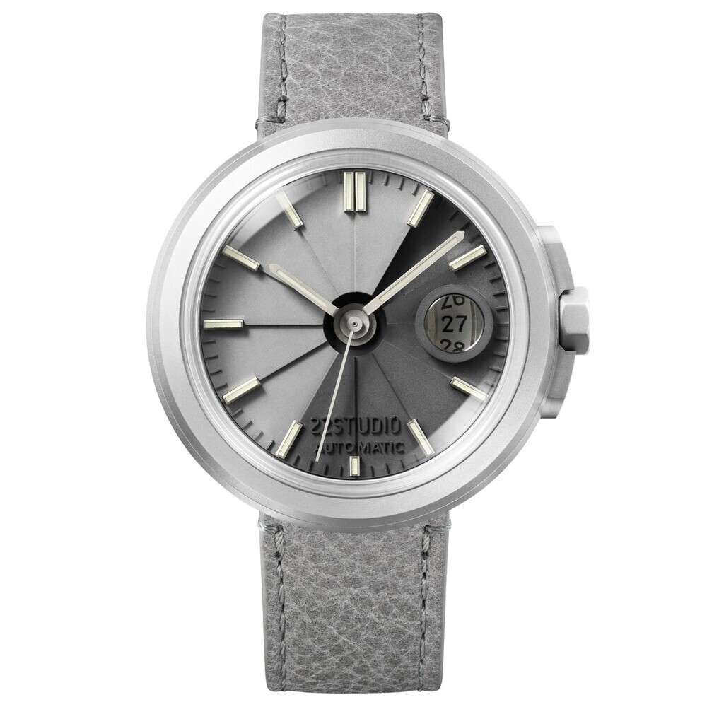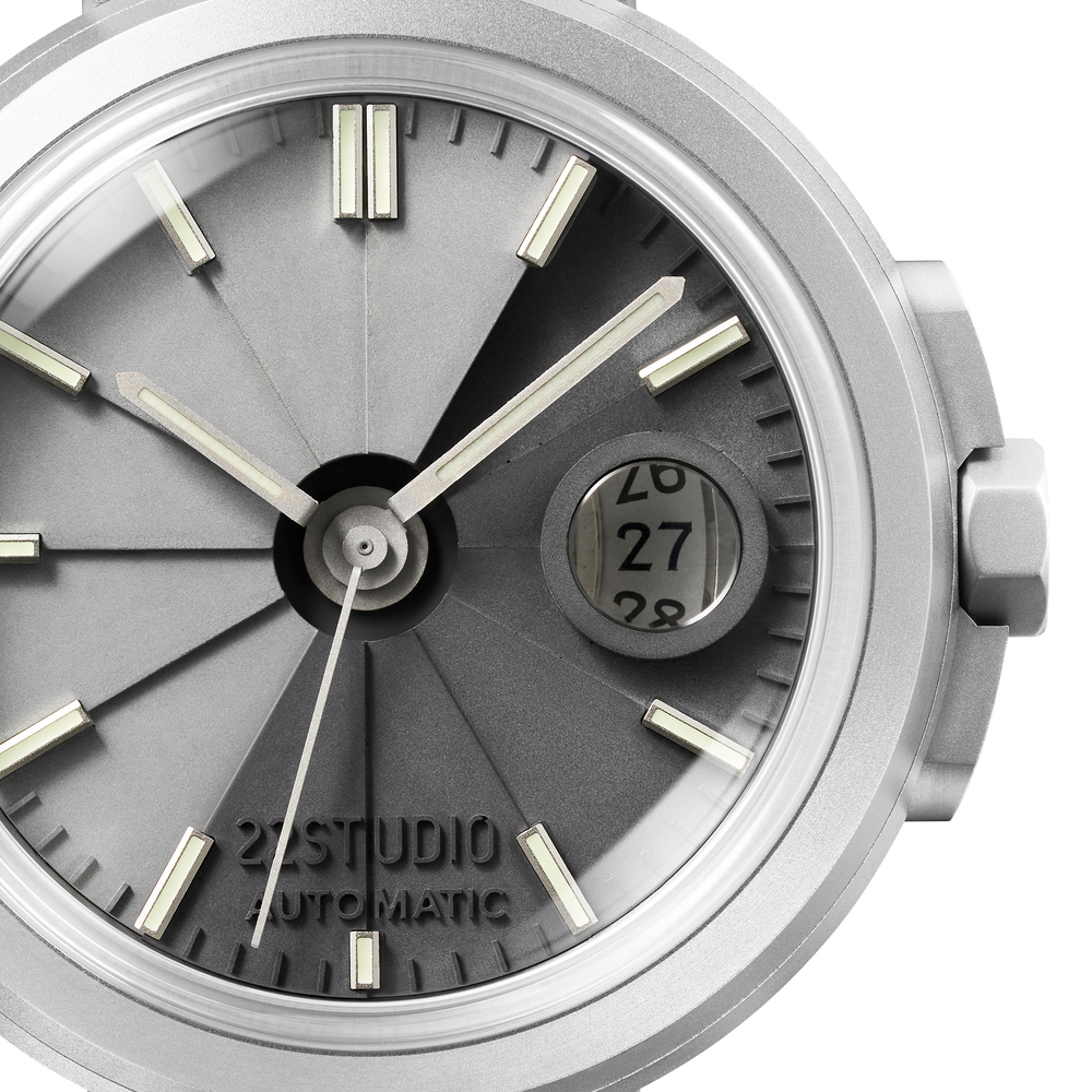 Another original design of 22STUDIO. We used the extra internal space on the surface of the spiral staircase to design a well-shaped date window on the clear water mold dial. Then we transferred the date magnifying glass, which is usually glued to the surface glass, to the upper edge of the well to clearly display the date, creating a rich interest.