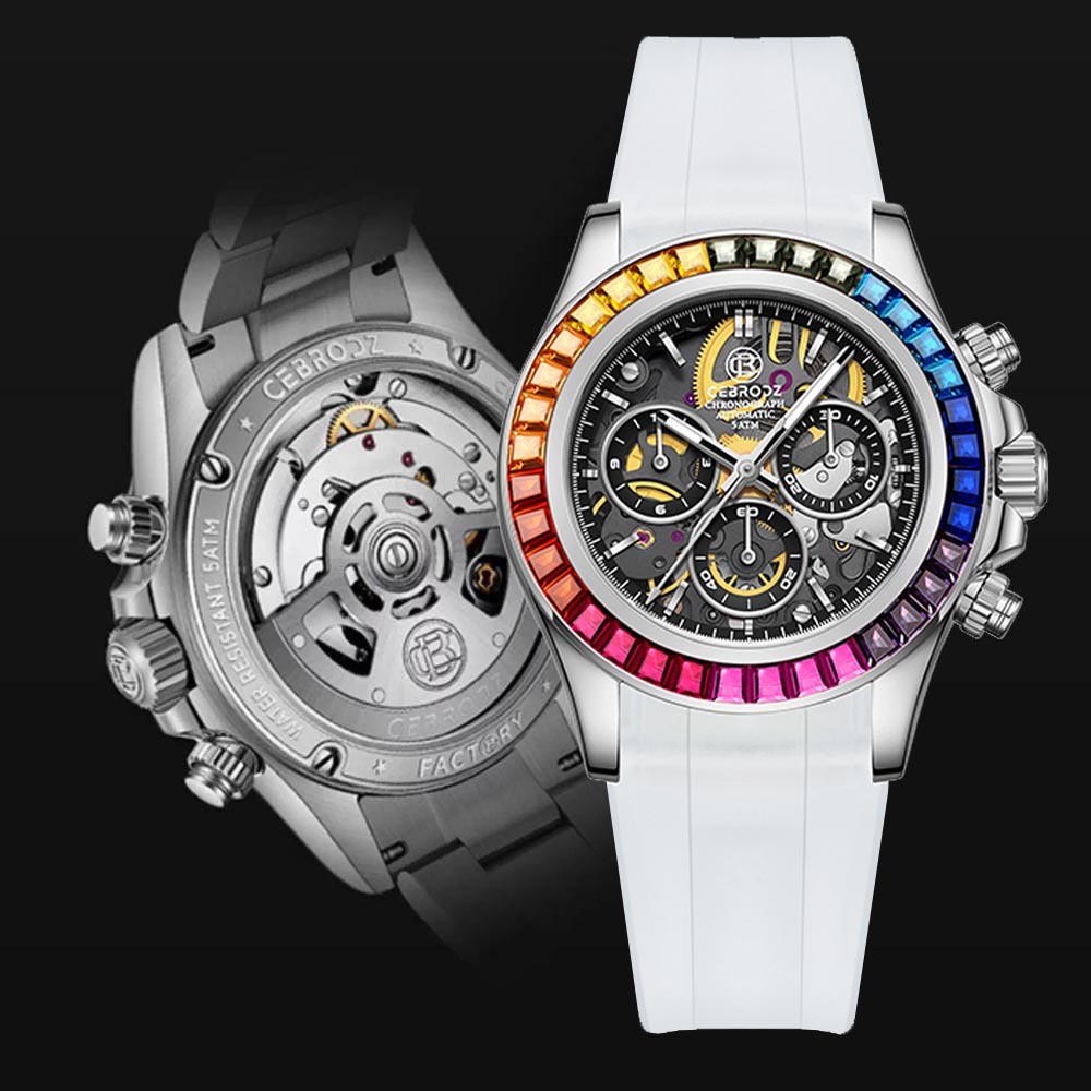 Crafted from 904-grade stainless steel, this skeleton chronograph reveals the precision of its column wheel automatic movement in every detail. The rainbow bezel set with a full spectrum of colored stones which captures light and attention from every angle.