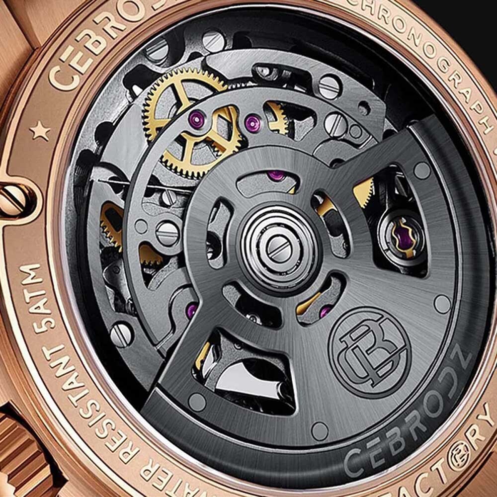 This rose gold skeleton timepiece features a self-winding chronograph movement for precise performance.