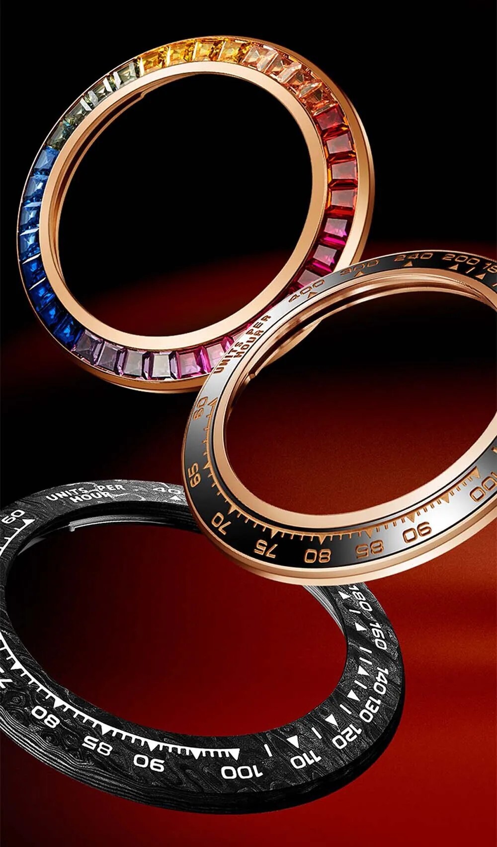 Crafted from 904-grade stainless steel with a lustrous PVD finish, and interchangeable black-rosegold ceramic bezel.