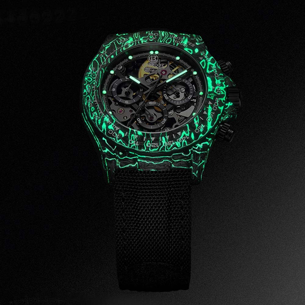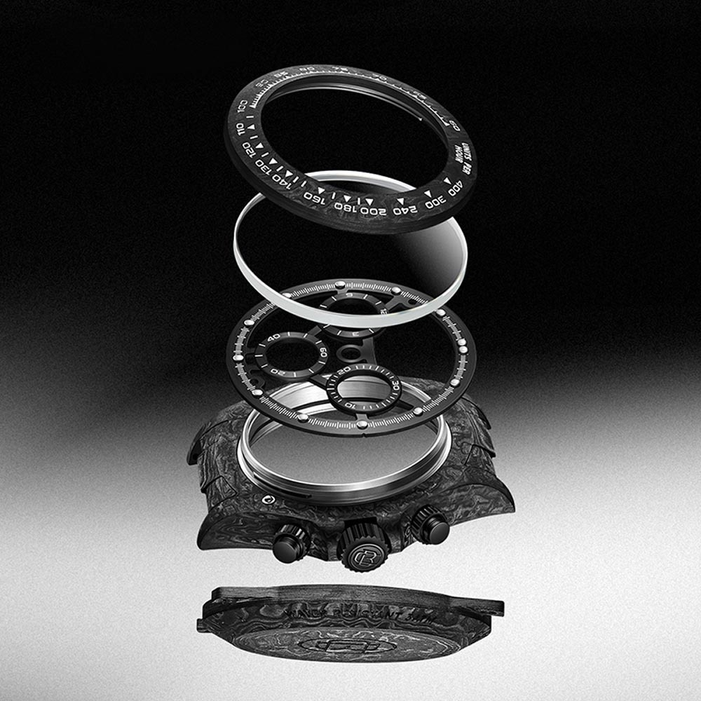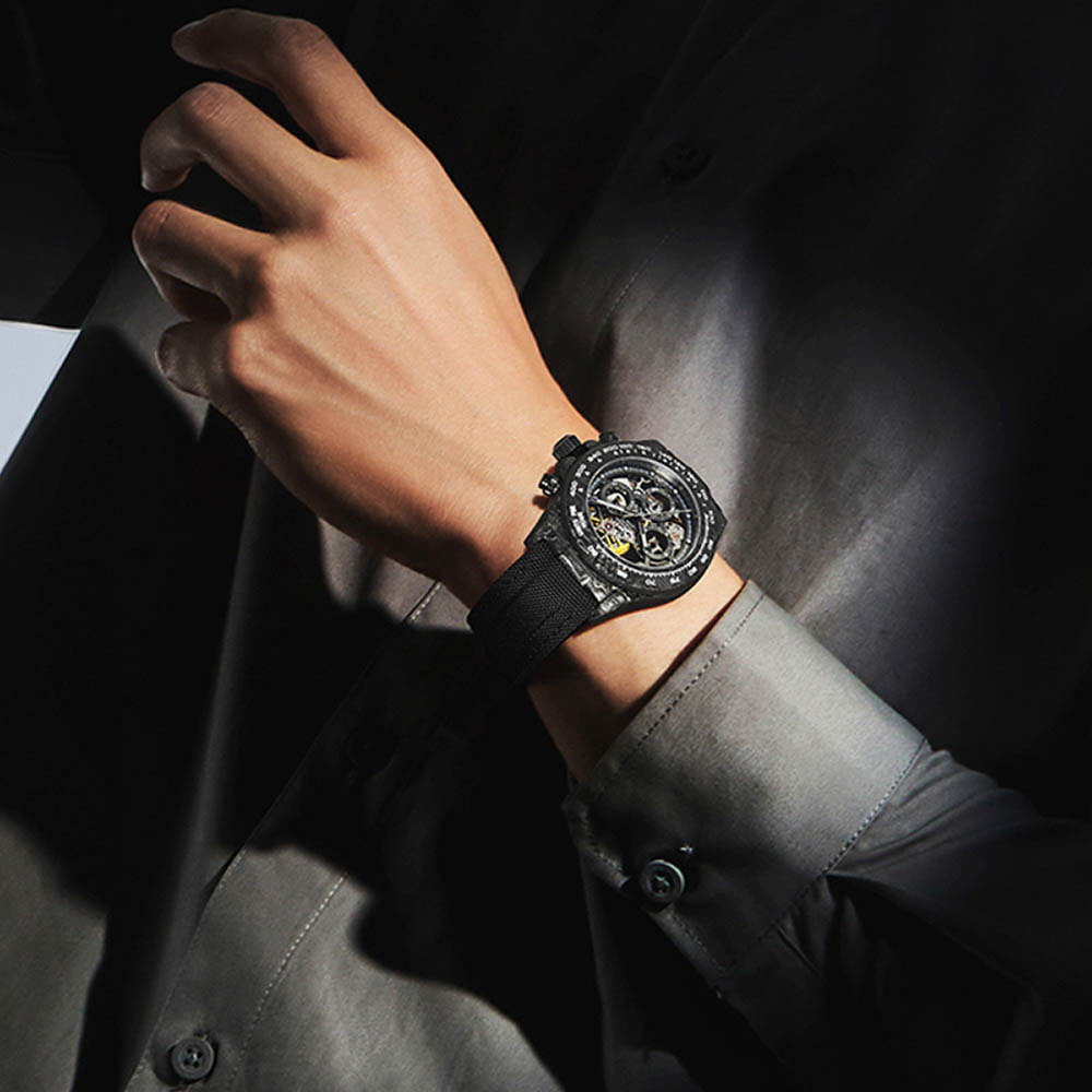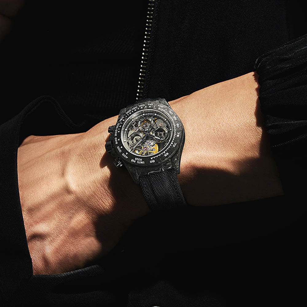 The overall case kit uses NTPT carbon fiber that has been folded and hot-pressed at 600 layers at multiple angles at 2500° high temperature and 7500N/c㎡ high pressure, and is filled with Fluor Ghost luminous material. The watch is equipped with a fully hollowed-out gun-colored dial & other details.