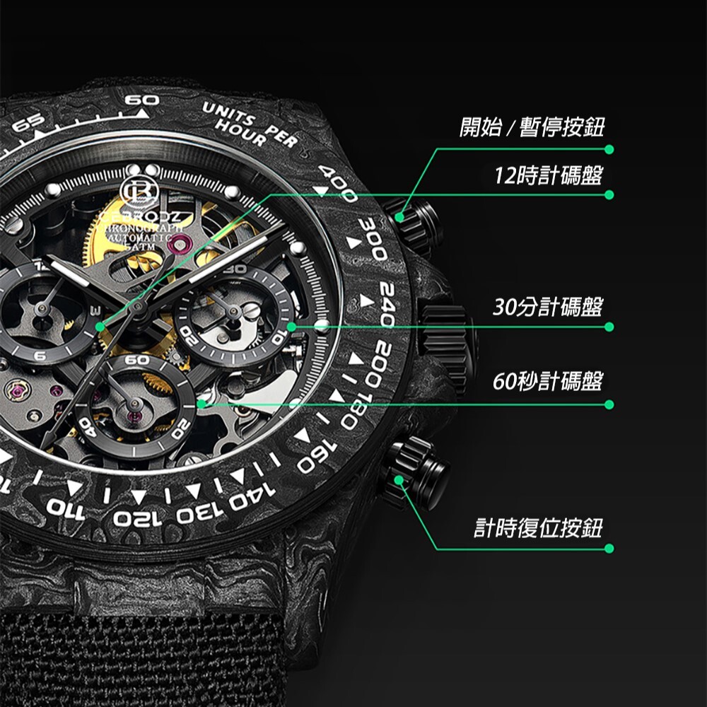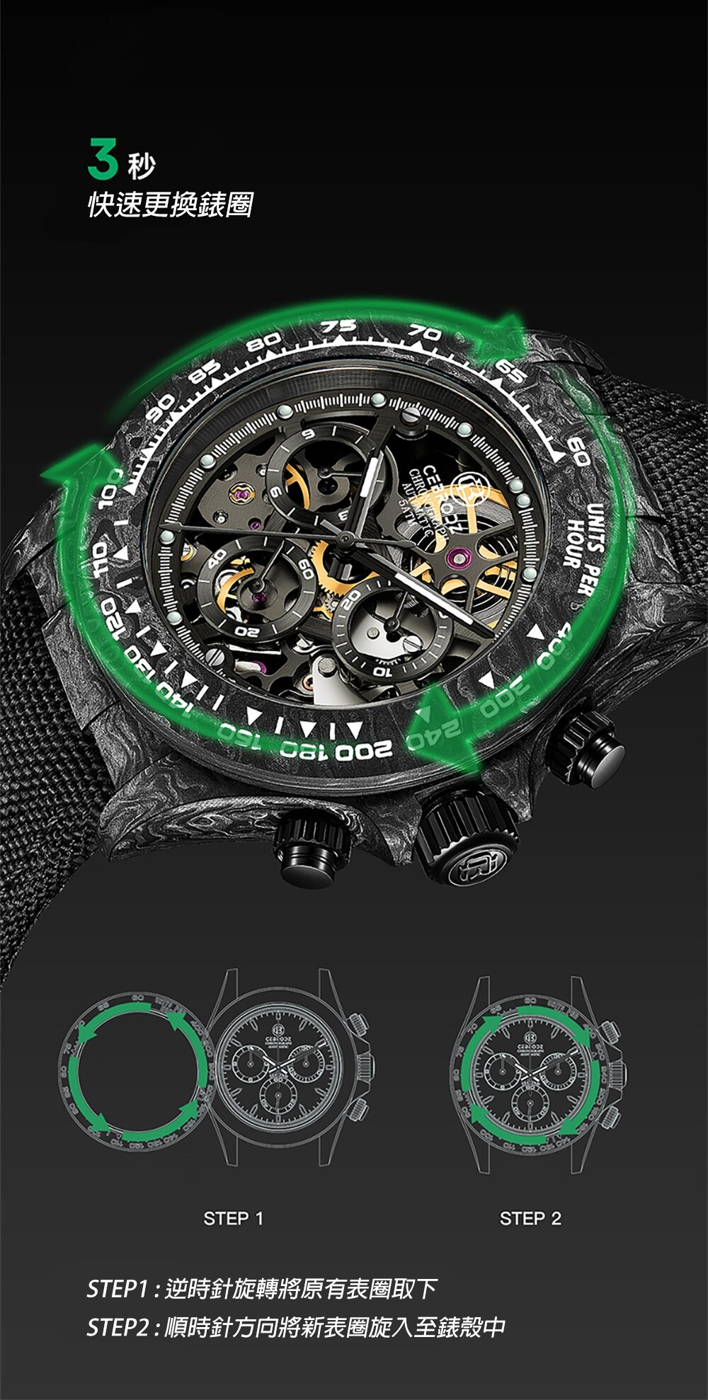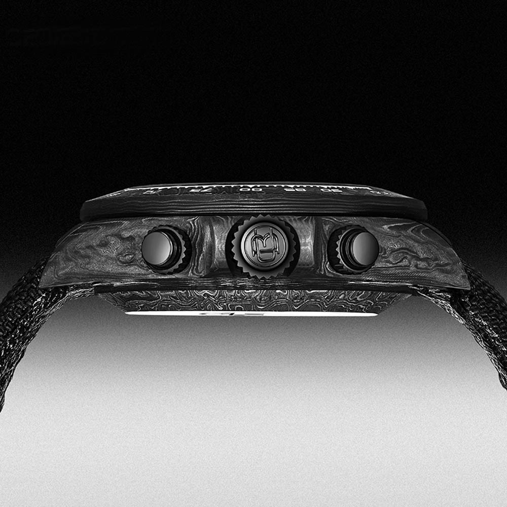 The overall case kit uses NTPT carbon fiber that has been folded and hot-pressed at 600 layers at multiple angles at 2500° high temperature and 7500N/c㎡ high pressure, and is filled with Fluor Ghost luminous material. The watch is equipped with a fully hollowed-out gun-colored dial & other details.
