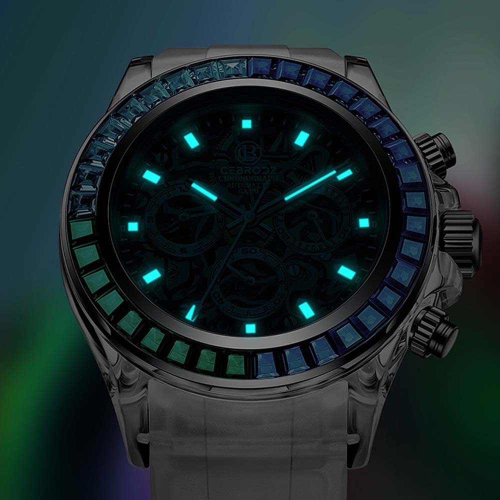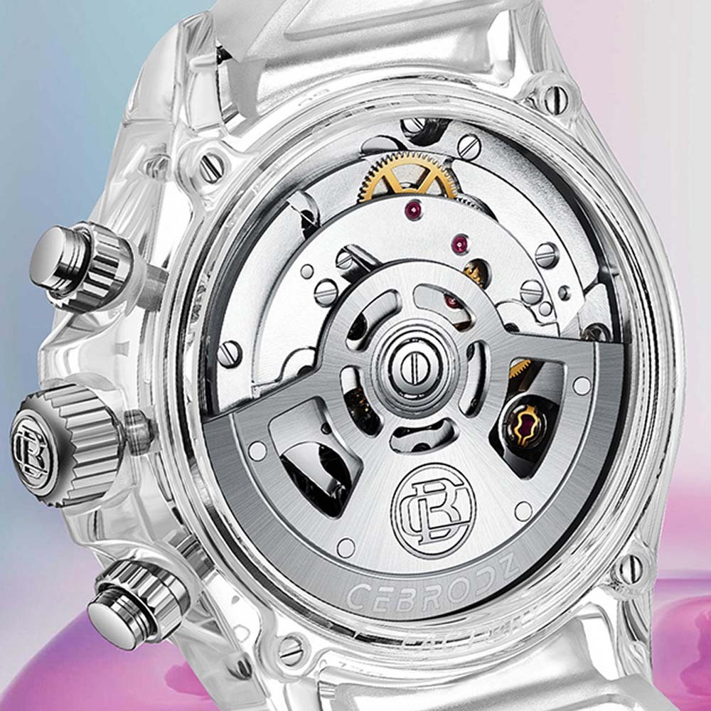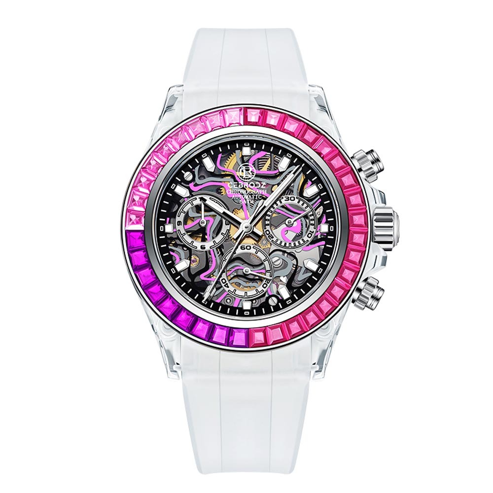 The Glistening Color by Cebrodz breaks free from traditional design boundaries with a case crafted entirely from K9 crystal glass — pure, flawless, and radiant. Finished with refined pink and purple zircons, it captures the perfect balance between modern luxury.