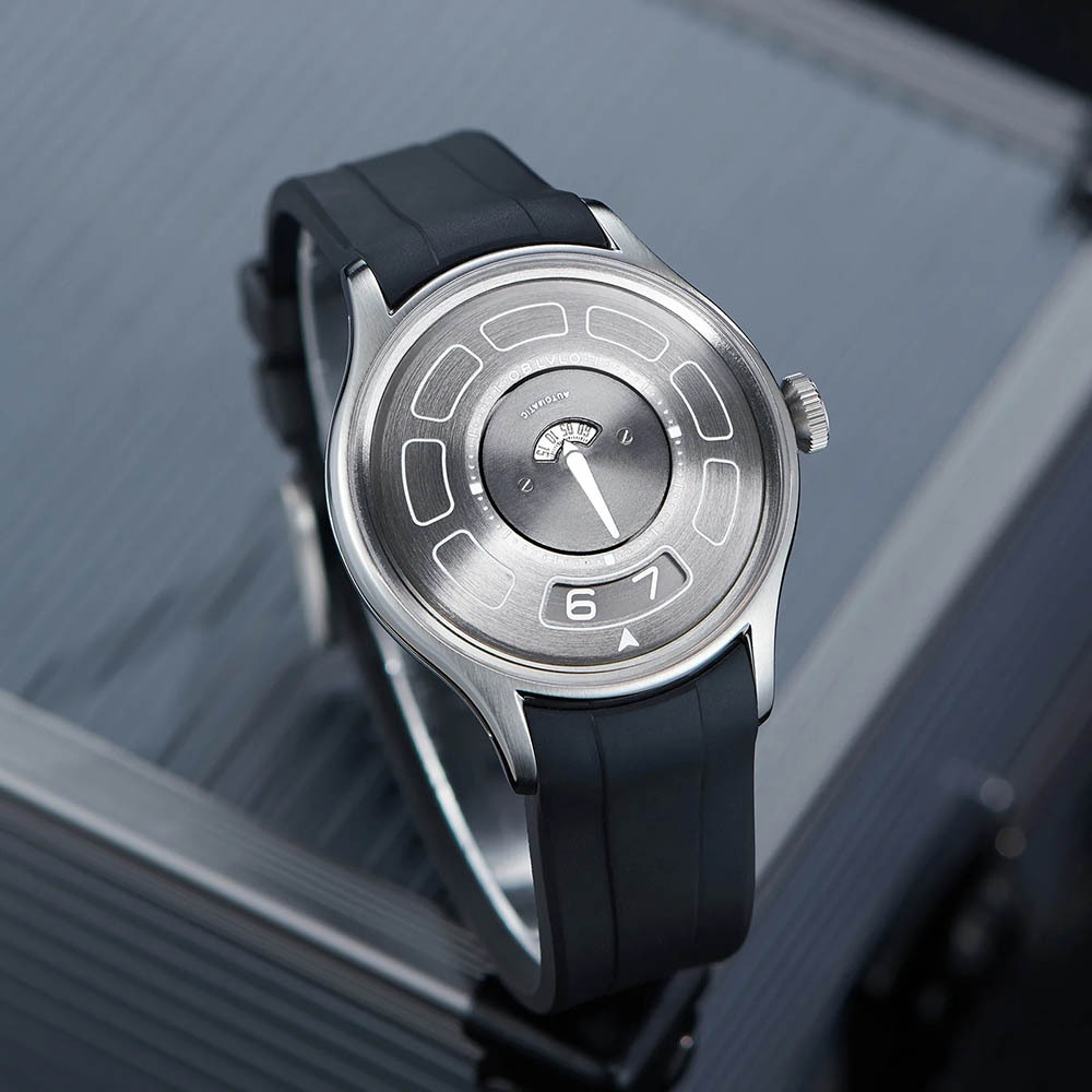 Dial Design: Black Mechanical Rotating Indices And Hands Dial, Unique UFO-inspired dial layout with innovative time display system and modern geometric elements. Sleek design with contrasting white markers creates a bold, contemporary look.