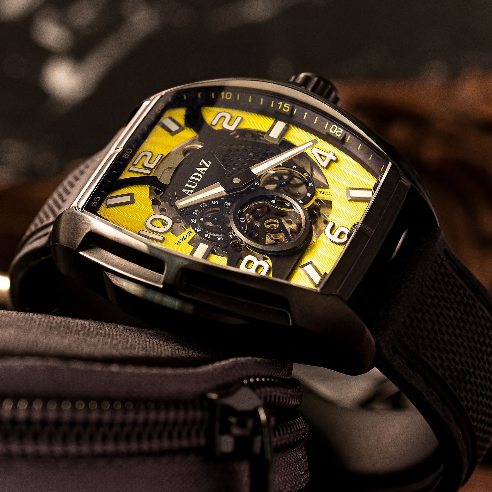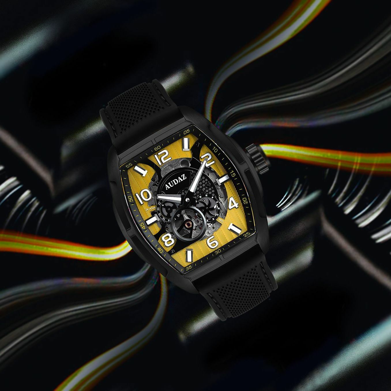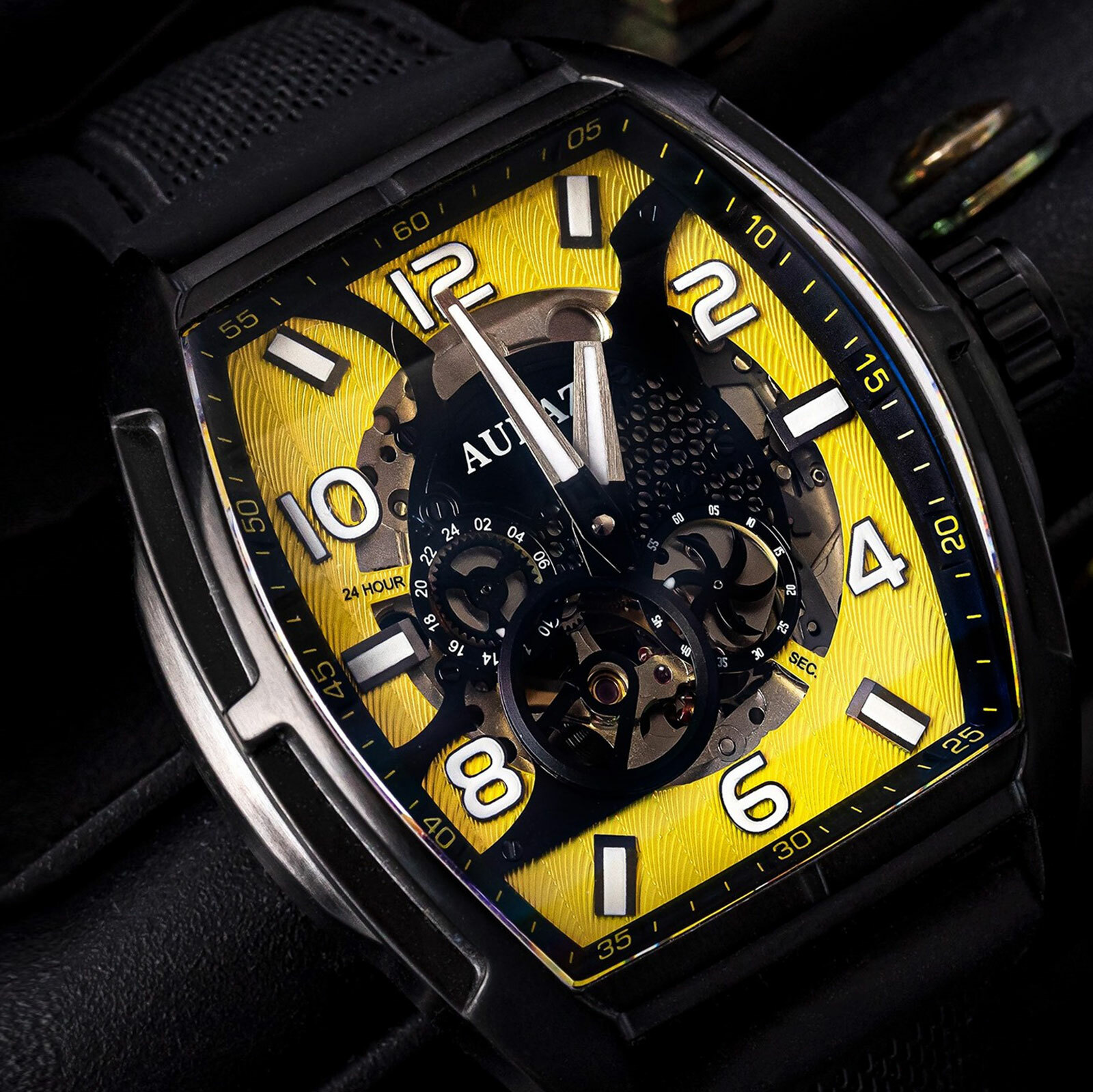 >> 經典酒桶造型錶殼跳色搭配象徵自信與外放的靚黃面盤 ,讓您舉手投足間充滿著自信與不凡 。裸空的錶面設計 ,讓您隨時可以一探機械運作的樂趣 ,適合都會中追求著外放彰顯 ,自由不拘的潮流男女。