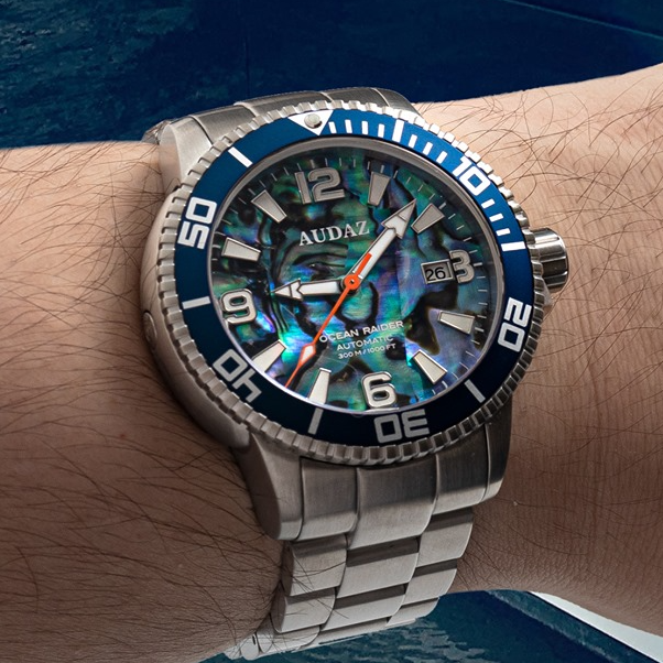 針對熱愛海洋及深潛的朋友所特別引進的這款Ocean Raider潛水錶,一眼望去其極為特殊的面盤是最為醒目的焦點,難得一見以天然鮑魚貝殼上的斑斕紋理,隨著光線反射角度的不同,閃爍著波光粼粼的耀眼,呈現深海悠游時的暢快體驗。除了面盤上明顯的海洋元素,Ocean Raider還擁有強悍的300米防水能力,並配有專業潛水錶必備的排氦閥設計,提供飽合潛水時最安心的保障。底蓋鐫刻著鯊魚圖騰,絕對是深海探險時的最速配之選!