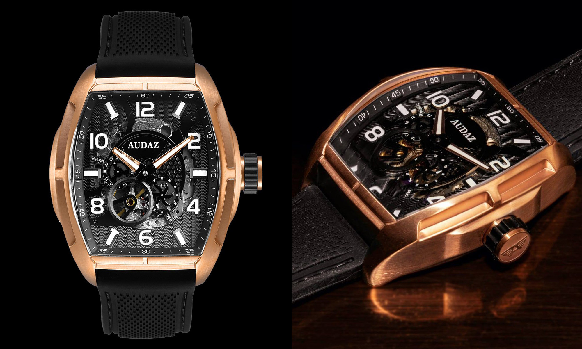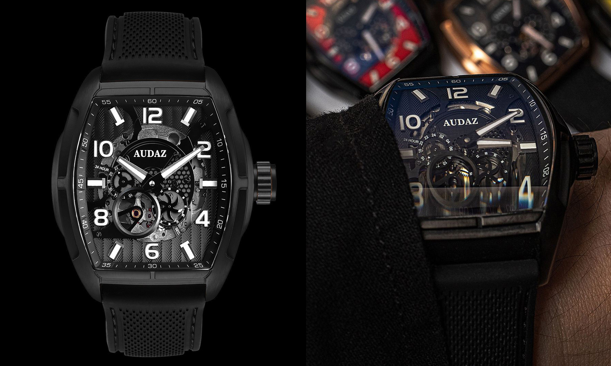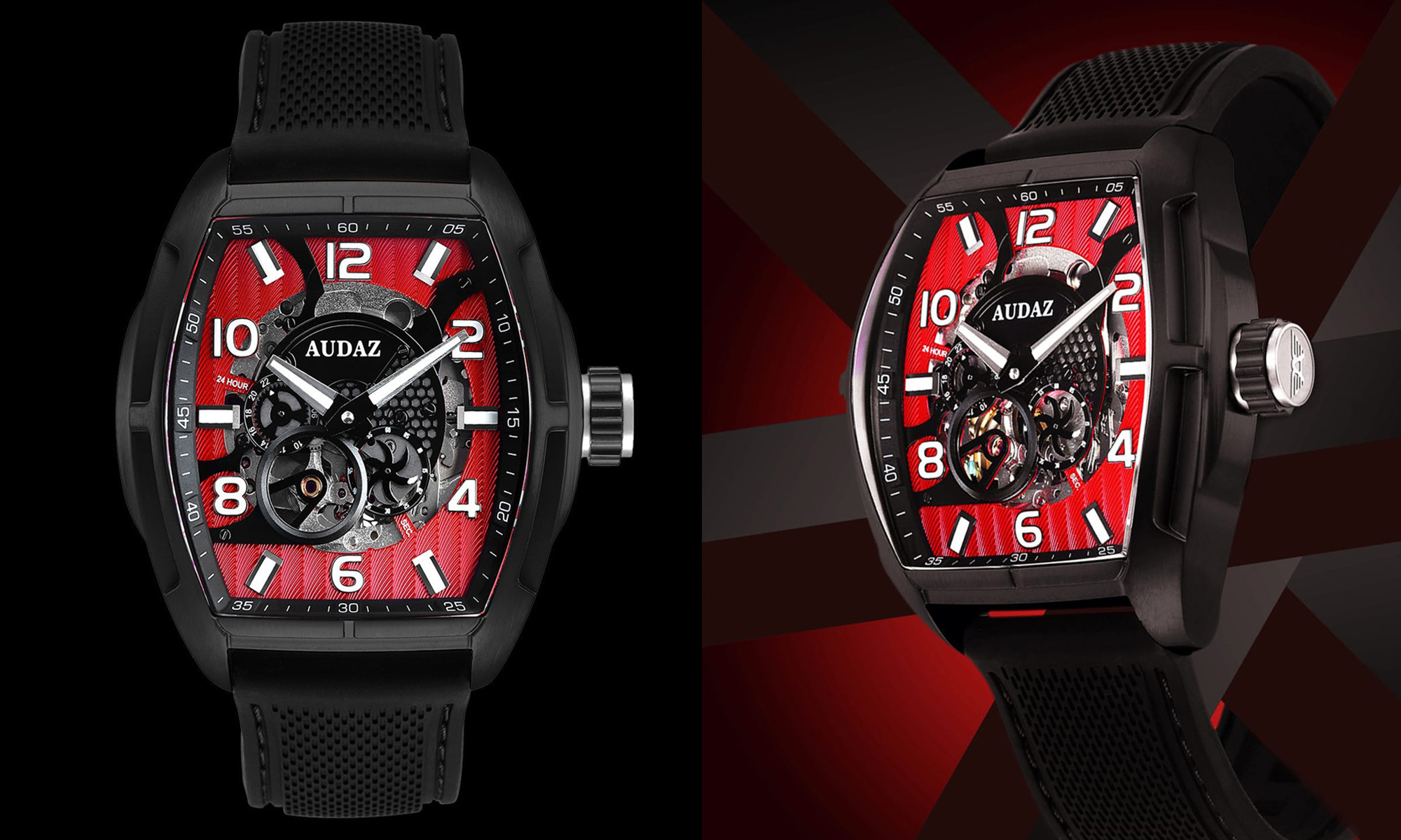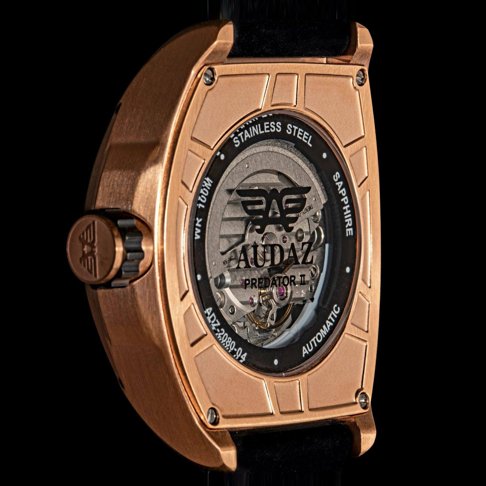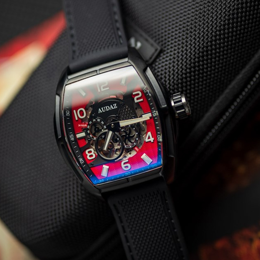 除了潛水錶外,Audaz Watches還包括一款酒桶形錶殼的【Predator II 戰神】運動錶款以滿足喜愛追求與眾不同的錶迷。酒桶形錶殼一般都以古典錶款之姿呈現,但近年來不少品牌將酒桶造型改良,以大膽粗獷的線條紋理,搖身一變成為獨樹一格的運動休閒錶款。