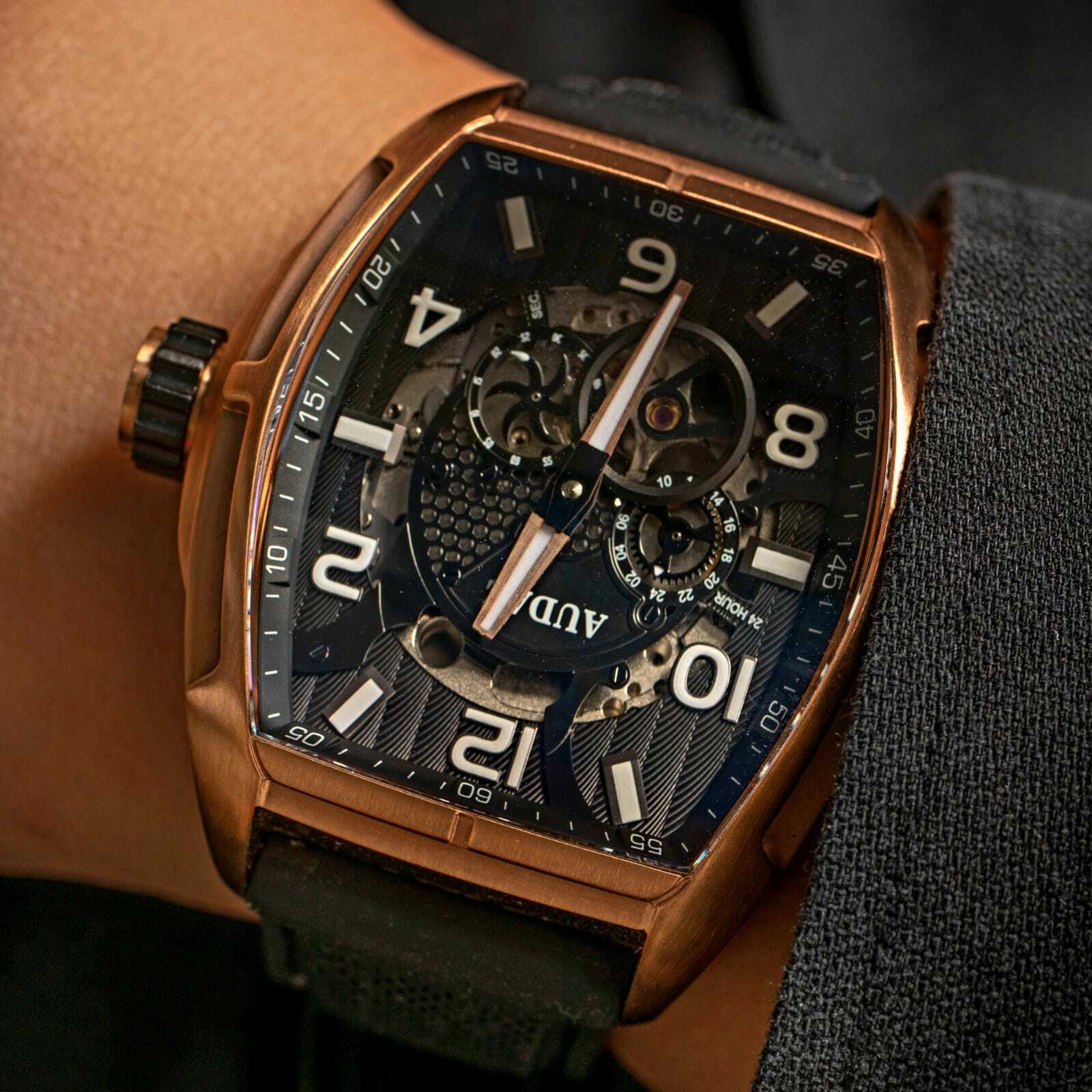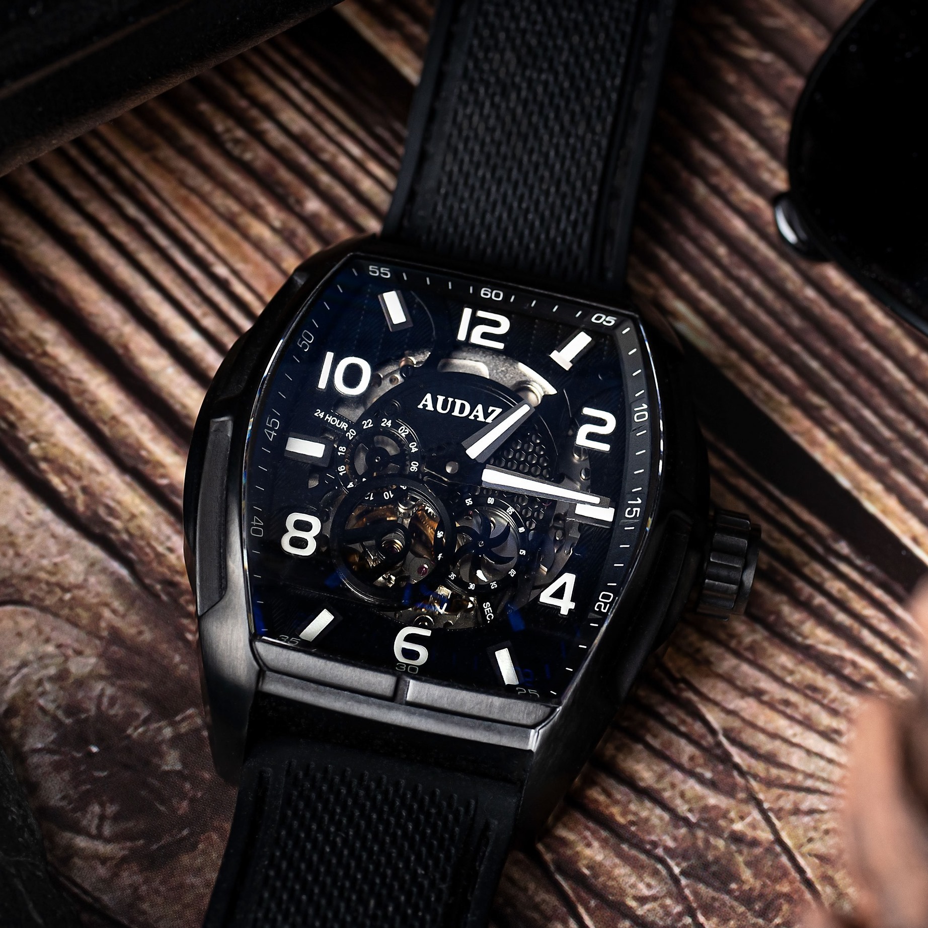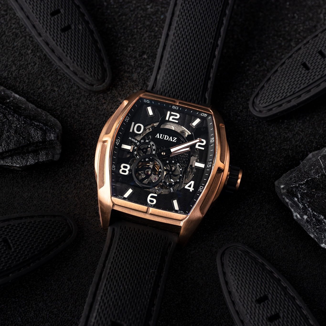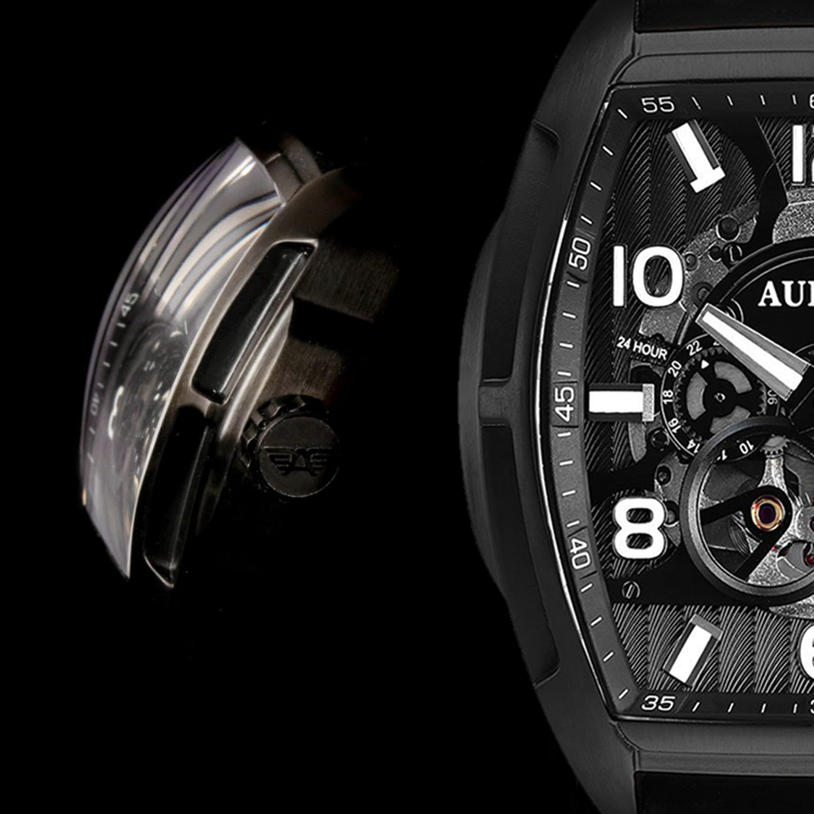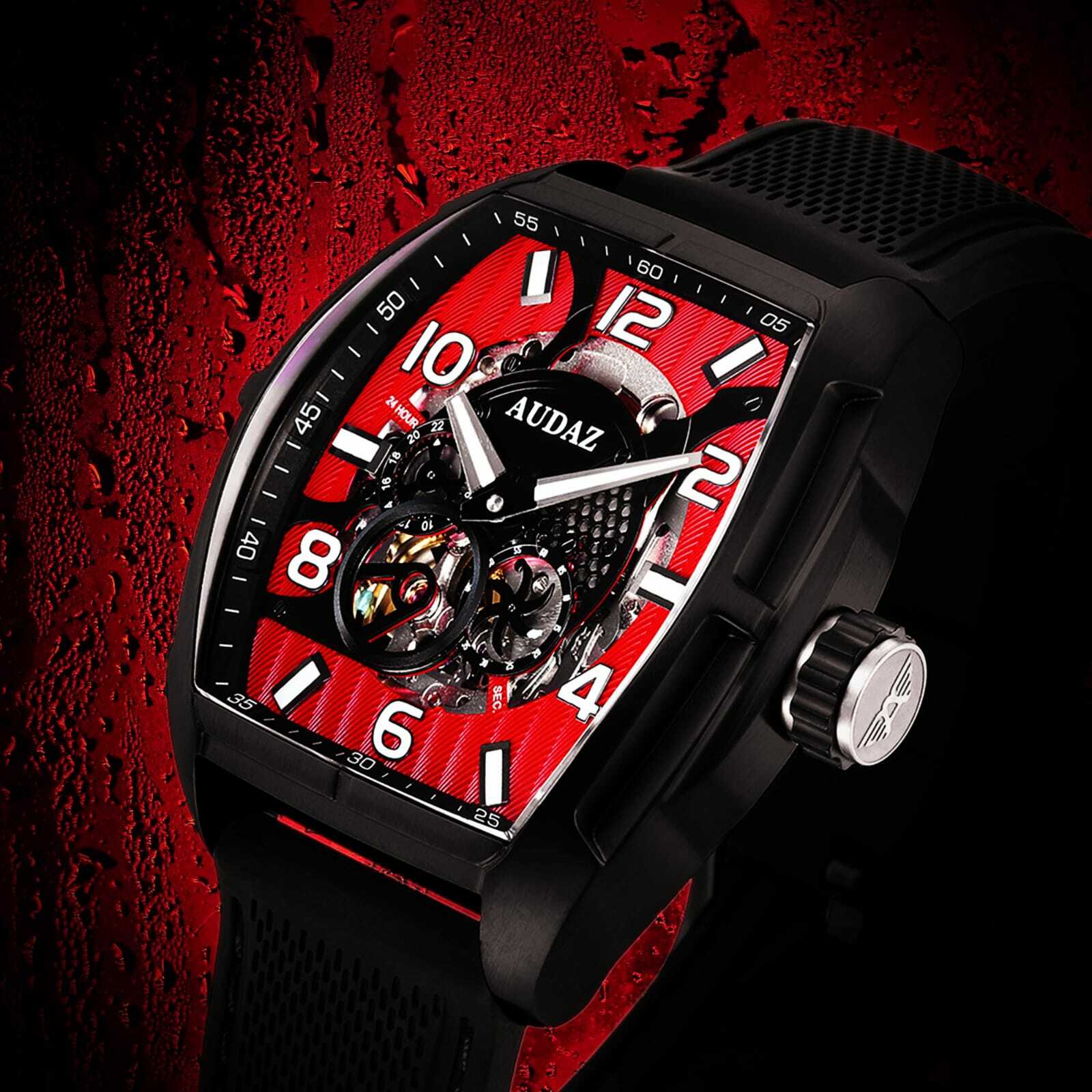 除了潛水錶外,Audaz Watches還包括一款酒桶形錶殼的【Predator II 戰神】運動錶款以滿足喜愛追求與眾不同的錶迷。酒桶形錶殼一般都以古典錶款之姿呈現,但近年來不少品牌將酒桶造型改良,以大膽粗獷的線條紋理,搖身一變成為獨樹一格的運動休閒錶款。