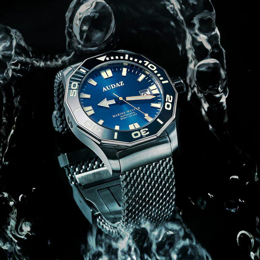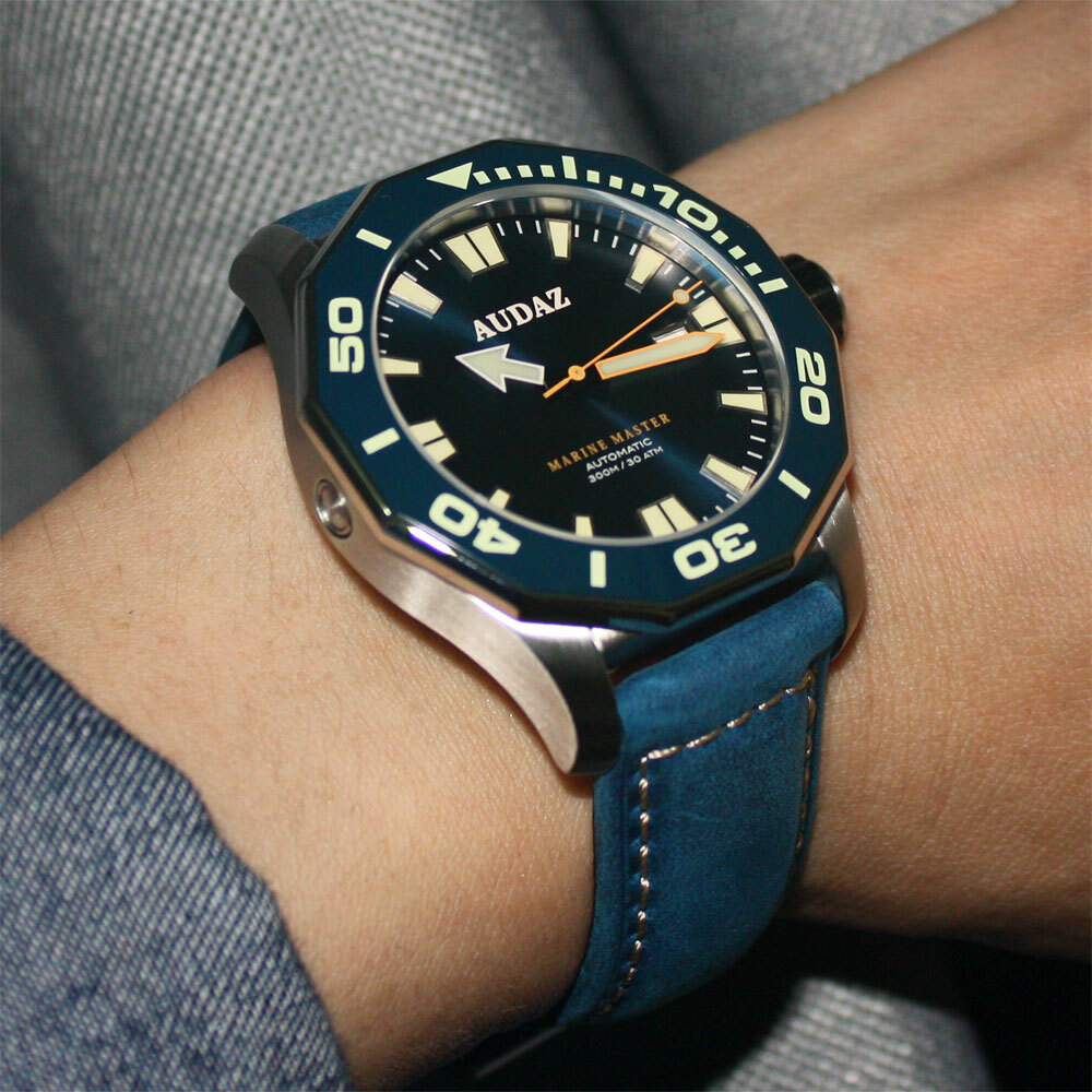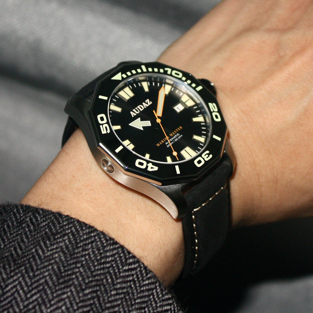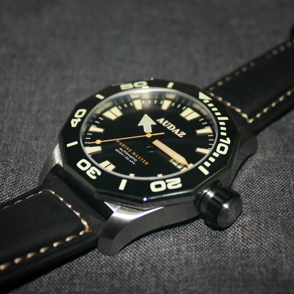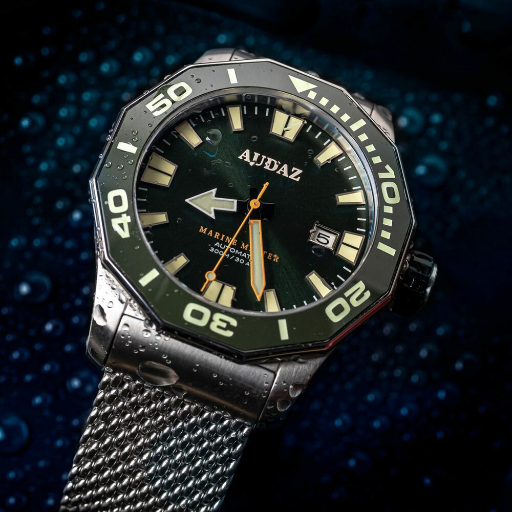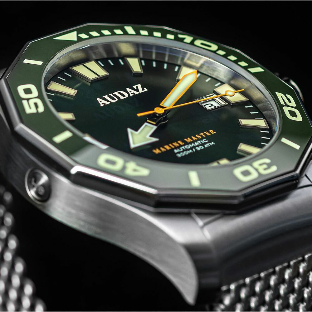 AUDAZ【Marine Master 遠洋大師】300米專業潛水系列 ,以少見的12邊形計時圈元素,賦予潛水錶與眾不同的簡約風範。獨特的12邊形計時圈設計不僅讓轉動時容易抓握,150度內角也帶出最輕鬆的旋轉力矩;此外12邊形與潛水時慣用的5分鐘單位刻度完美契合,更是方便潛水者輕鬆對齊刻度指標。