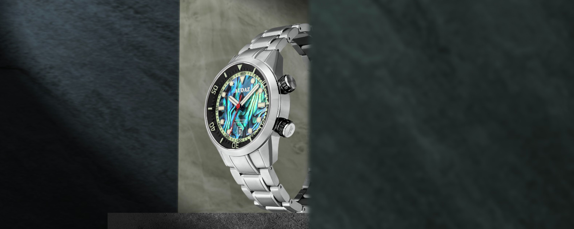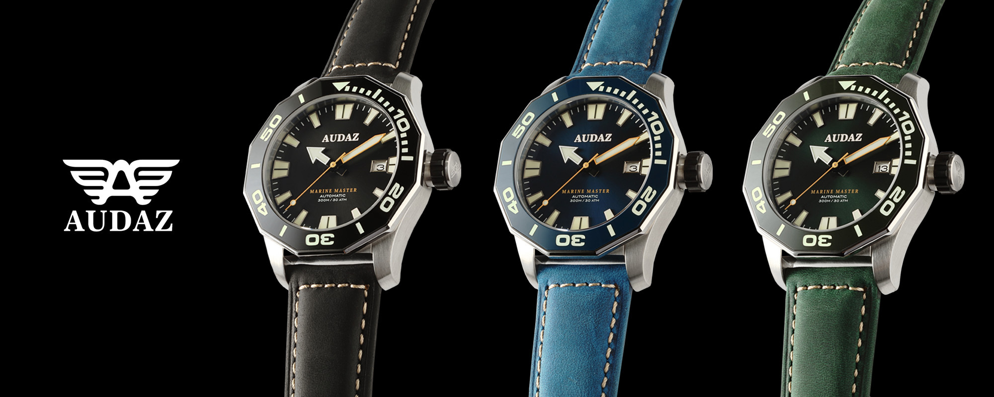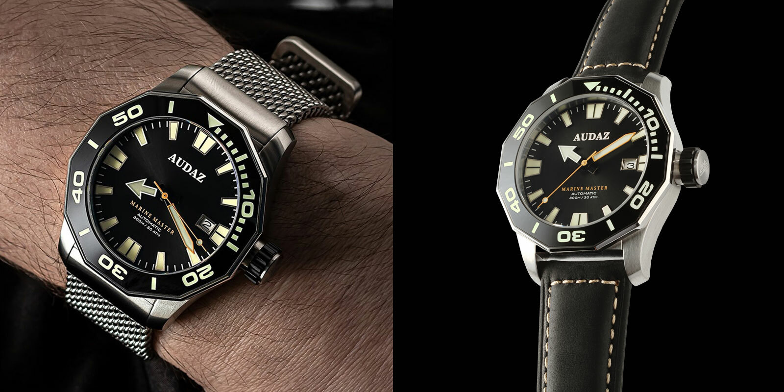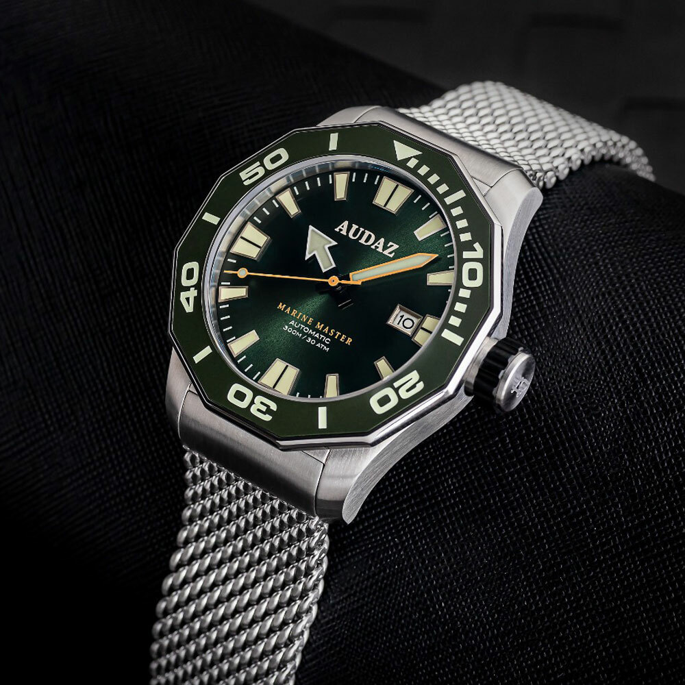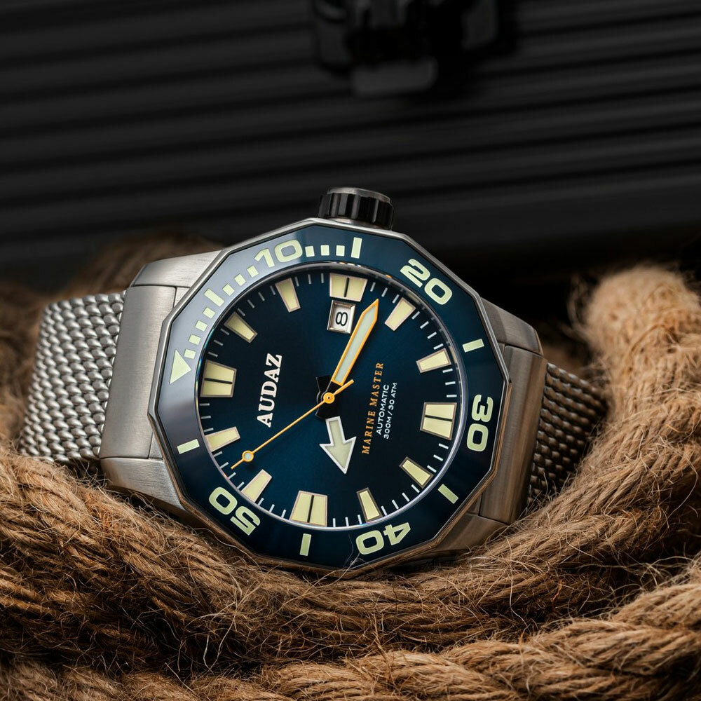 AUDAZ【Marine Master 遠洋大師】300米專業潛水系列 ,以少見的12邊形計時圈元素,賦予潛水錶與眾不同的簡約風範。獨特的12邊形計時圈設計不僅讓轉動時容易抓握,150度內角也帶出最輕鬆的旋轉力矩;此外12邊形與潛水時慣用的5分鐘單位刻度完美契合,更是方便潛水者輕鬆對齊刻度指標。