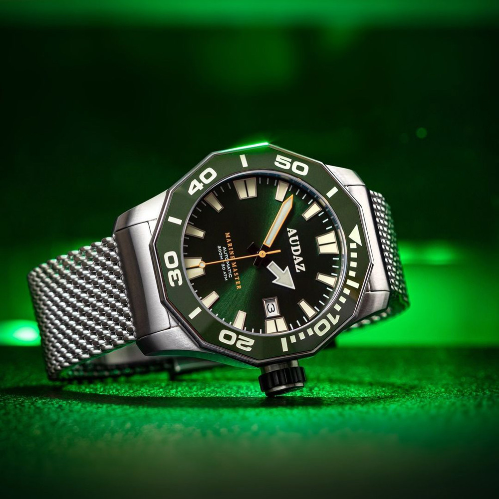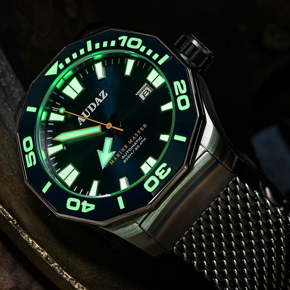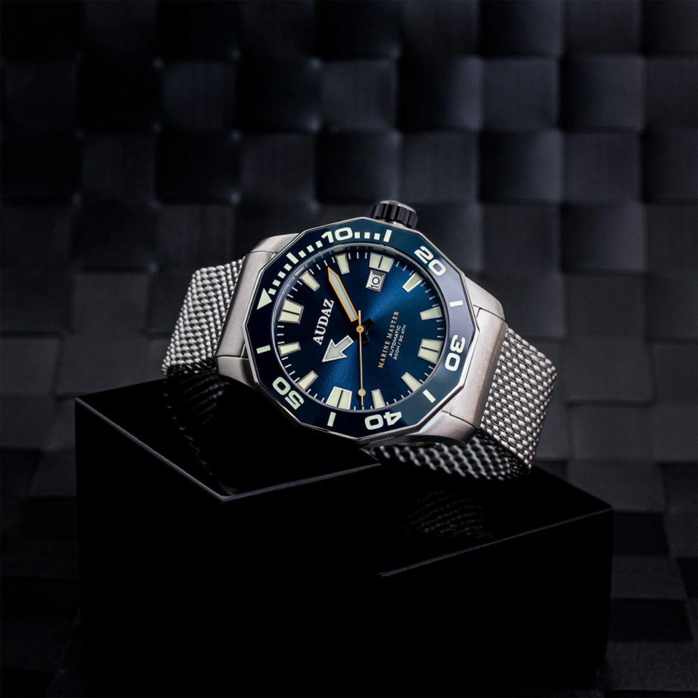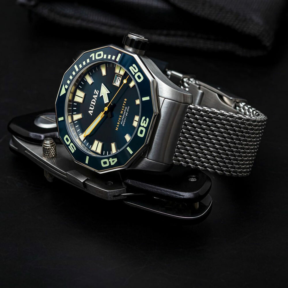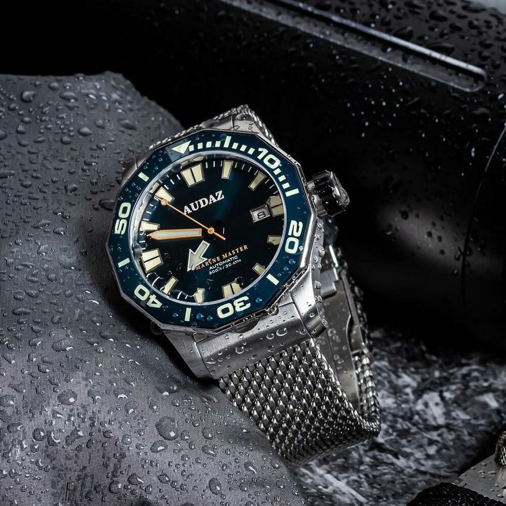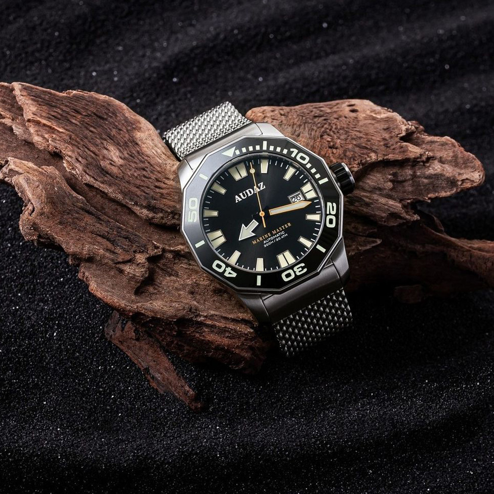 AUDAZ【Marine Master 遠洋大師】300米專業潛水系列 ,以少見的12邊形計時圈元素,賦予潛水錶與眾不同的簡約風範。獨特的12邊形計時圈設計不僅讓轉動時容易抓握,150度內角也帶出最輕鬆的旋轉力矩;此外12邊形與潛水時慣用的5分鐘單位刻度完美契合,更是方便潛水者輕鬆對齊刻度指標。