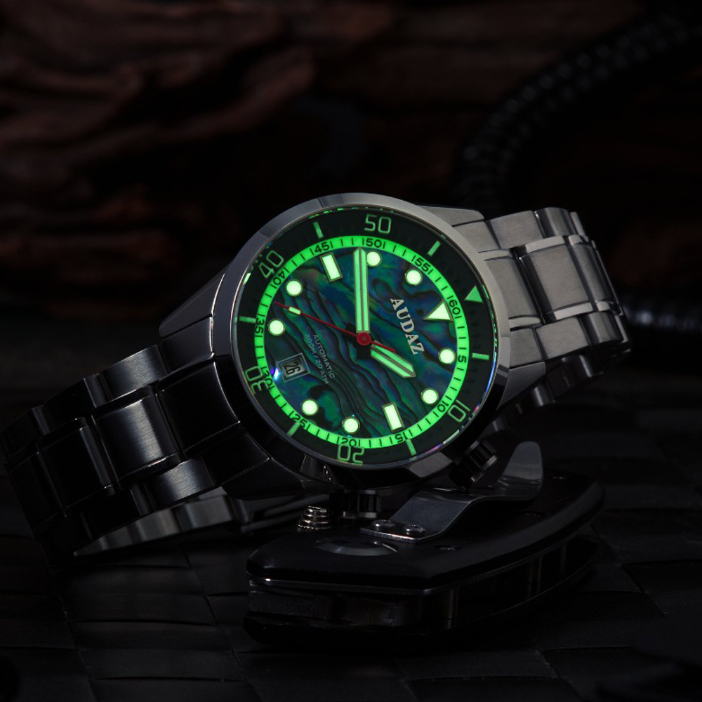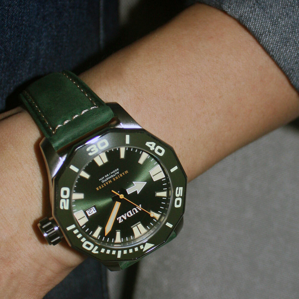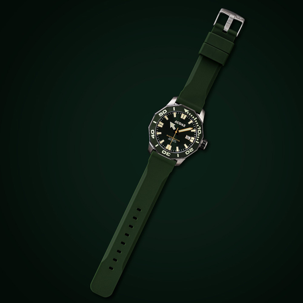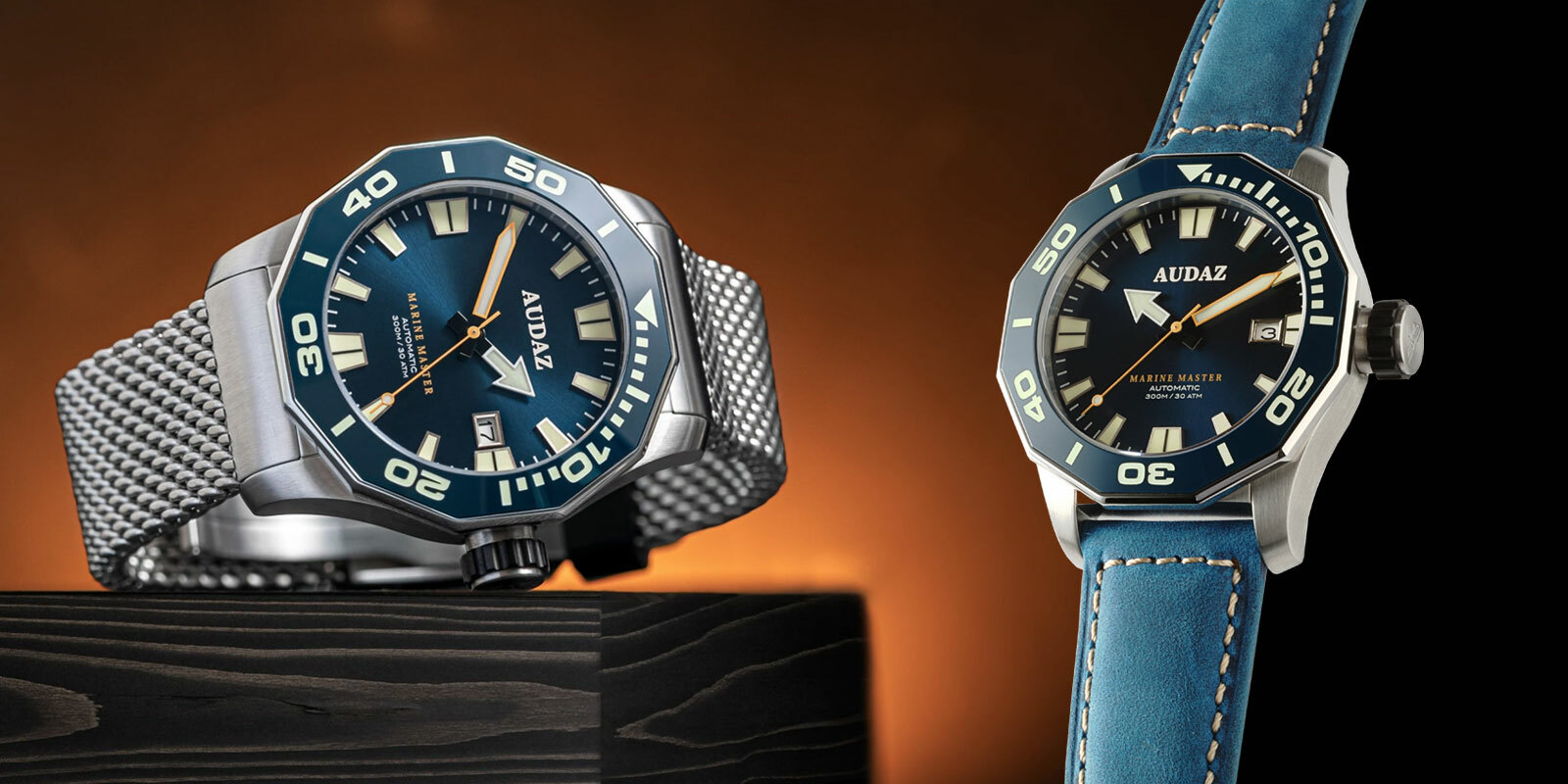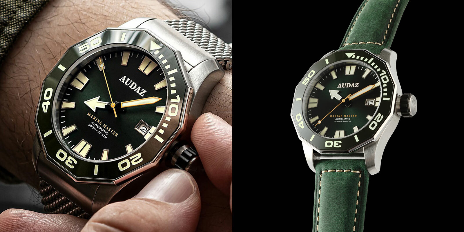 AUDAZ【Marine Master 遠洋大師】300米專業潛水系列 ,以少見的12邊形計時圈元素,賦予潛水錶與眾不同的簡約風範。獨特的12邊形計時圈設計不僅讓轉動時容易抓握,150度內角也帶出最輕鬆的旋轉力矩;此外12邊形與潛水時慣用的5分鐘單位刻度完美契合,更是方便潛水者輕鬆對齊刻度指標。