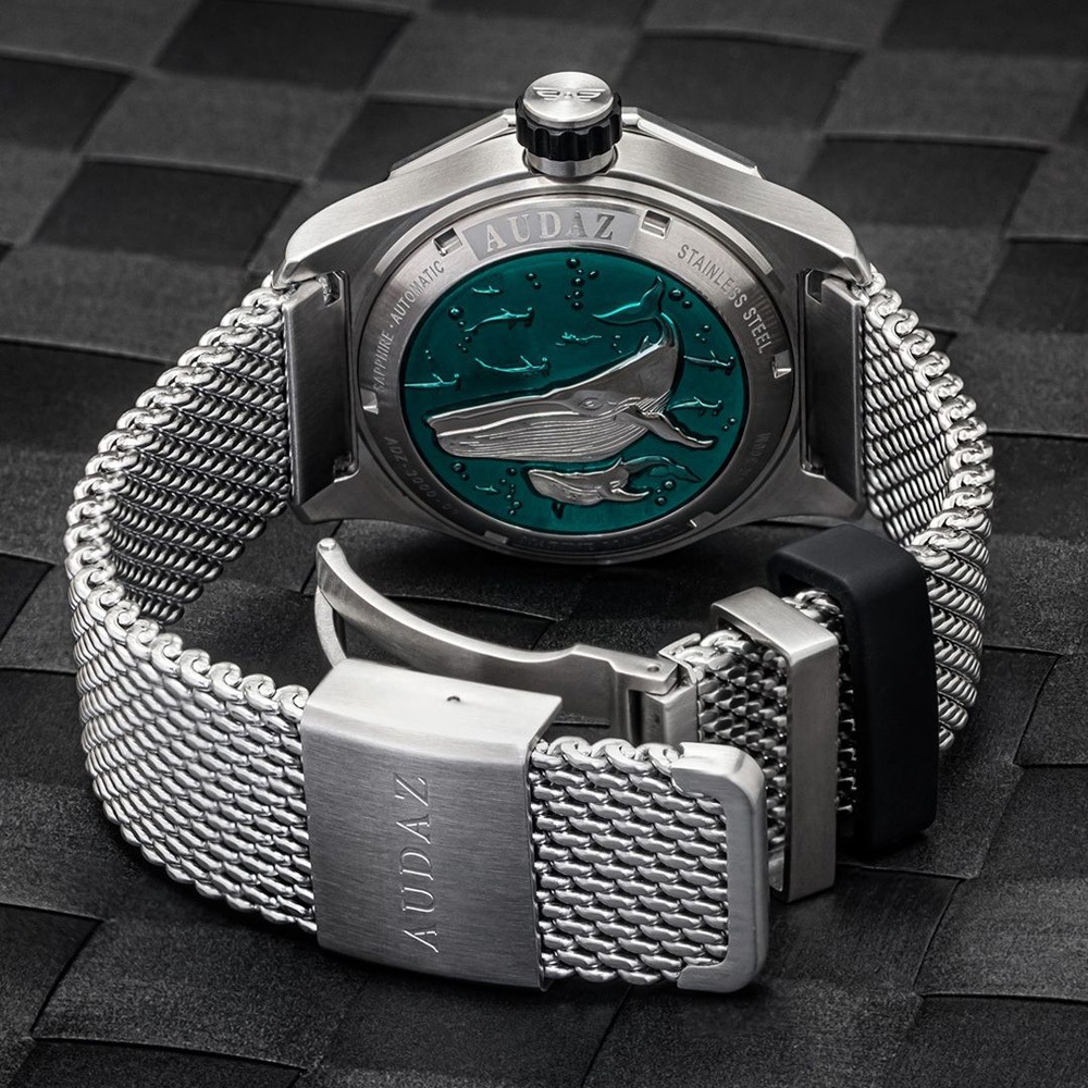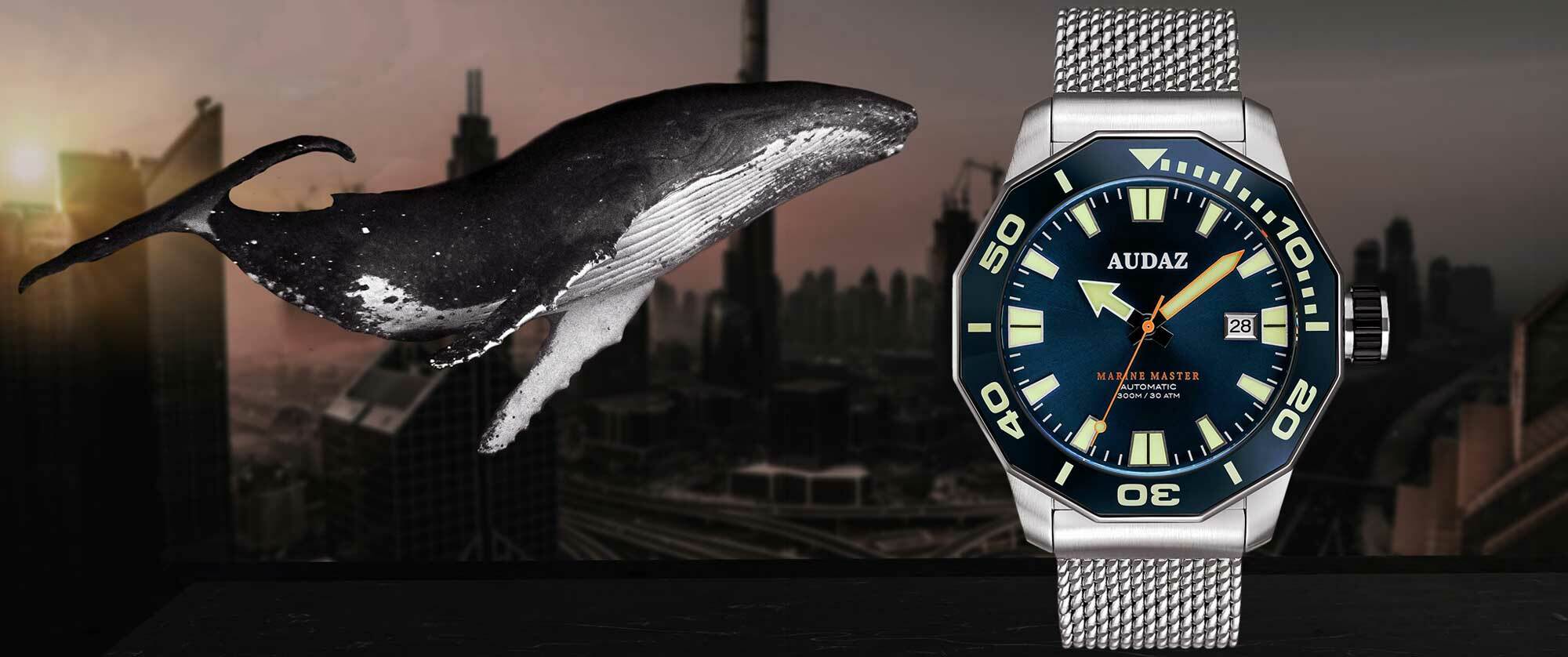 【Marine Master 遠洋大師】全系列腕錶底蓋鐫刻了從蔚藍海洋中飛躍而出的座頭鯨,壯觀的景象呼應 AUDAZ Watches 專業的潛水製錶實力。