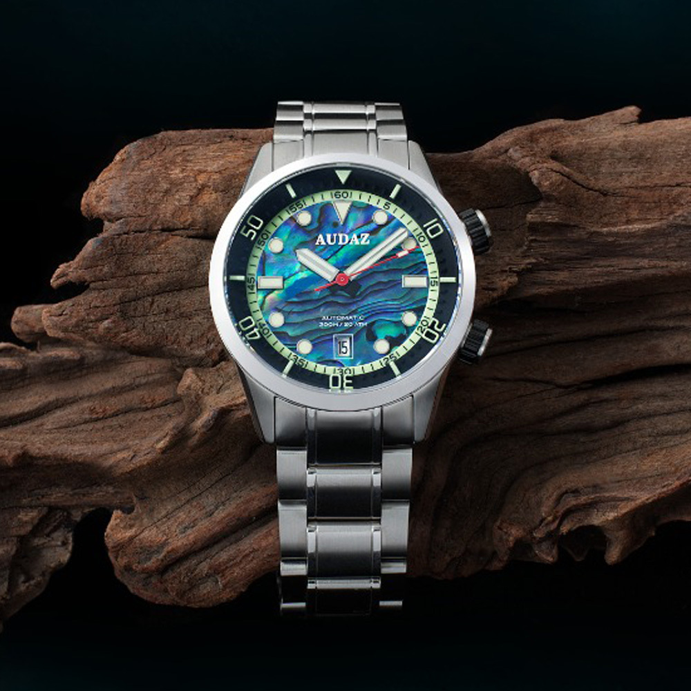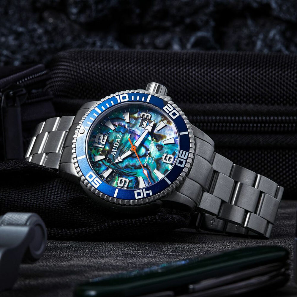 針對熱愛海洋及深潛的朋友所特別引進的這款Ocean Raider潛水錶,一眼望去其極為特殊的面盤是最為醒目的焦點,難得一見以天然鮑魚貝殼上的斑斕紋理,隨著光線反射角度的不同,閃爍著波光粼粼的耀眼,呈現深海悠游時的暢快體驗。除了面盤上明顯的海洋元素,Ocean Raider還擁有強悍的300米防水能力,並配有專業潛水錶必備的排氦閥設計,提供飽合潛水時最安心的保障。底蓋鐫刻著鯊魚圖騰,絕對是深海探險時的最速配之選!