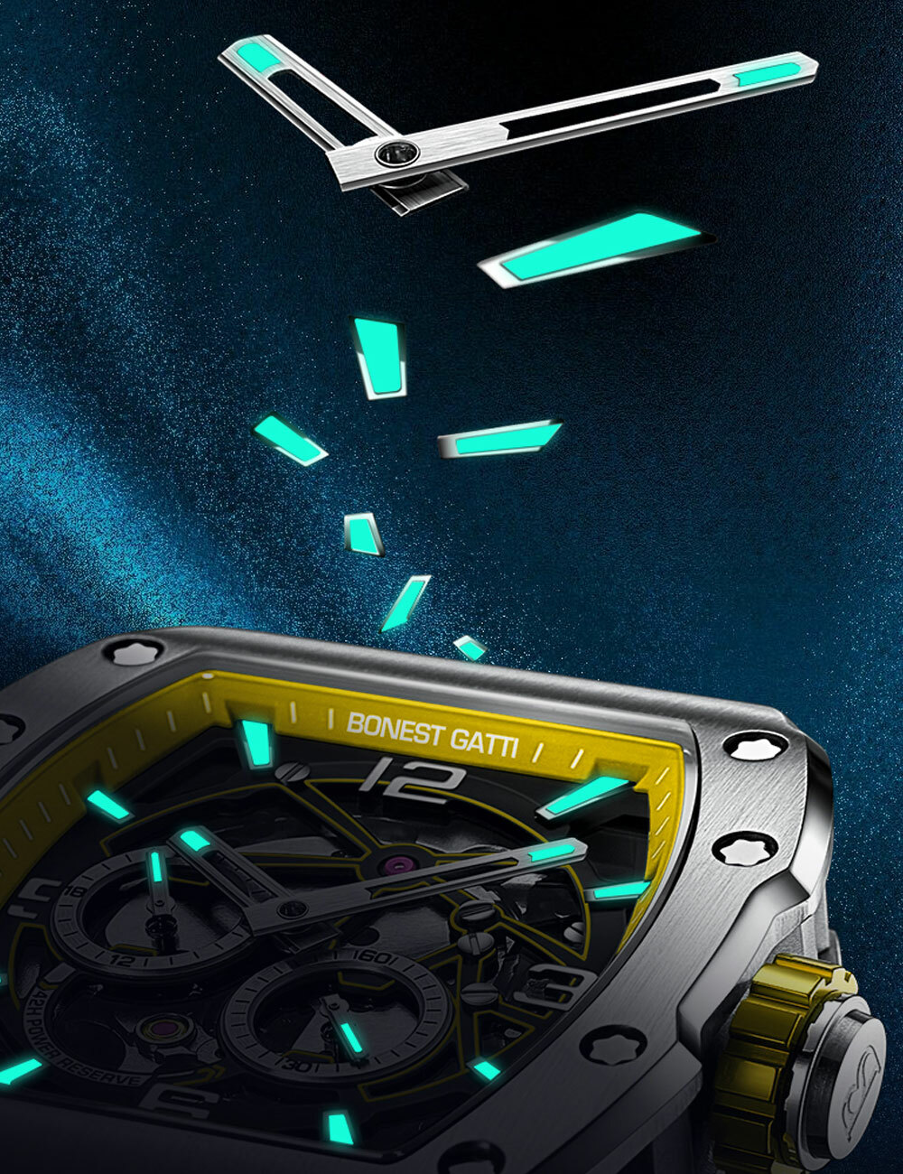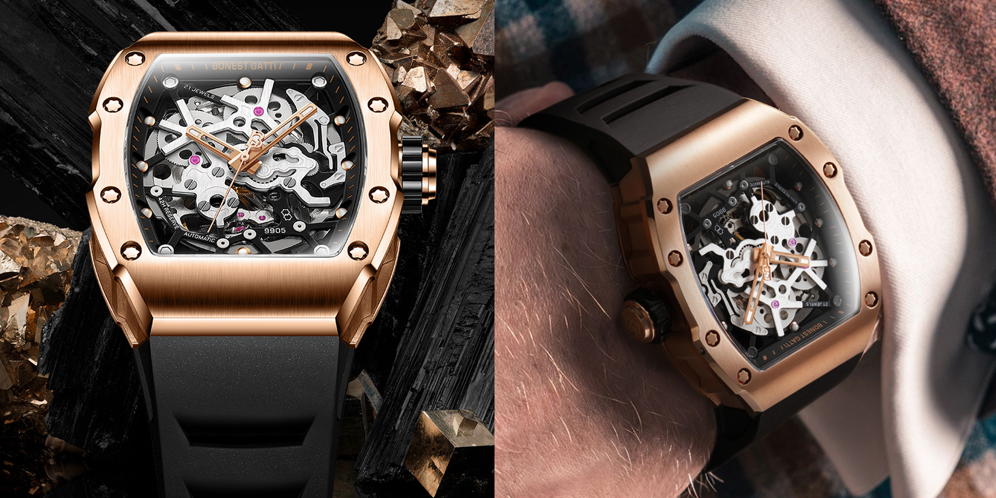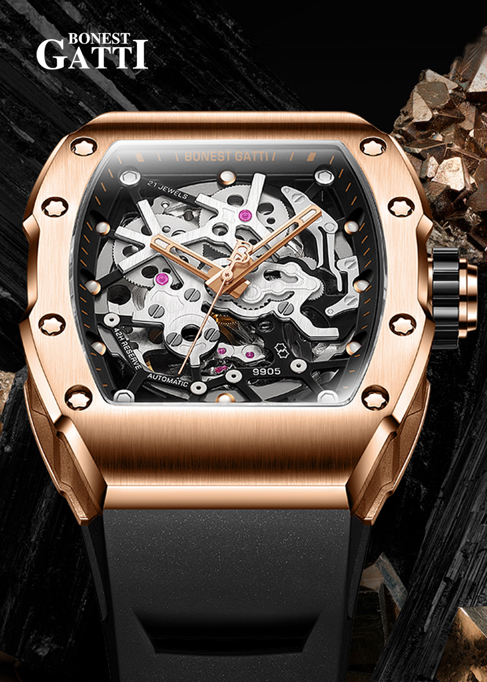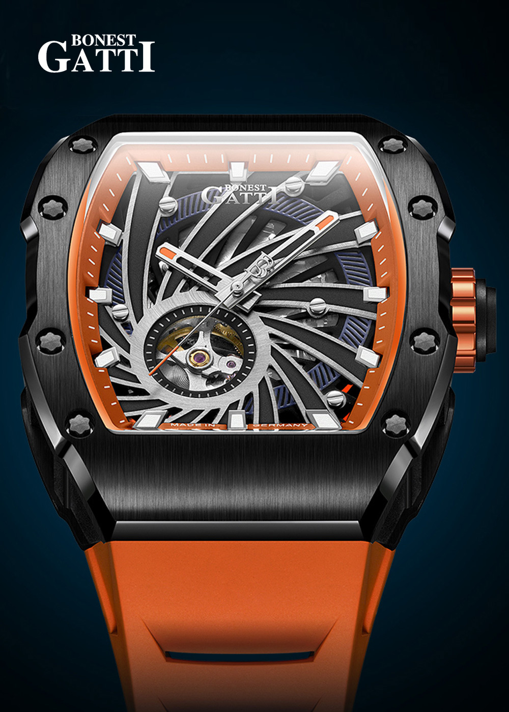 基於對傳統機械結構的熱愛,【BONEST GATTI】全系列錶款皆採用機械機芯,為了彰顯與眾不同的品味,【BONEST GATTI】每款腕錶都以混搭撞色與多層次結構設計,讓材質配色與機械結構之間能夠巧妙展現潮流與動感,滿足時下使用者求新求變的多元需求!