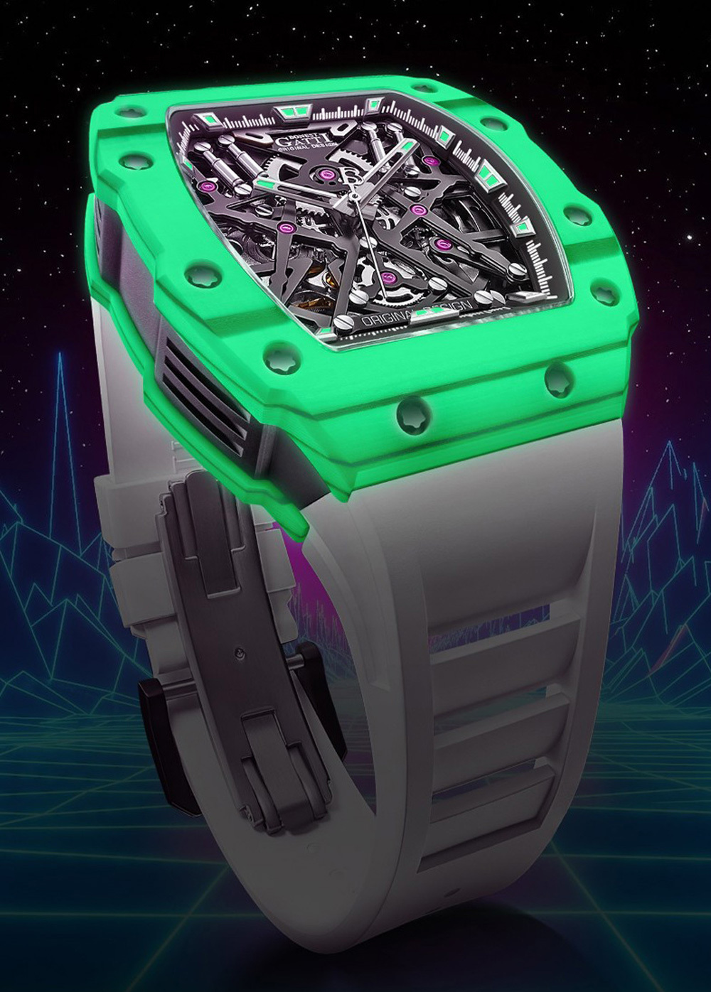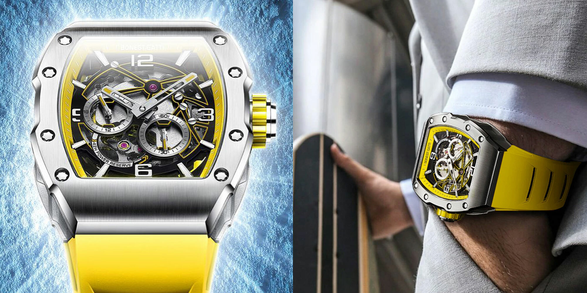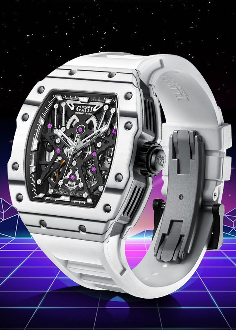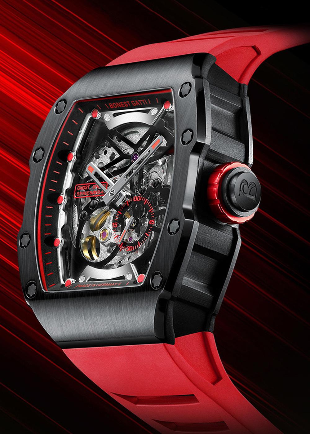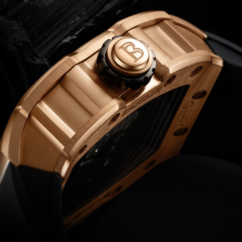 BONEST GATTI】 以新潮立體大膽的風格,來打造魅影系列的酒桶形外觀,其中最吸睛的莫過於錶殼兩側垂直的勾槽紋路,取材超跑的流線工藝,而氟化橡膠錶帶輕盈服貼的特性,更是展現超跑向來追求輕量化與高速貼背感的舒適