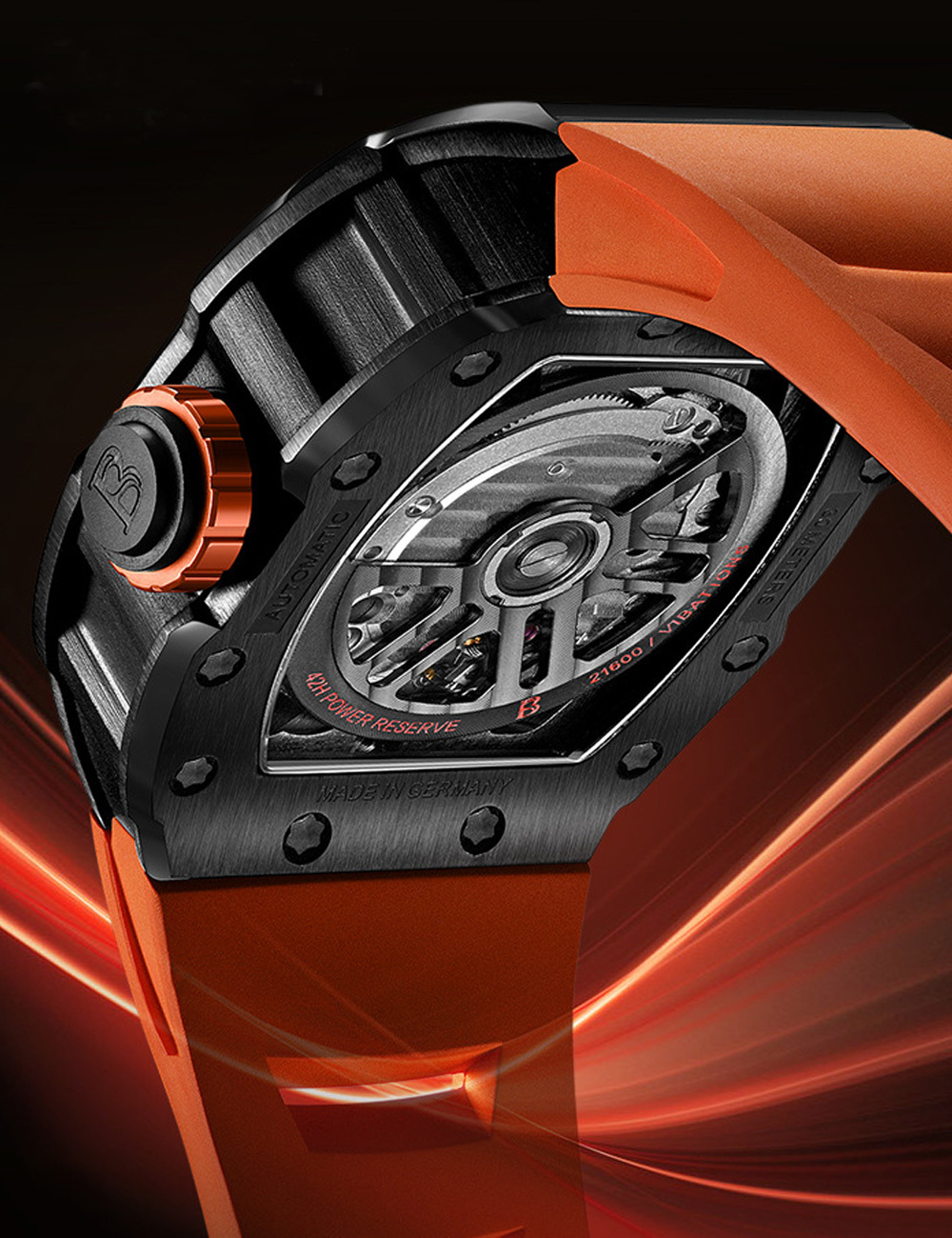 寶加地旗艦系列【碳纖魅影】延續獨樹一幟的酒桶形錶殼,整體的視覺效果以賽車引擎為設計靈感來源,錶殼就如堅固的引擎本體,鏤空面盤則呈現引擎內部汽缸等細節,彷彿為腕間注入源源不絕的動力。錶殼兩側垂直的勾槽紋路,取材超跑的流線工藝,而氟化橡膠錶帶輕盈服貼的特性,更是展現超跑向來追求輕量化與高速貼背感的舒適性。