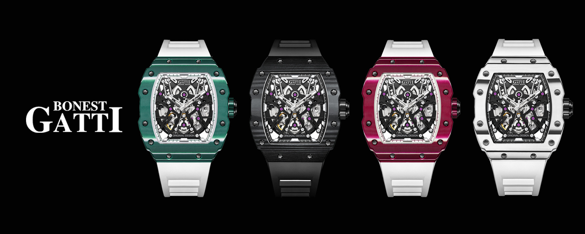 基於對傳統機械結構的熱愛,BONEST GATTI】全系列錶款皆採用機械機芯,為了彰顯與眾不同的品味,BONEST GATTI】每款腕錶都以混搭撞色與多層次結構設計,讓材質配色與機械結構之間能夠巧妙展現潮流與動感,滿足時下使用者求新求變的多元需求!