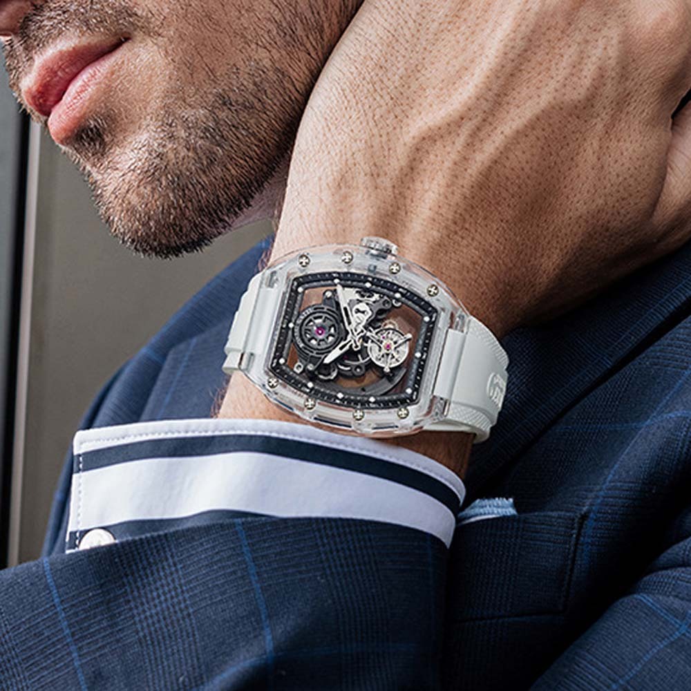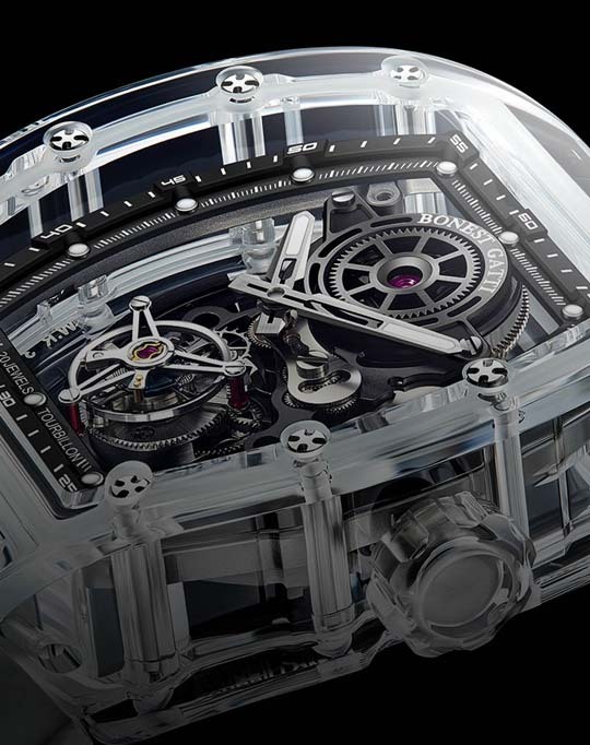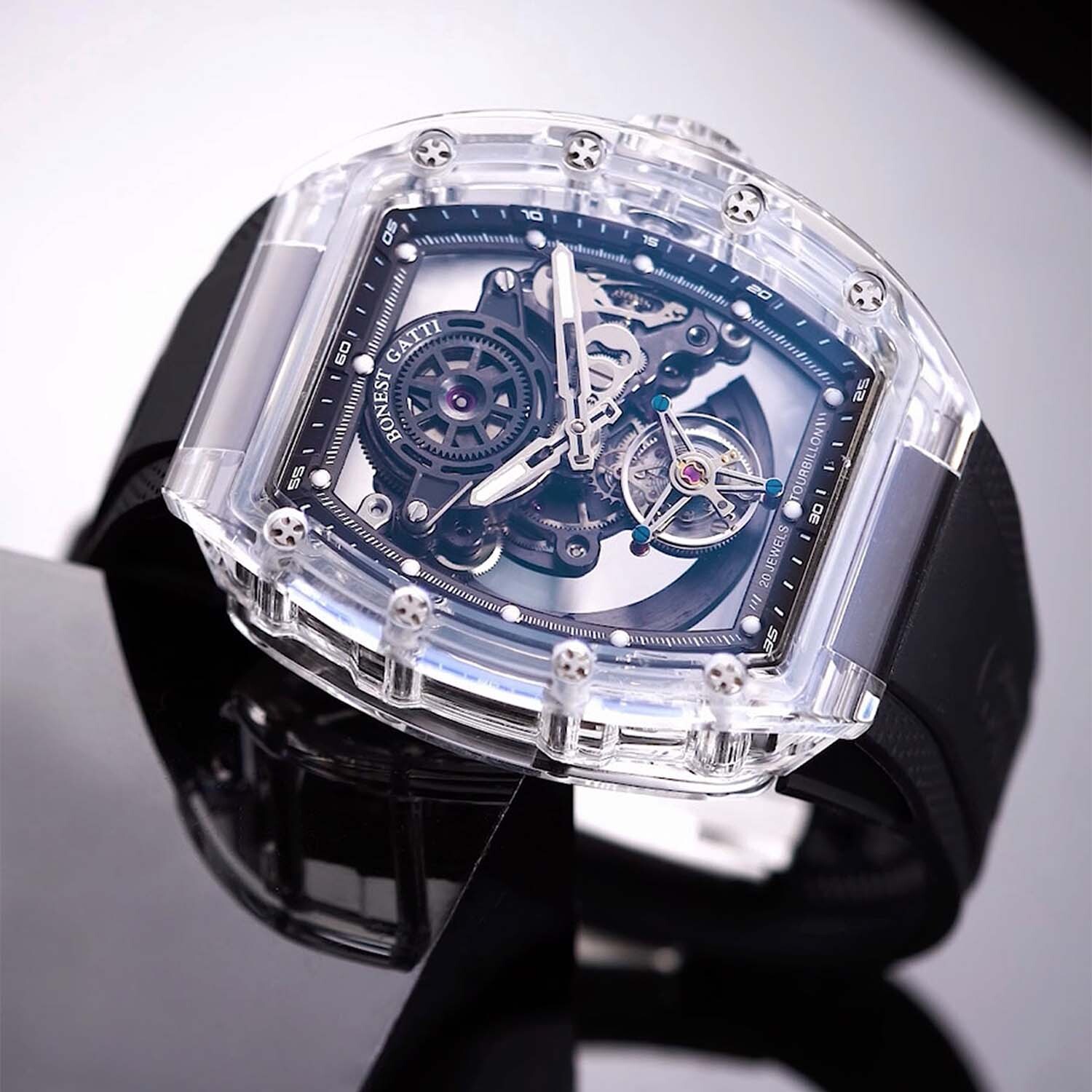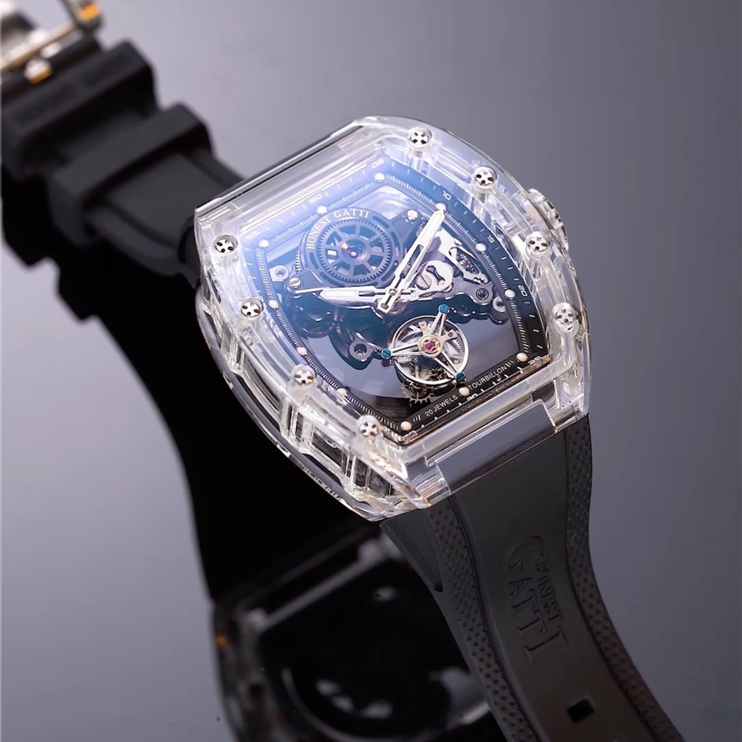 Bonest Gatti【晶鑽陀飛輪】延續「魅影系列」標誌性的酒桶形錶殼,採用明亮通透的高強度水晶玻璃結構,將層疊鏤空的機械語彙毫無保留地呈現於腕上。前後貫通的開放式面盤,如超跑引擎的氣缸布局;六點鐘位置的飛行陀飛輪,彷彿隨時待命的動力核心,穩定而凌厲。精密打磨的橋板、立體齒輪與指針,在光影間勾勒嚴謹秩序與速度美學,讓運動基因與輕奢質感達成平衡。