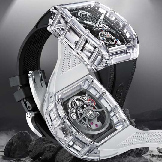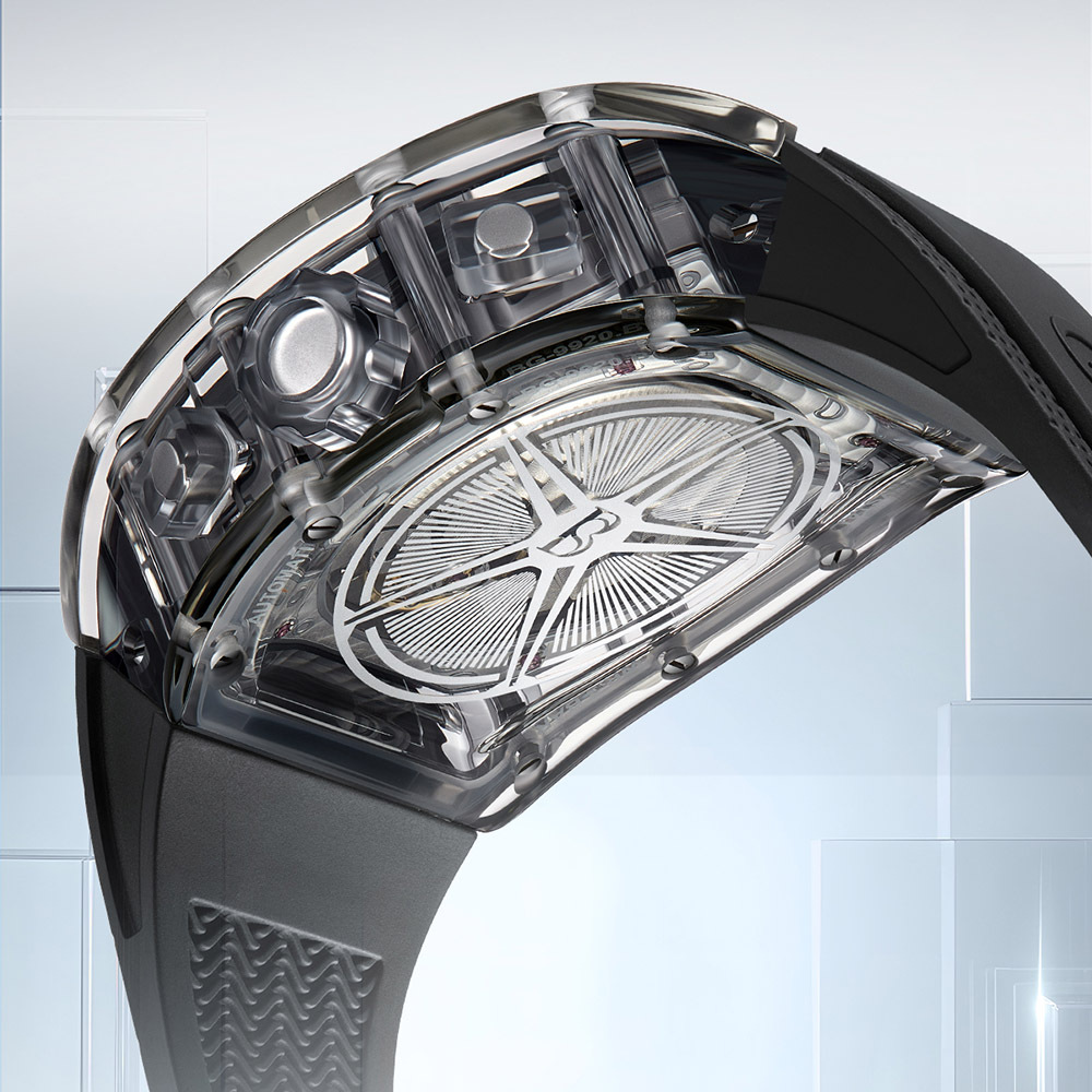 【晶鑽魅影】在設計上承繼品牌職人製錶的工藝精髓,以多層次立體疊砌的方式,為錶款賦予最穩固的結構。鏡面與底蓋使用藍寶石水晶玻璃材質所打造,兼顧輕盈及耐用雙重特性。橡膠錶帶搭配品牌特別設計的蝴蝶彈簧扣,不僅配戴更為舒適方便,開關時俐落的回饋手感,就像F1賽車上的換檔撥片般輕脆,絕對是賽車腕錶最佳的體驗。
