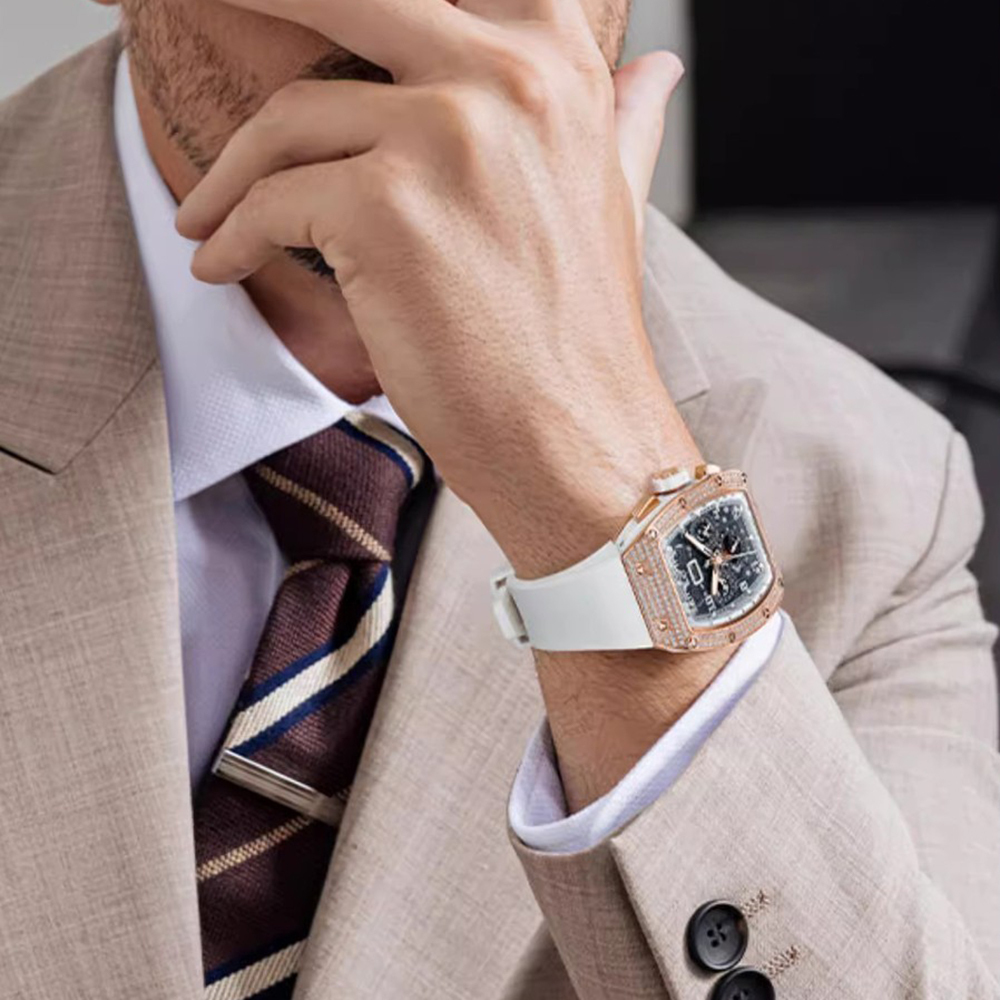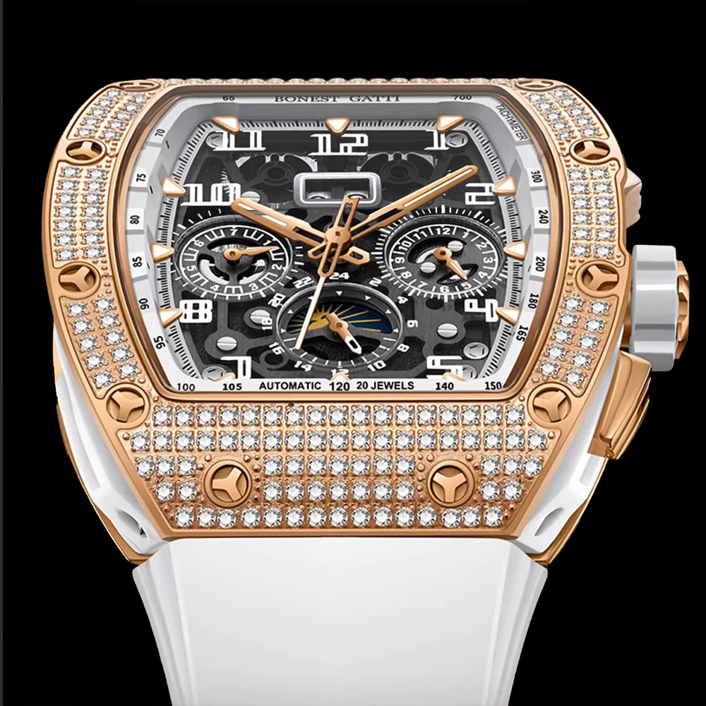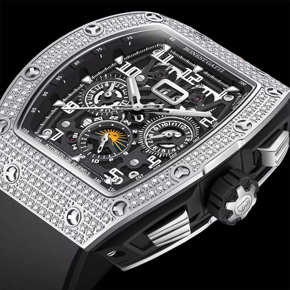 BONEST GATTI 寶加地【尊爵魅影】系列延續「魅影系列」廣受好評的酒桶形錶殼,整體視覺以浪漫星空為繆思,在酒桶形錶殼上鑲嵌璀璨水鑽,做工繁複而細膩,讓原本陽剛率性的運動錶款散發出不同的優雅氣息! 除了耀眼奢華的鑲鑽外框,【尊爵魅影】亦搭載多功能自動上鍊機芯,時、分、秒、日期、月份、星期與日月星辰等多項設計,讓腕錶不再只是腕錶、而是一項兼具實用與美學的工藝傑作!