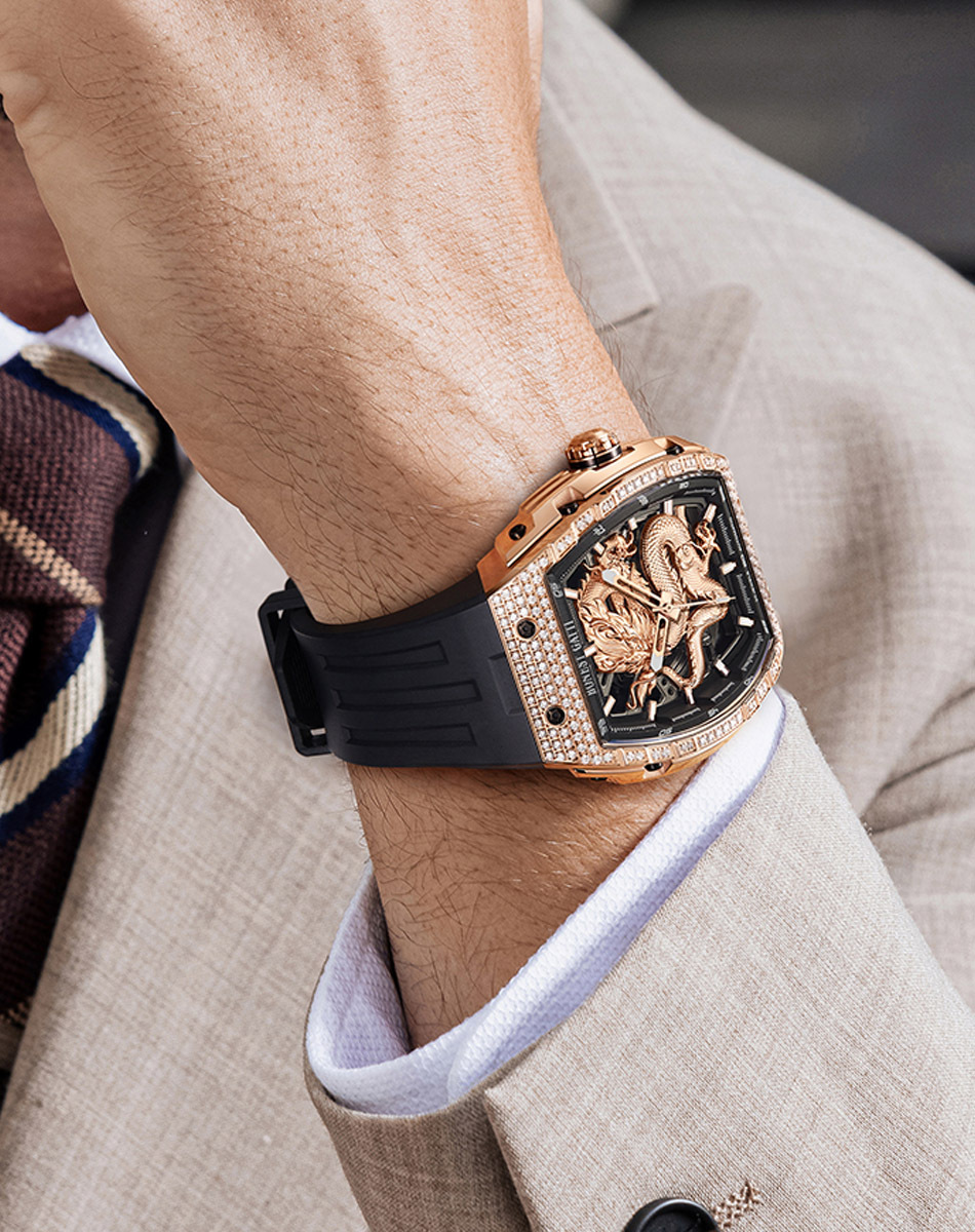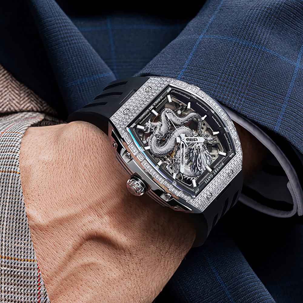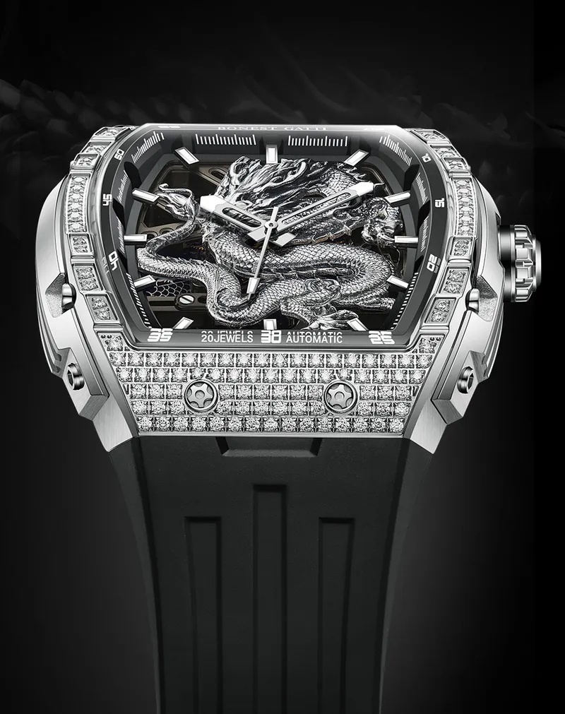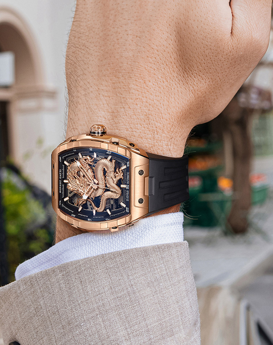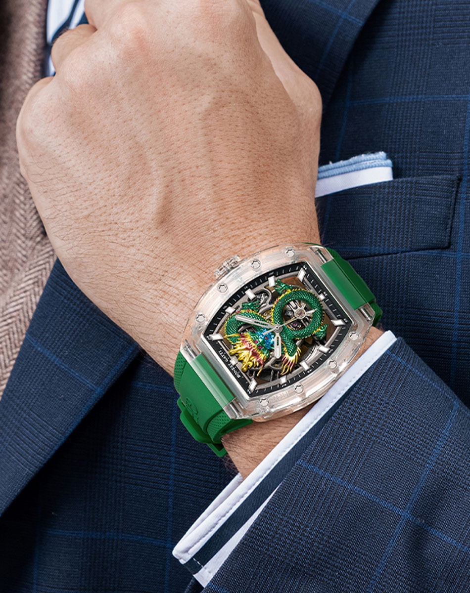 BONEST GATTI 寶加地【晶鑽祥龍】龍年限定款 共有四顏色分別為黑龍款、金龍款、白龍款、青龍款等四色錶款,提供錶迷更多元選擇。其中黑龍款與金龍款錶款搭配黑色橡膠錶帶,展現低調奢華的質感;白龍款則是搭配白色橡膠錶帶,營造出飛龍在天般搶眼的視覺震撼;青龍款最為特別,以靚青為主色調,綴以金黃鑲邊設計,在藍寶石水晶玻璃的映照下,感受無與倫比的尊貴體驗。