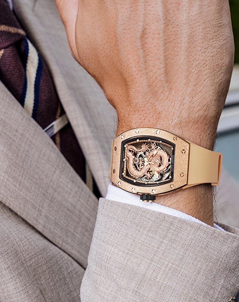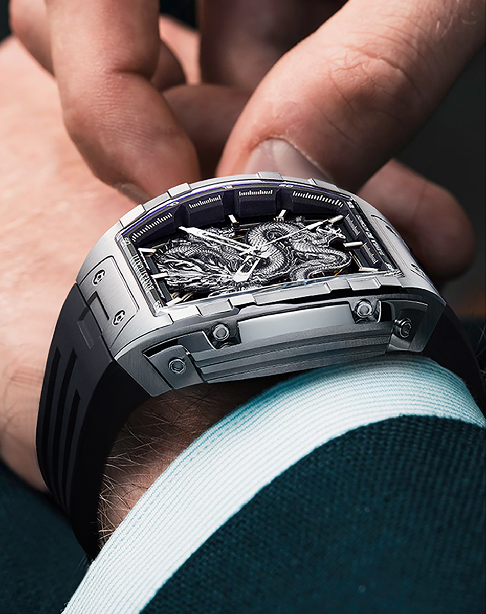 【騰龍魅影】Phantom Dragon 腕錶的背面也暗藏「玄」機。在藍寶石水晶後底蓋上,有如「神龍擺尾」般盤旋著黑色龍尾,古時將這種盤曲環繞狀的龍稱為「蟠龍」。蟠龍是尚未升天、盤踞於地面上的龍,相傳黑龍的「法力」僅次於金龍,於此與錶盤正面的飛天金龍相呼應,彷彿集天地道法靈氣於一身,絕對會是甲辰年最佳佩戴龍錶。