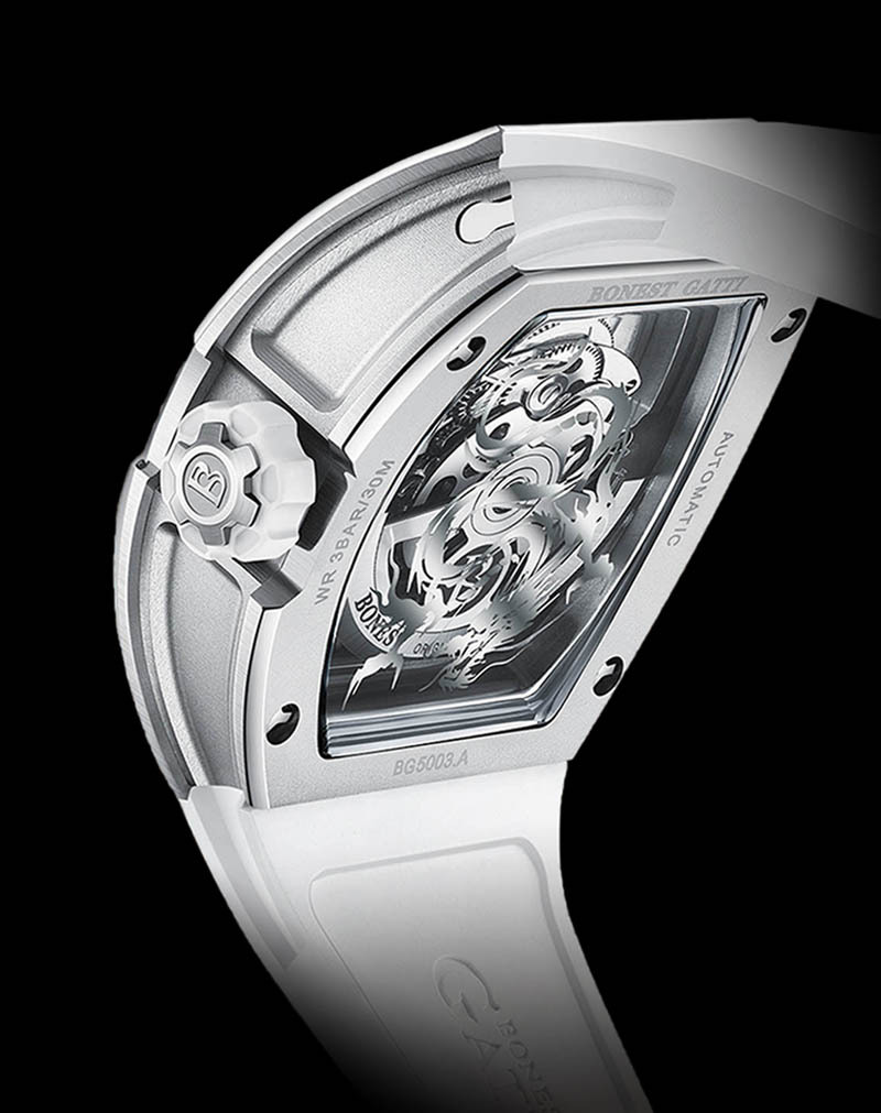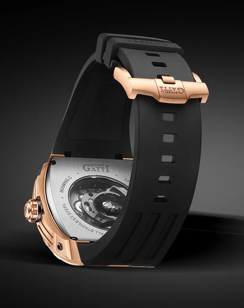 【BONEST GATTI】 以新潮立體大膽的風格,來打造魅影系列的酒桶形外觀,其中最吸睛的莫過於錶殼兩側垂直的勾槽紋路,取材超跑的流線工藝,而氟化橡膠錶帶輕盈服貼的特性,更是展現超跑向來追求輕量化與高速貼背感的舒適性。