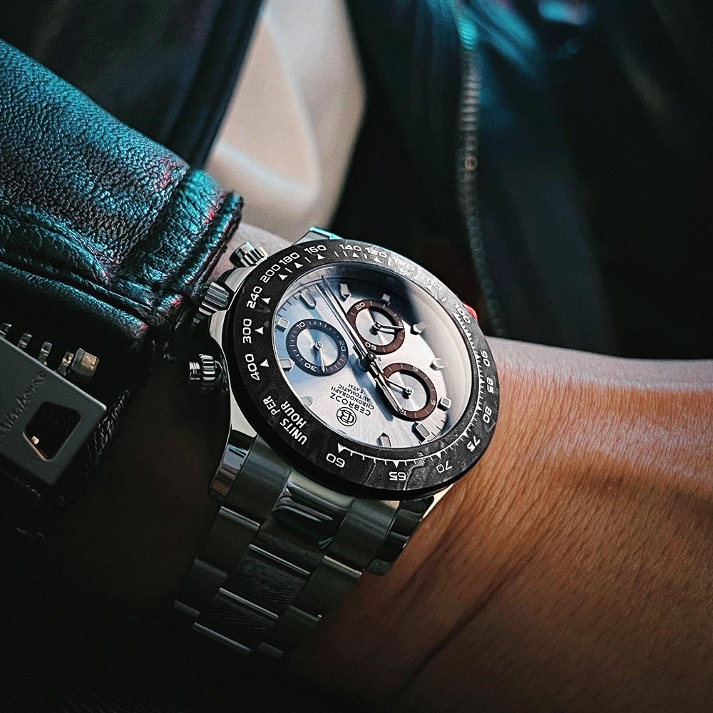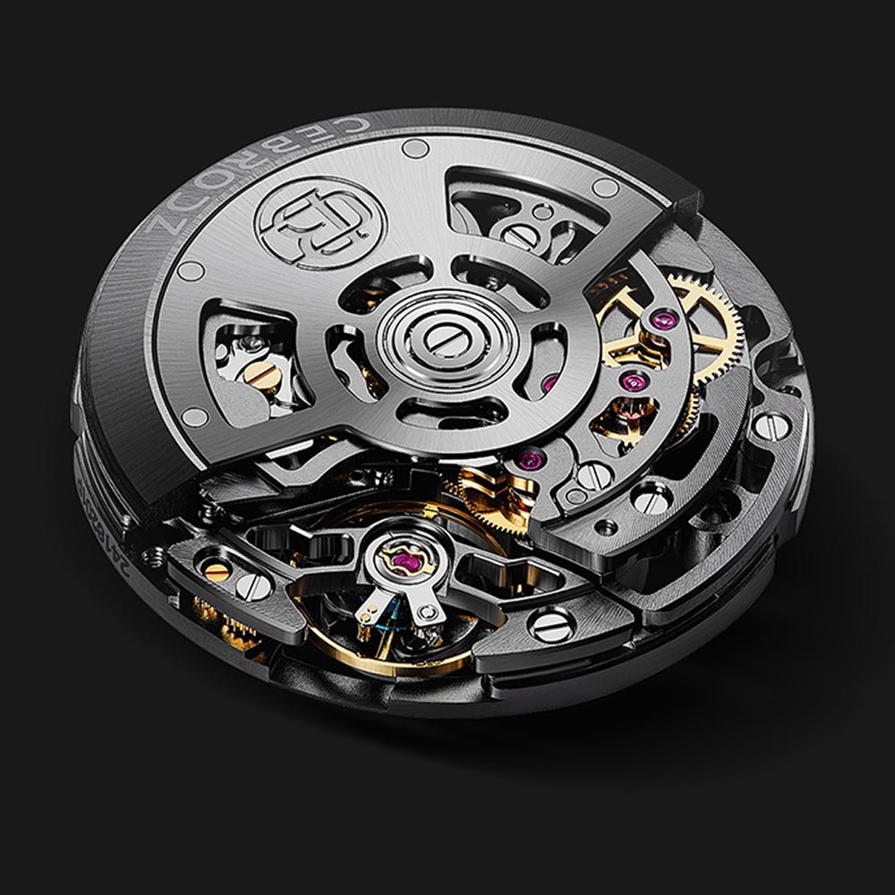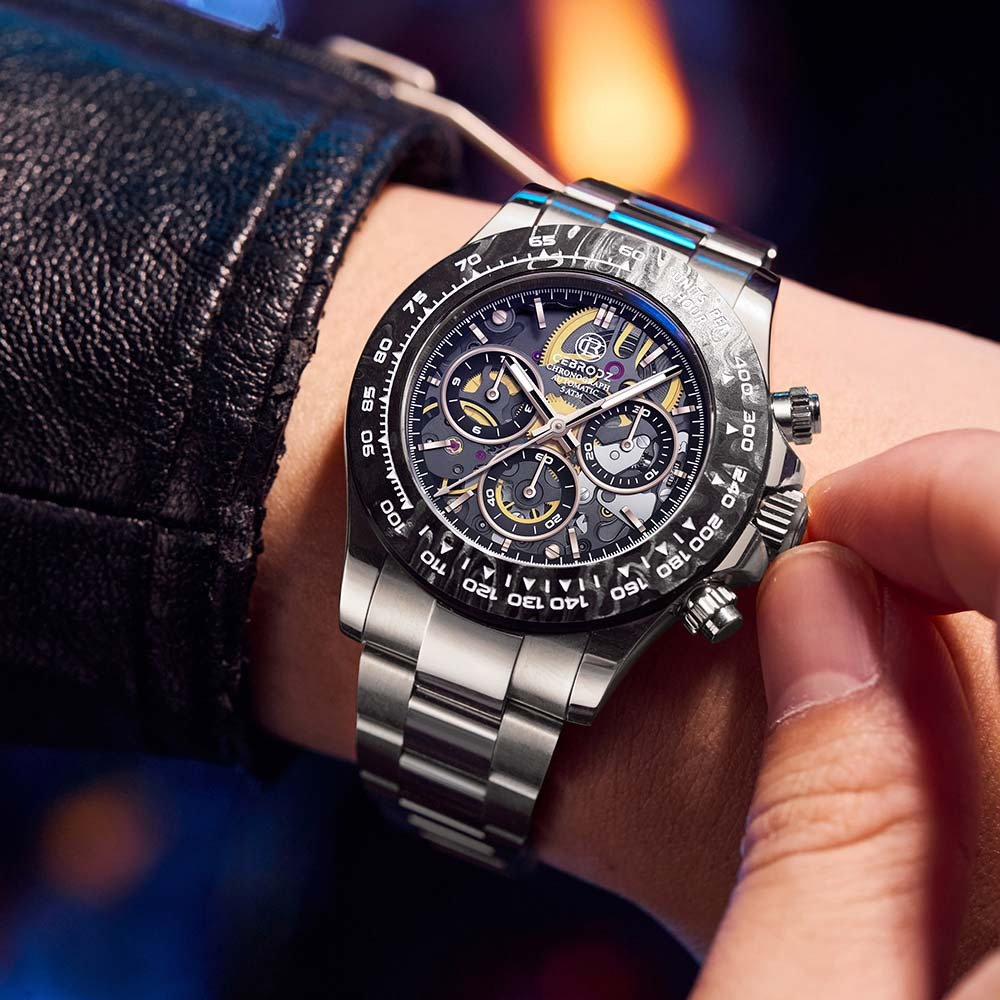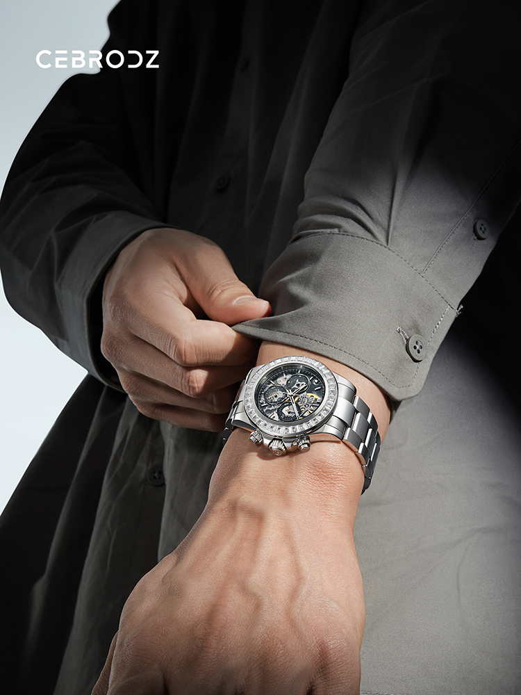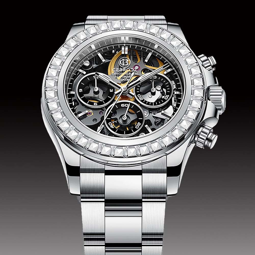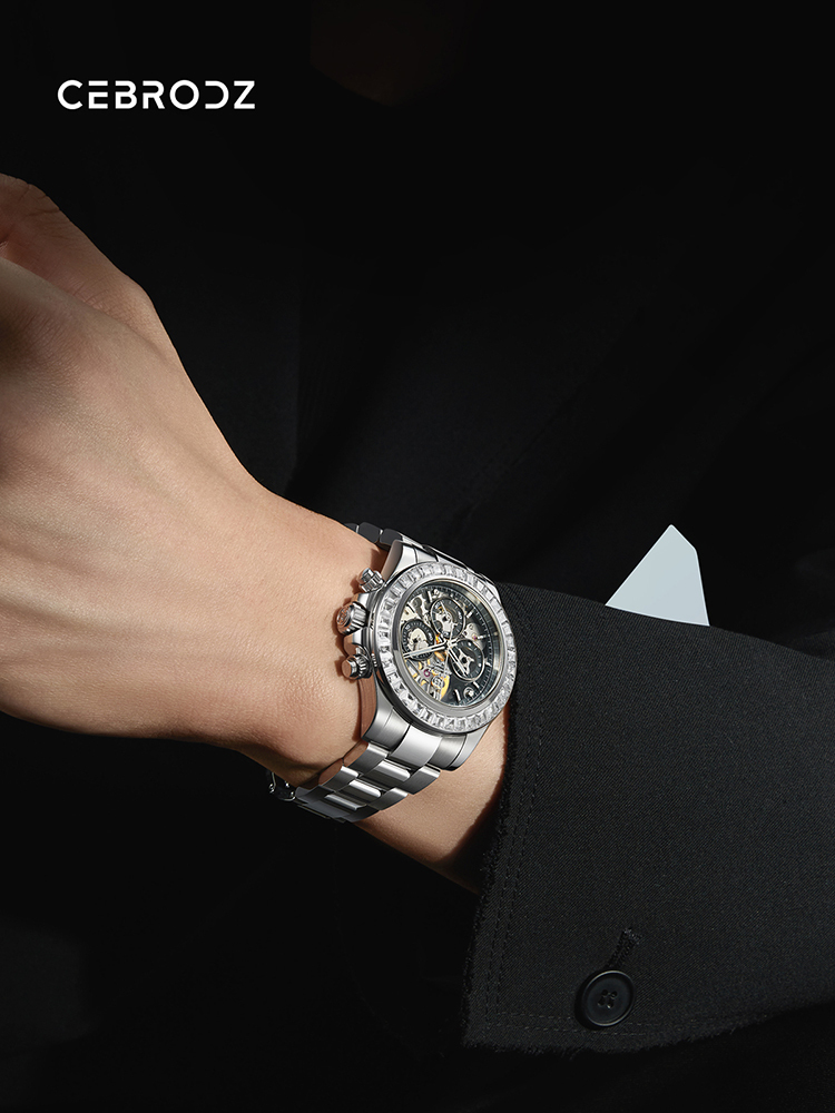 Cebrodz【銀匠系列】採用904等級不鏽鋼打造,堅實結構中蘊藏細膩工藝,正面採鏤空錶盤設計,並搭載導柱輪結構的自動上鍊計時碼錶機芯;外框搭配可換式錶圈(黑色碳纖維計時錶圈、經典黑色陶瓷圈、各類風格彩鑽圈等等)不僅展現出運動與科技的精準美感,也讓腕錶成為風格轉換的靈感起點。