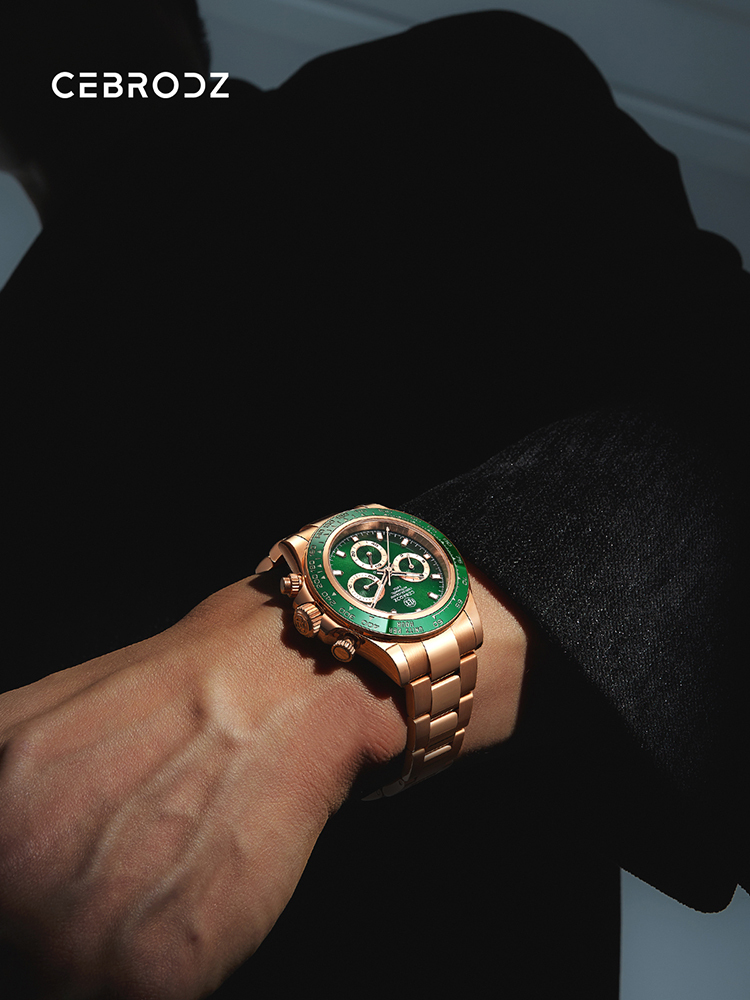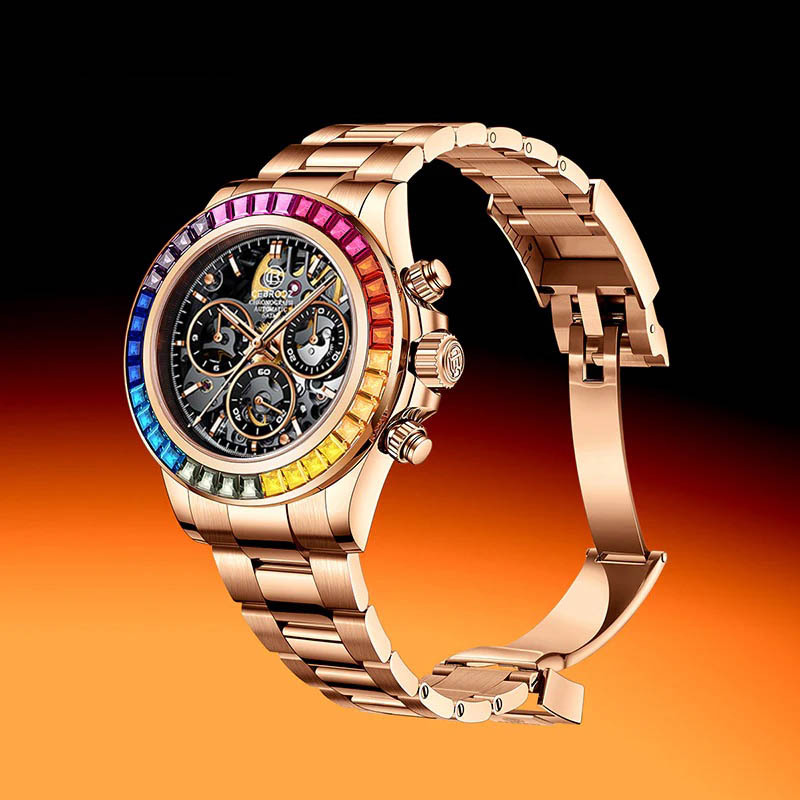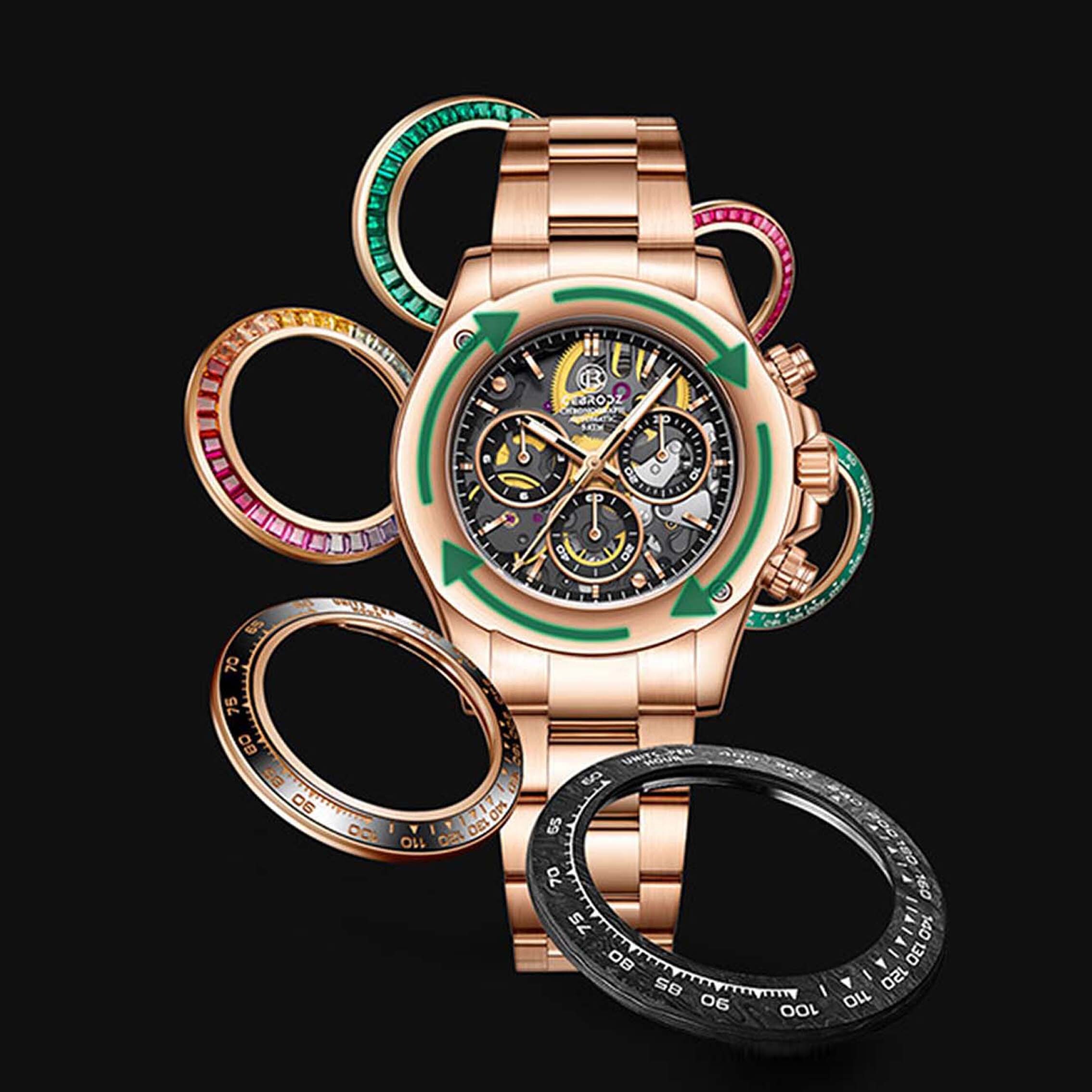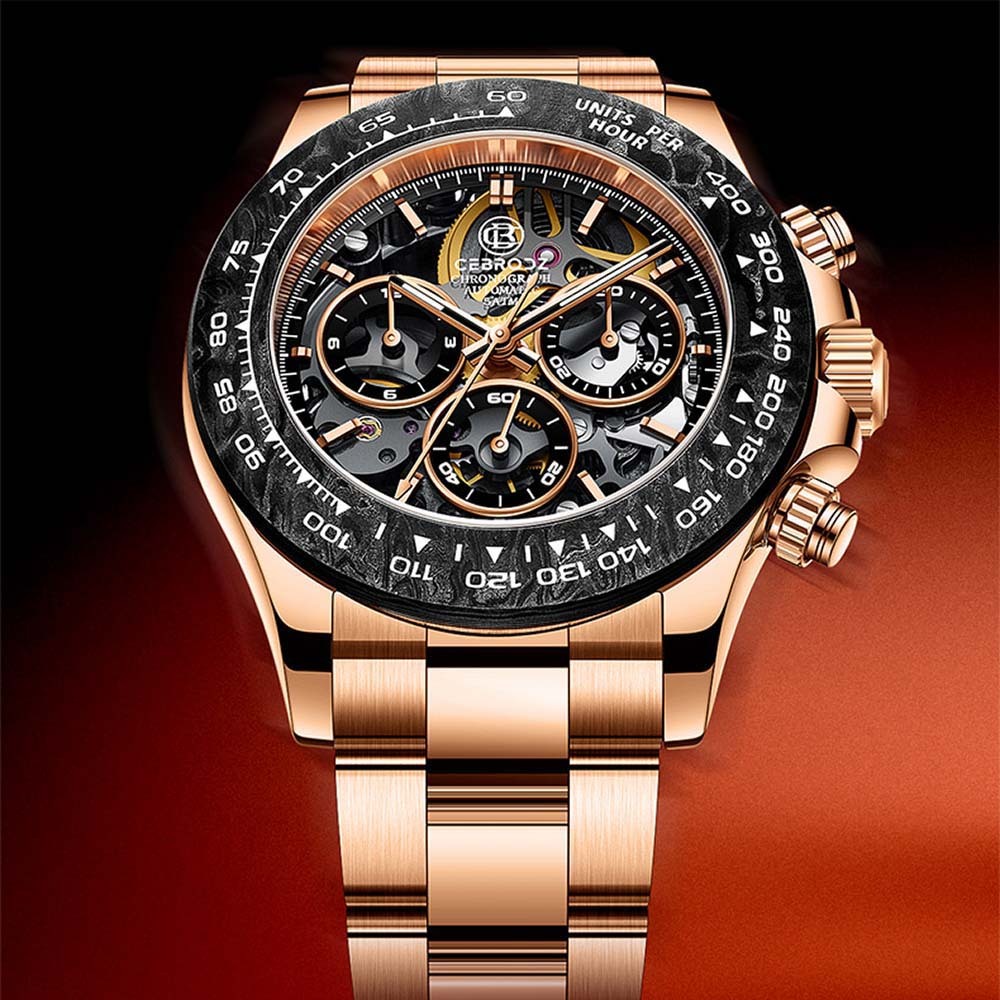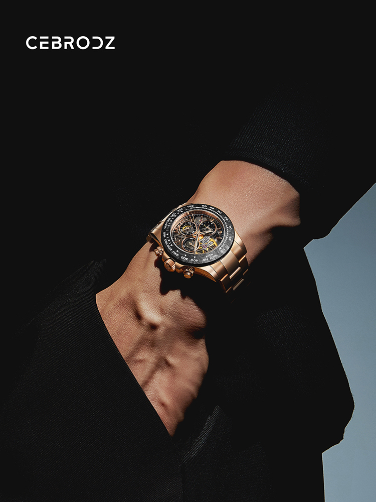 Cebrodz【金匠系列】以玫瑰金鏤空設計演繹機械藝術的腕錶,搭載導柱輪結構的自動上鍊計時碼錶機芯,精準與美感兼具。錶殼採用904等級不鏽鋼製成,結合PVD電鍍工藝,展現持久耀眼的金屬光澤。碳纖款外層配備可更換式碳纖維計時圈,不僅輕盈堅固更彰顯運動與奢華;彩鑽款外框鑲嵌可更換式彩虹鑽錶圈,從紅至紫的漸層光芒,象徵無限可能與個性態度,無論白晝或夜晚,都能綻放獨一無二的魅力,彷彿將時間化為一場絢麗盛宴。
