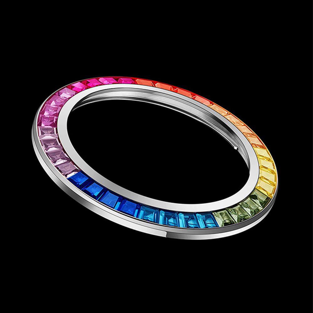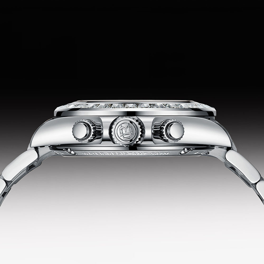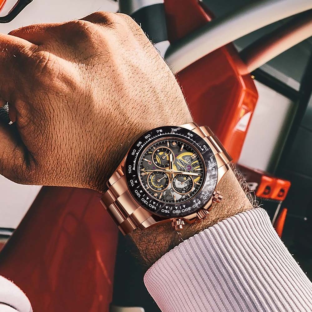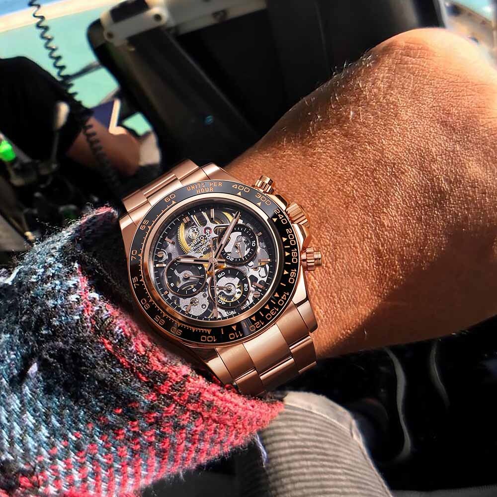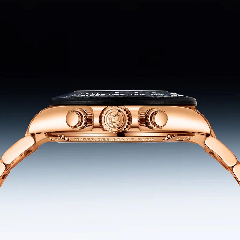 Cebrodz【金匠系列】以玫瑰金鏤空設計演繹機械藝術的腕錶,搭載導柱輪結構的自動上鍊計時碼錶機芯,精準與美感兼具。錶殼採用904等級不鏽鋼製成,結合PVD電鍍工藝,展現持久耀眼的金屬光澤。碳纖款外層配備可更換式碳纖維計時圈,不僅輕盈堅固更彰顯運動與奢華;彩鑽款外框鑲嵌可更換式彩虹鑽錶圈,從紅至紫的漸層光芒,象徵無限可能與個性態度,無論白晝或夜晚,都能綻放獨一無二的魅力,彷彿將時間化為一場絢麗盛宴。