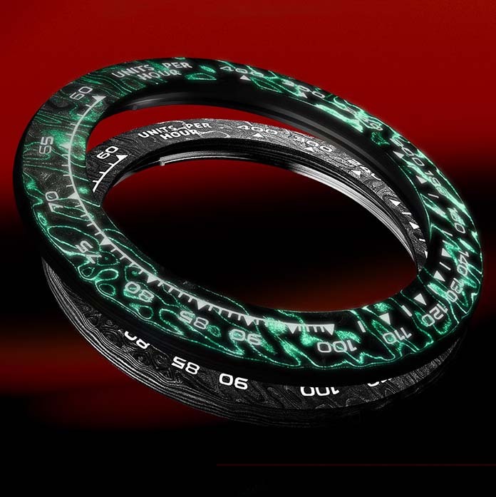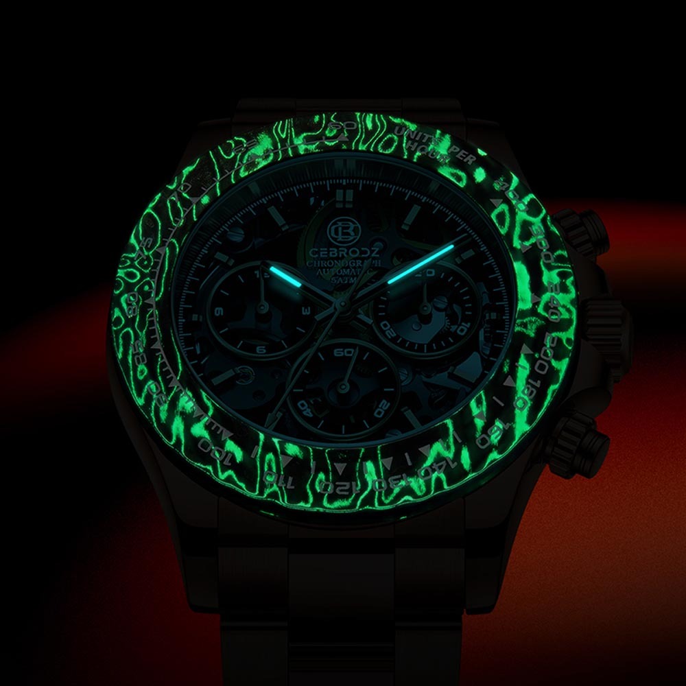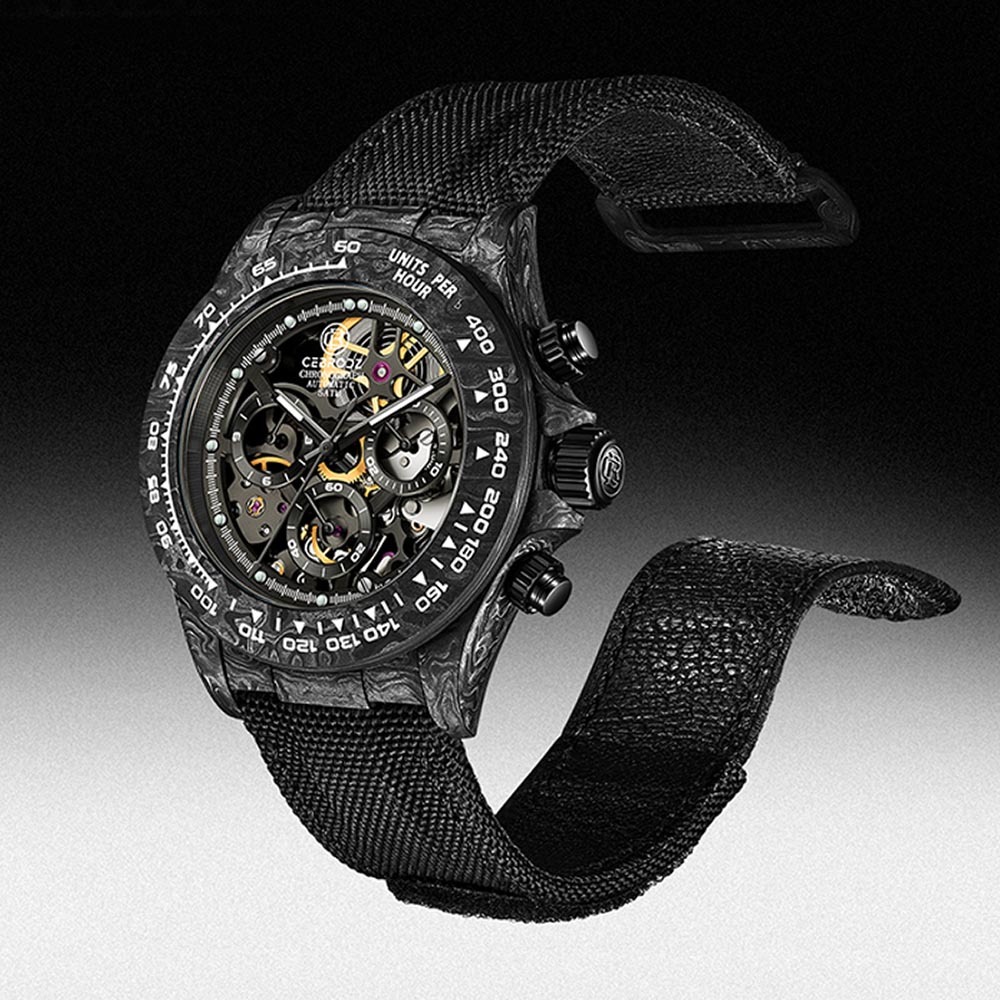 Cebrodz【碳纖系列】全系列錶殼與外圈皆採用碳纖維材質打造,不僅輕盈堅固,更在外框融入夜光刻度設計,於昏暗環境中亦清晰易讀。輕盈結構中蘊藏細膩工藝,正面採鏤空錶盤設計,並搭載導柱輪結構的自動上鍊計時碼錶機芯;外框搭配可換式黑色碳纖維計時錶圈,輕量、高強度,同時展現出運動與科技的精準美感;錶帶結合外層高強度尼龍與內層真皮襯裡,同時兼顧運動耐用性與皮革的舒適貼合感,讓腕錶適應多元生活場景,從城市穿梭到極限挑戰都能自如應對。碳纖維的紋理在光影下閃耀,為整體設計注入剛柔並濟的現代靈魂。