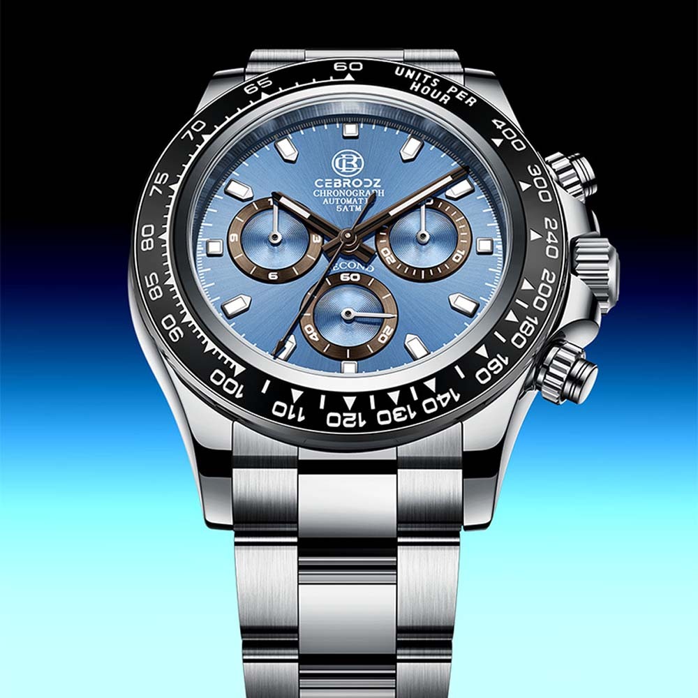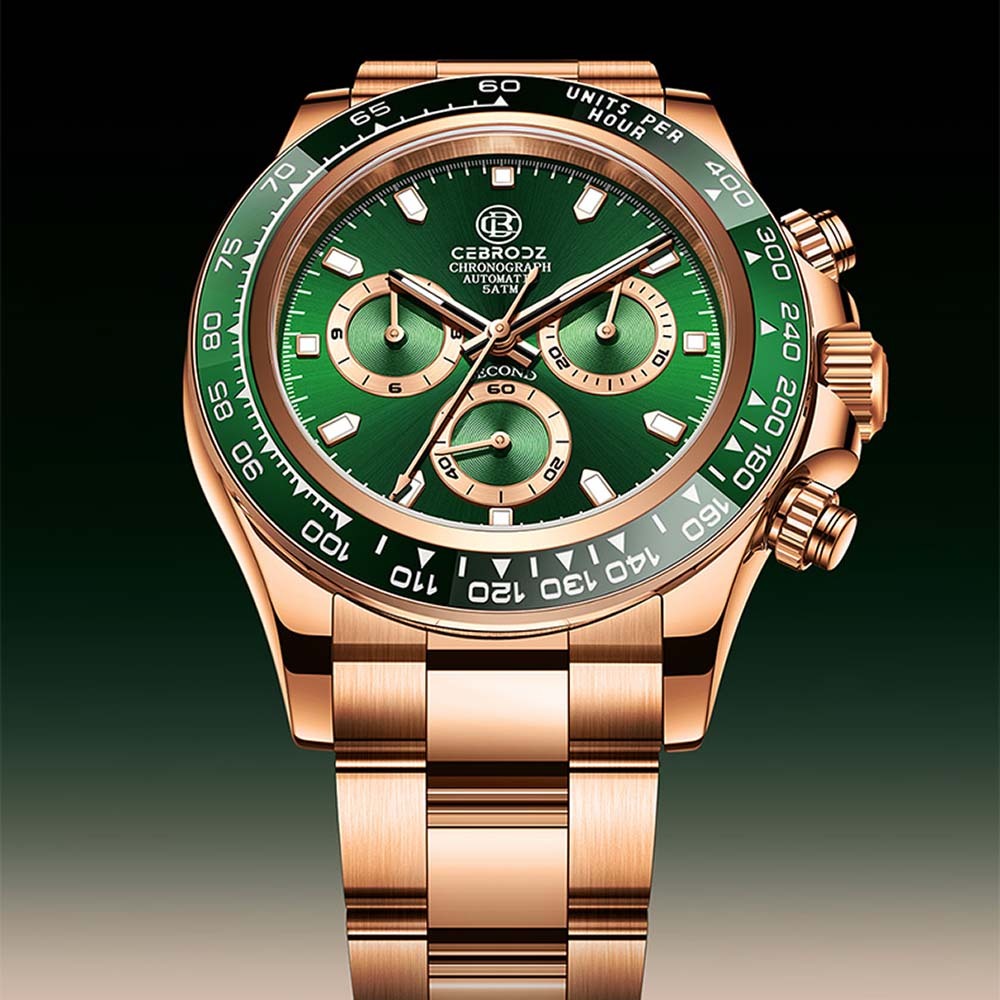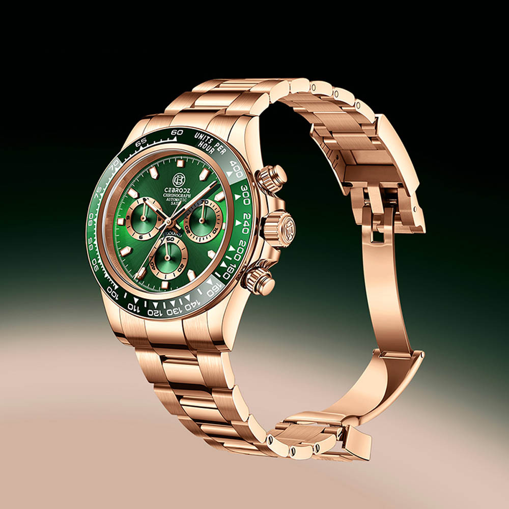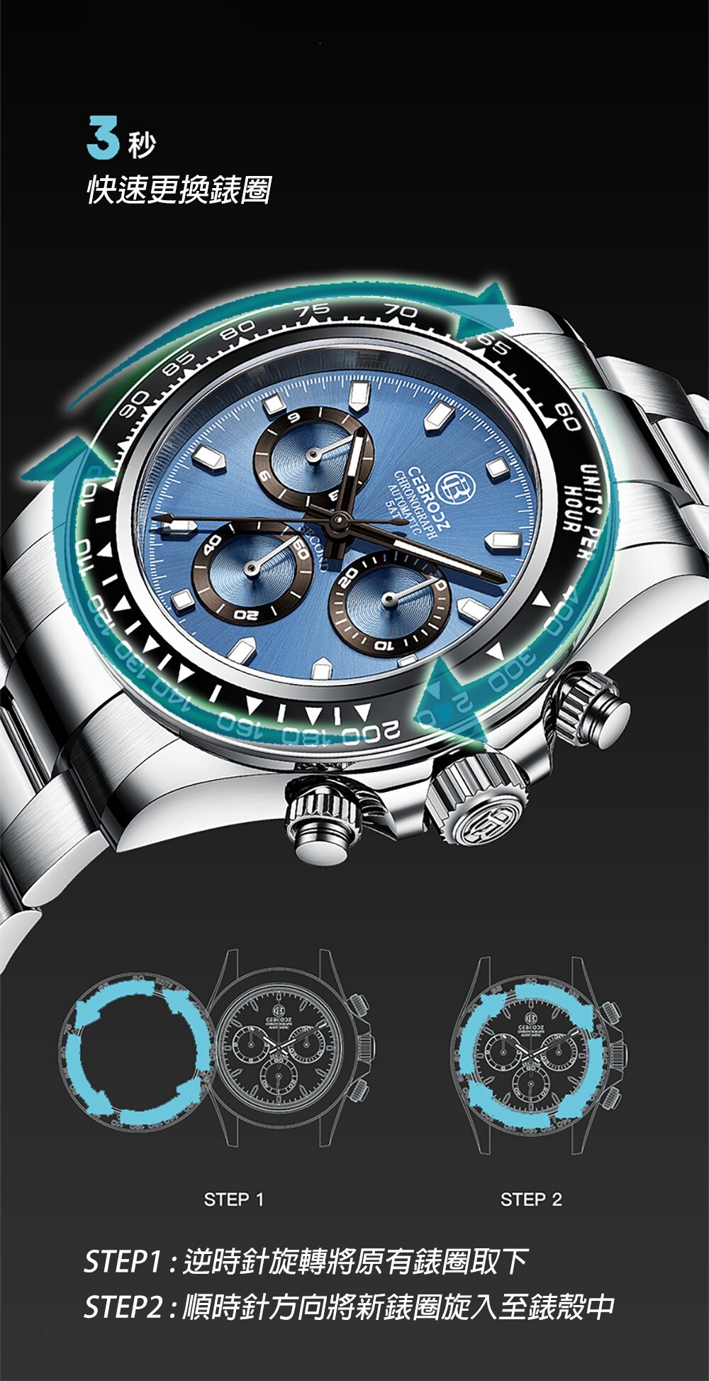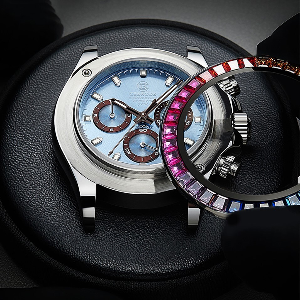 Cebrodz【復刻系列】率先採用快拆式錶圈模組設計,讓腕錶成為風格轉換的靈感起點。一圈替換,瞬間切換風格品味,無論日常、正裝或潮流場域,皆能隨心搭配,滿足你對造型的每一份講究。全錶採用904等級不鏽鋼打造,堅實結構中蘊藏細膩工藝,並搭載導柱輪結構的自動上鍊計時碼錶機芯,展現出運動與科技的精準美感。復刻系列有兩款顏色,分別為「不鏽鋼冰藍款」與「玫瑰金孔雀綠款」,以提供熱愛改裝的錶迷們多重選擇。