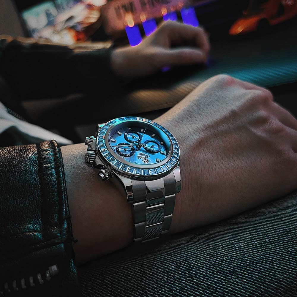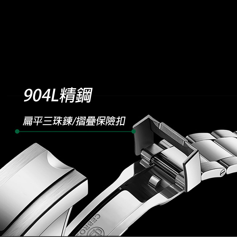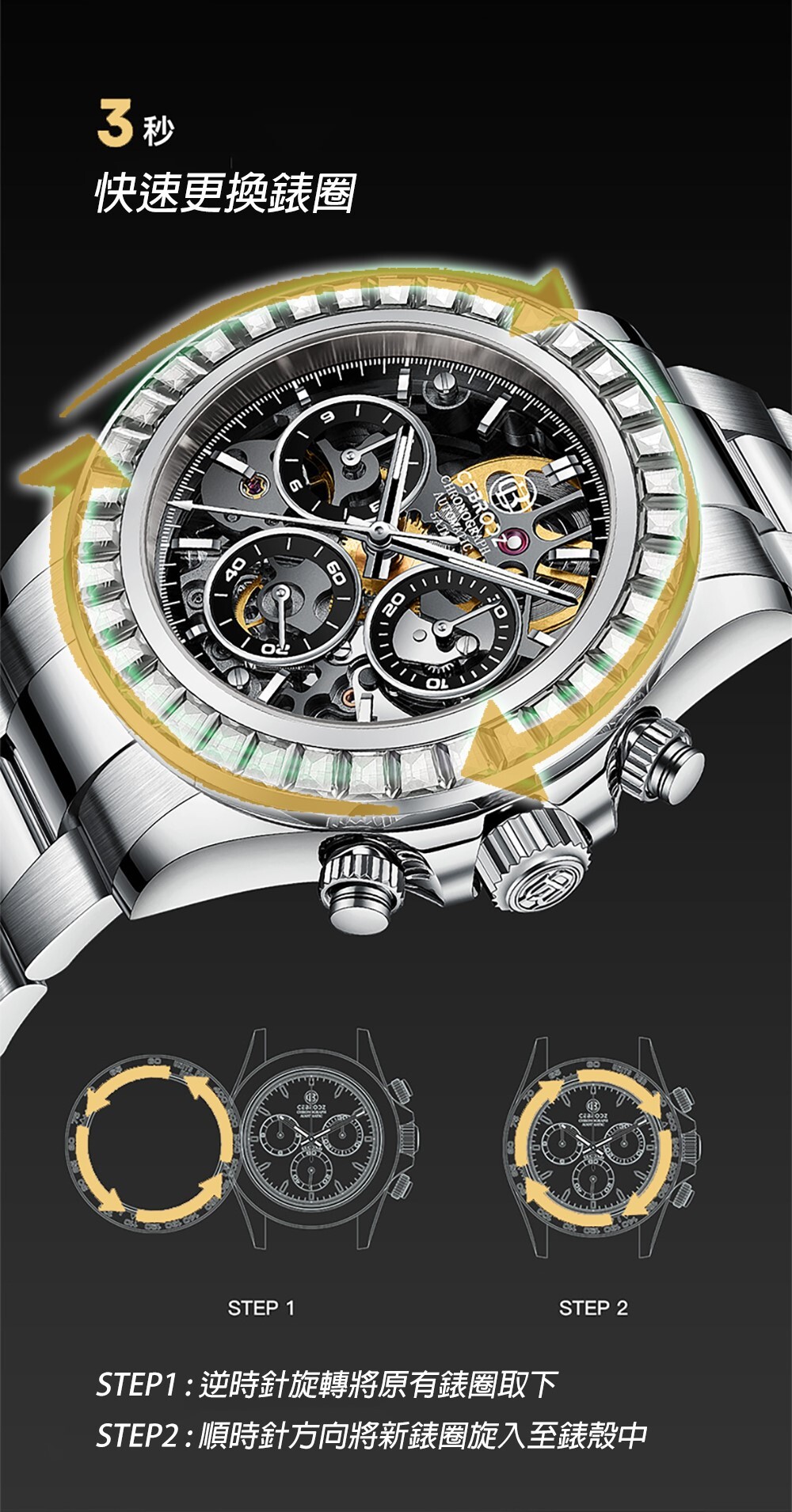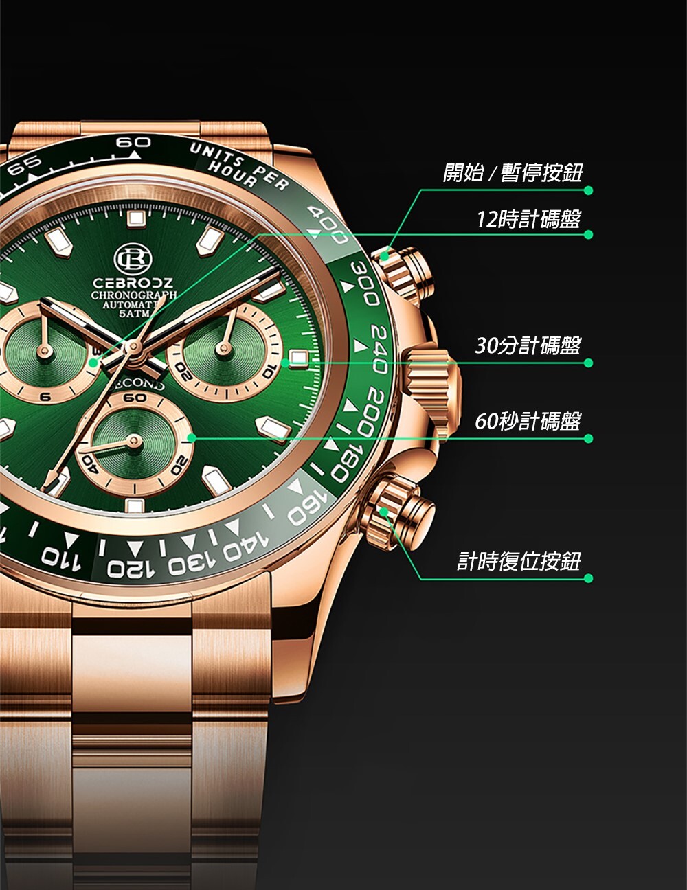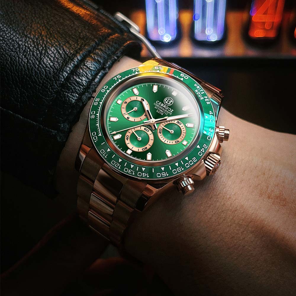 Cebrodz【復刻系列】率先採用快拆式錶圈模組設計,讓腕錶成為風格轉換的靈感起點。一圈替換,瞬間切換風格品味,無論日常、正裝或潮流場域,皆能隨心搭配,滿足你對造型的每一份講究。全錶採用904等級不鏽鋼打造,堅實結構中蘊藏細膩工藝,並搭載導柱輪結構的自動上鍊計時碼錶機芯,展現出運動與科技的精準美感。復刻系列有兩款顏色,分別為「不鏽鋼冰藍款」與「玫瑰金孔雀綠款」,以提供熱愛改裝的錶迷們多重選擇。