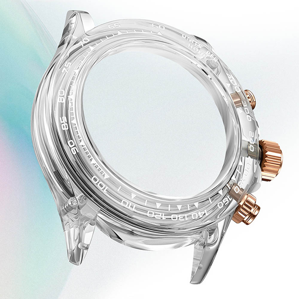 Cebrodz【極光系列】突破傳統設計框架,以水晶玻璃打造整體錶殼,通透無瑕的設計,半透微砂質感的圖騰面盤搭配鏤空底蓋設計,讓內部精密機械結構在光影流轉中若隱若現,齒輪運作節奏盡顯力與美的協奏。極光系列搭載具導柱輪模組的自動上鍊計時碼錶機芯,運作節奏更加穩定流暢,是專業與工藝的雙重體現。細節處綴以玫瑰金色錶冠、按把與指針,在晶透結構中綻放奢華質感,將剛硬機械與細膩優雅完美融合。順勢而下的錶帶則採用半透明天然氟化橡膠,不僅服貼手腕、舒適透氣,更將運動機能與奢華美學無縫融合。