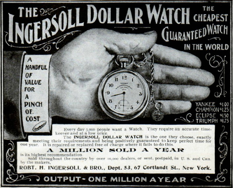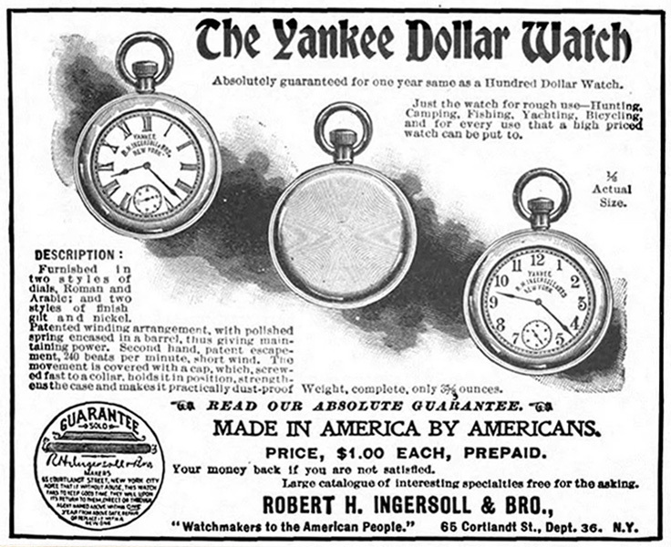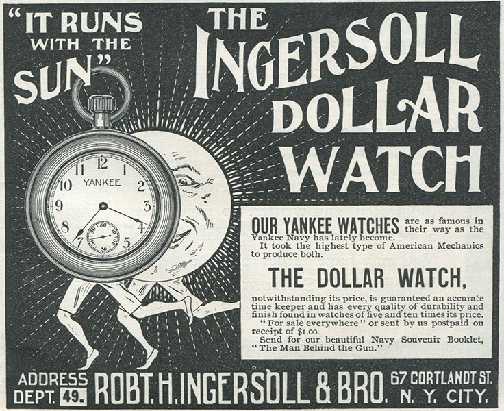 Ingersoll於1882年在美國紐約成立,並於1892年正式跨足鐘錶產業,在那個只有達官貴人才能擁有鐘錶的年代,為普羅大眾提供真正平價的產品。1896年推出名為「Yankee」的錶款,售價為1美元,立刻便以「dollar watch」風靡全球,擁有「讓美元出名的錶」的美譽。據說老羅斯福總統當年曾去非洲狩獵時,曾被介紹為「那個從Ingersoll生產國來的人」,就可知道Ingersoll當時在全世界的知名度有多大!