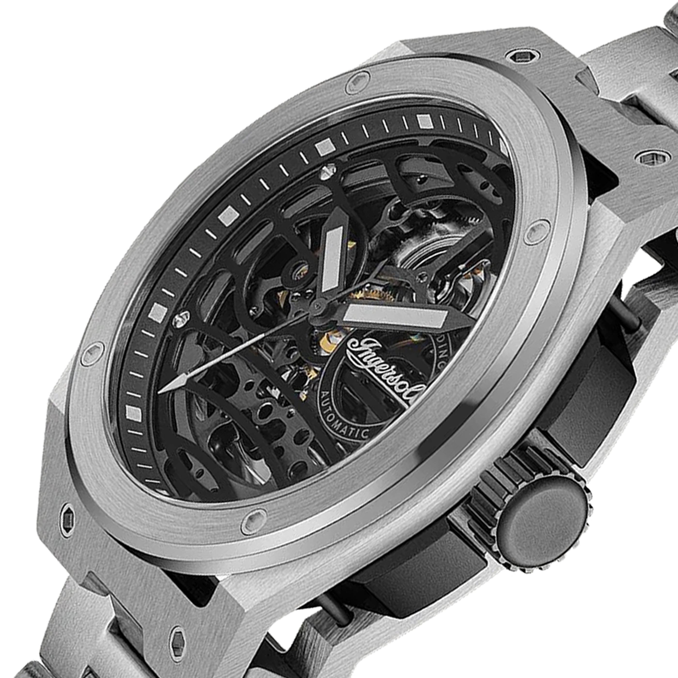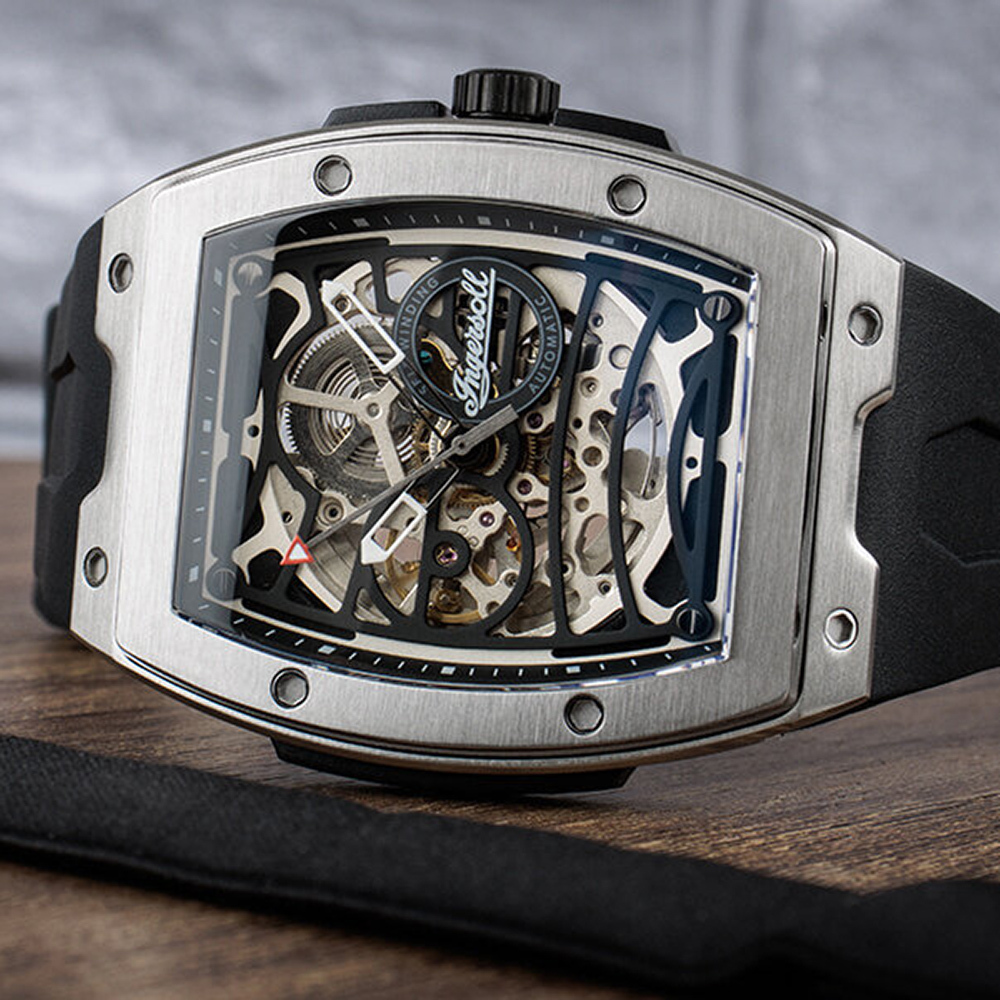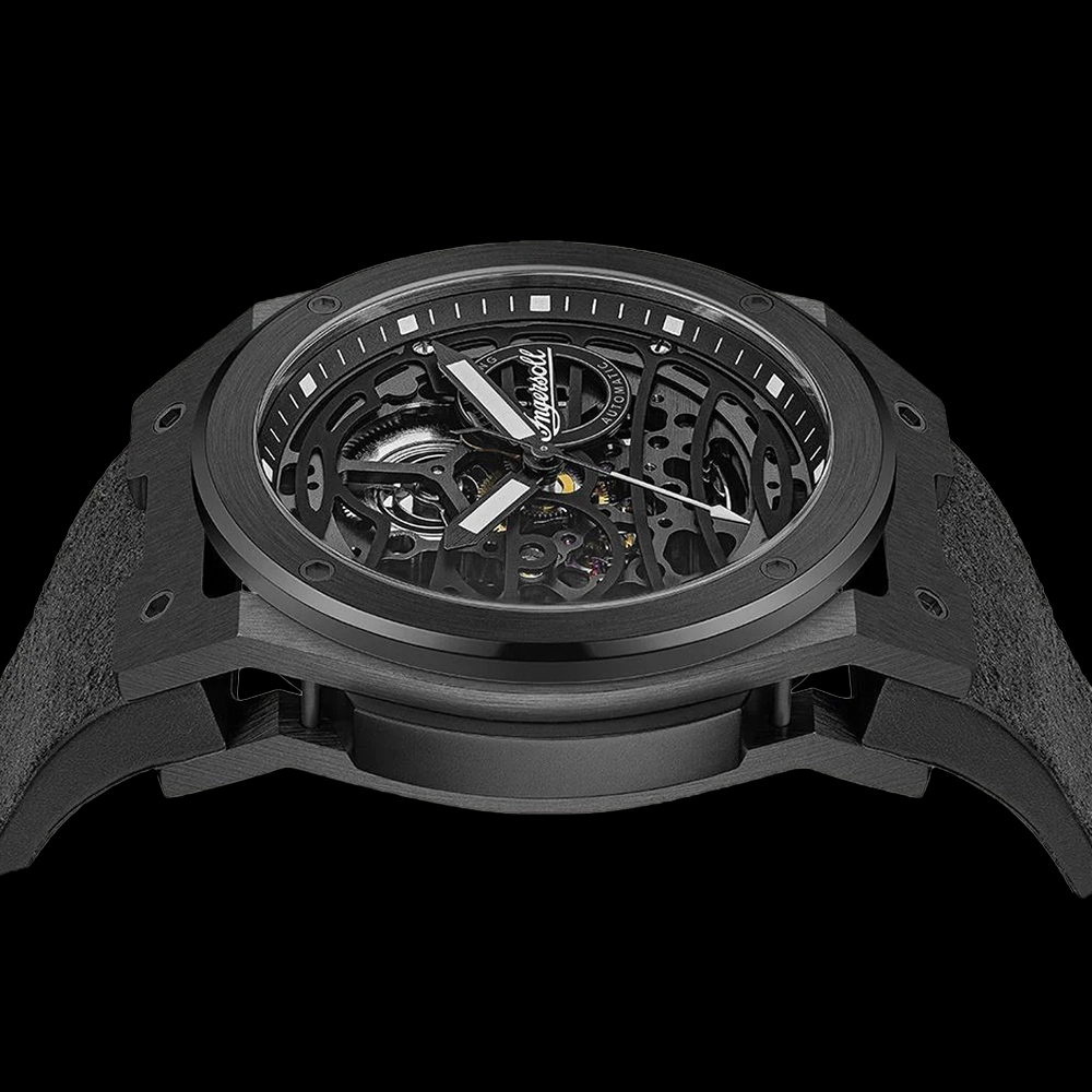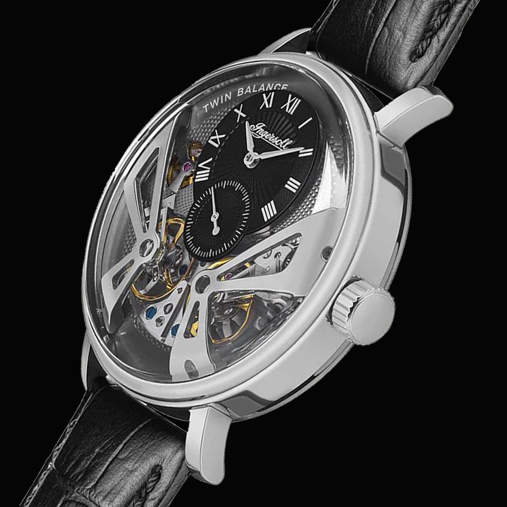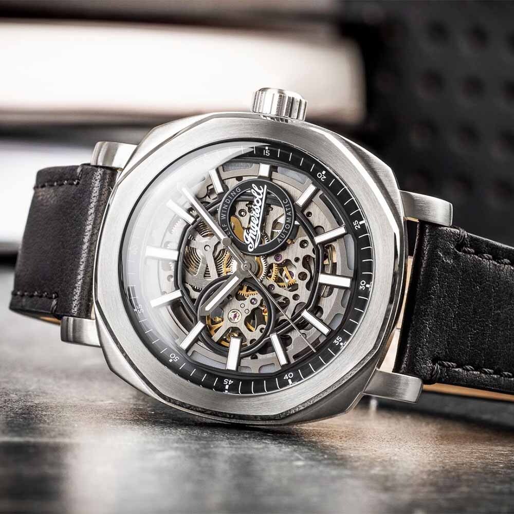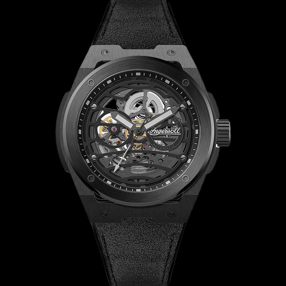 Ingersoll【The Outrider先驅者系列】前後鏤空的設計讓使用者得以清晰看到機芯的每一個齒輪咬合、每一次擺輪的跳動。這不僅僅是設計美感,更是 Ingersoll 對機械藝術的自信 ,全錶殼採用不鏽精鋼拉絲與拋光混合工藝,棱角分明,卻不失手感溫潤。外圈的金屬切面設計,彷彿老底特律工廠的鋼鐵光澤,帶有美式機械的力量感。搭配黑色真皮錶帶,經典又百搭,讓它既能駕馭西裝,也能陪你走在牛仔外套與靴子的街頭。