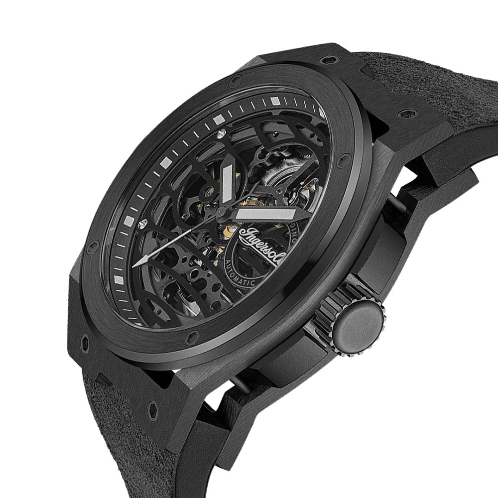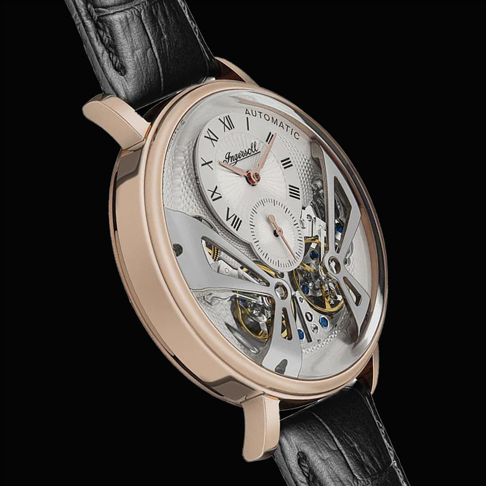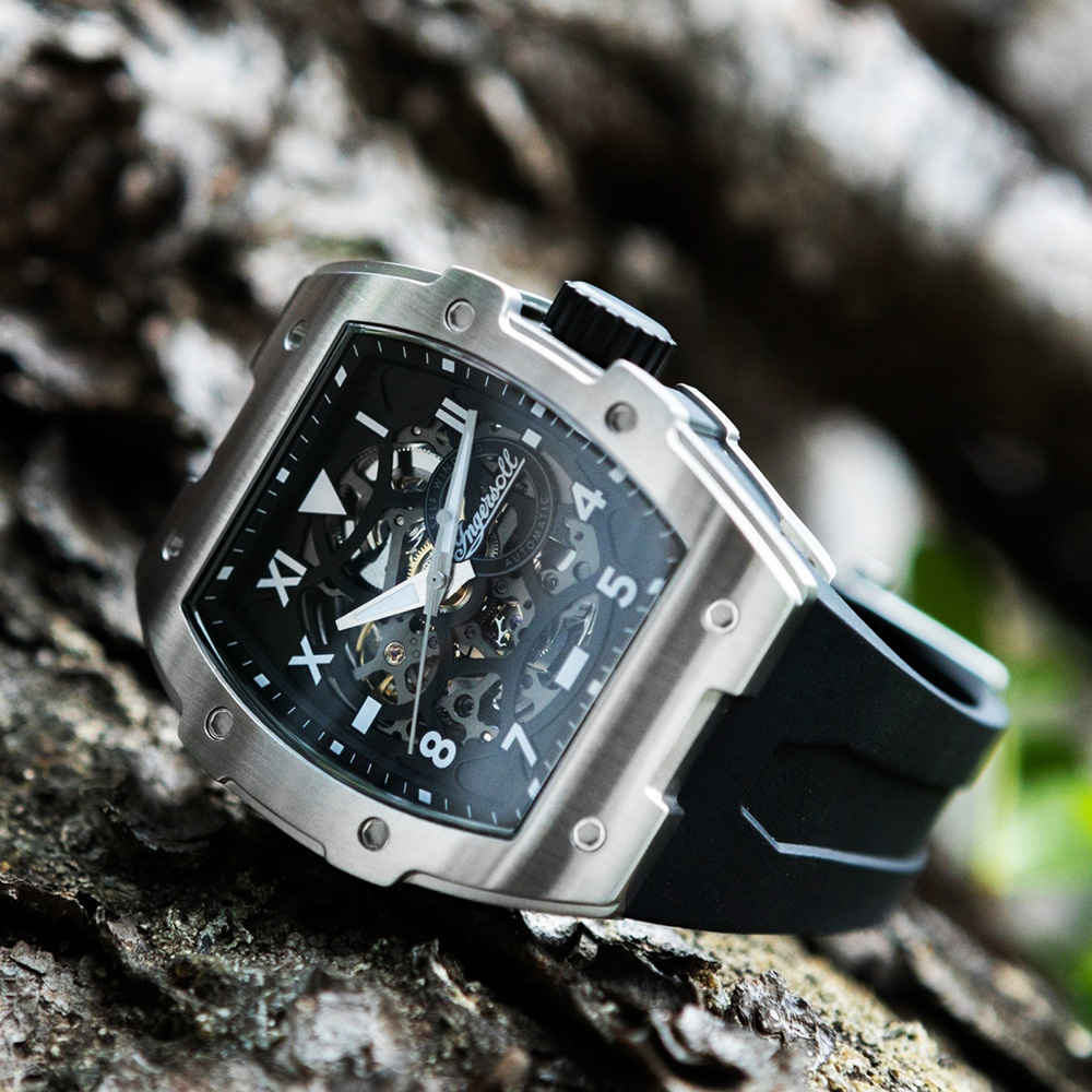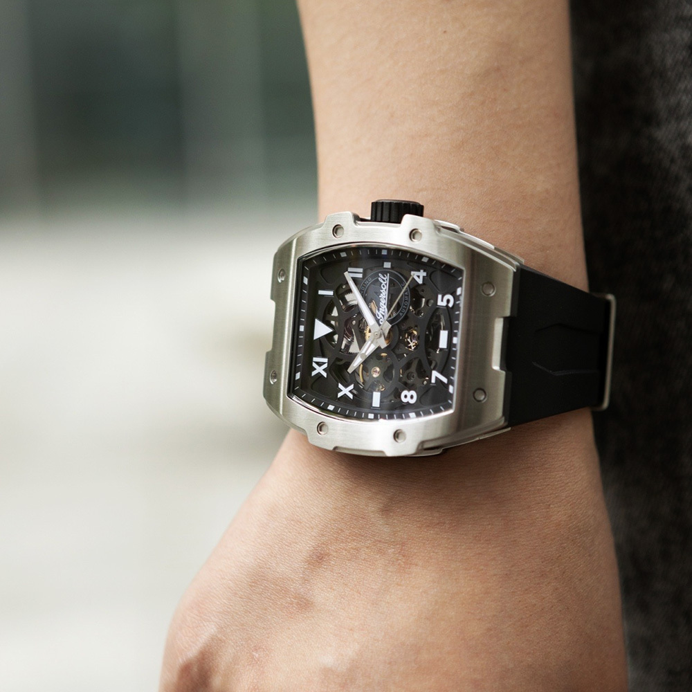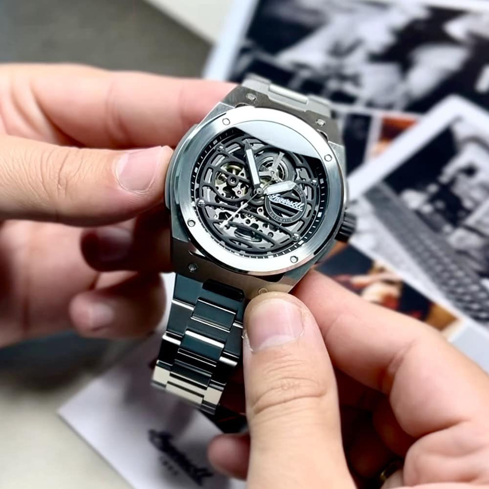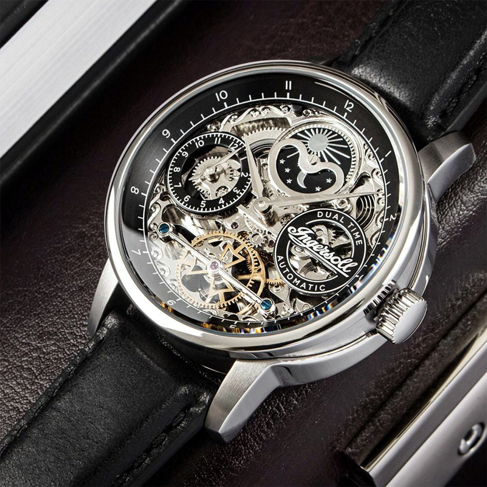 Ingersoll【The Outrider先驅者系列】前後鏤空的設計讓使用者得以清晰看到機芯的每一個齒輪咬合、每一次擺輪的跳動。這不僅僅是設計美感,更是 Ingersoll 對機械藝術的自信 ,全錶殼採用不鏽精鋼拉絲與拋光混合工藝,棱角分明,卻不失手感溫潤。外圈的金屬切面設計,彷彿老底特律工廠的鋼鐵光澤,帶有美式機械的力量感。搭配黑色真皮錶帶,經典又百搭,讓它既能駕馭西裝,也能陪你走在牛仔外套與靴子的街頭。