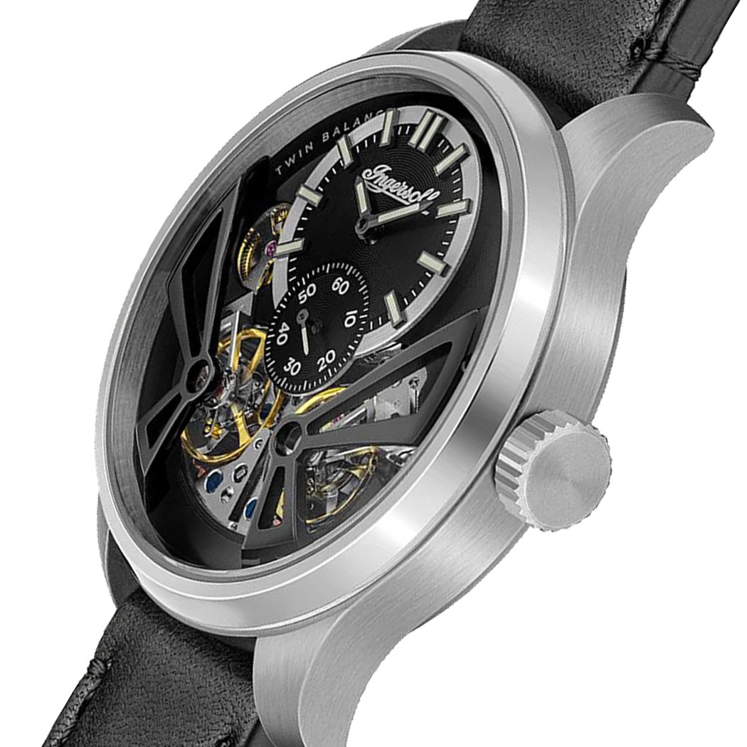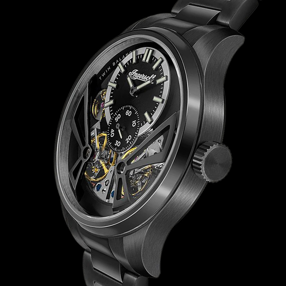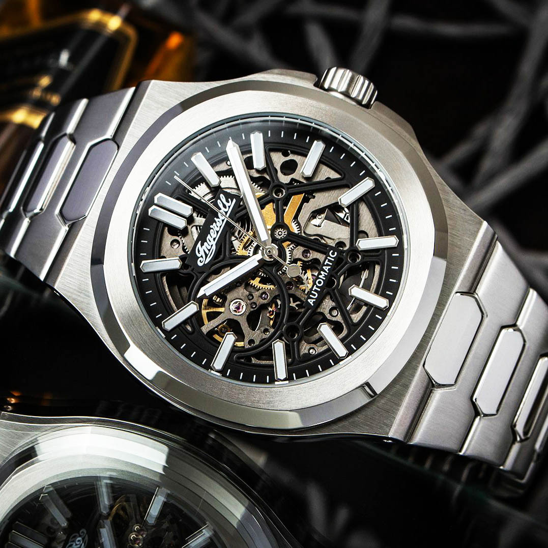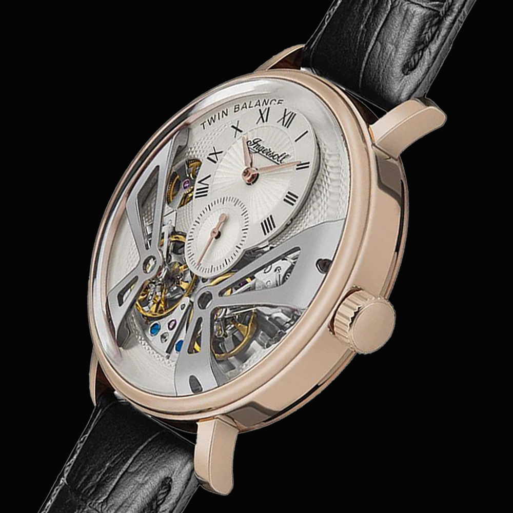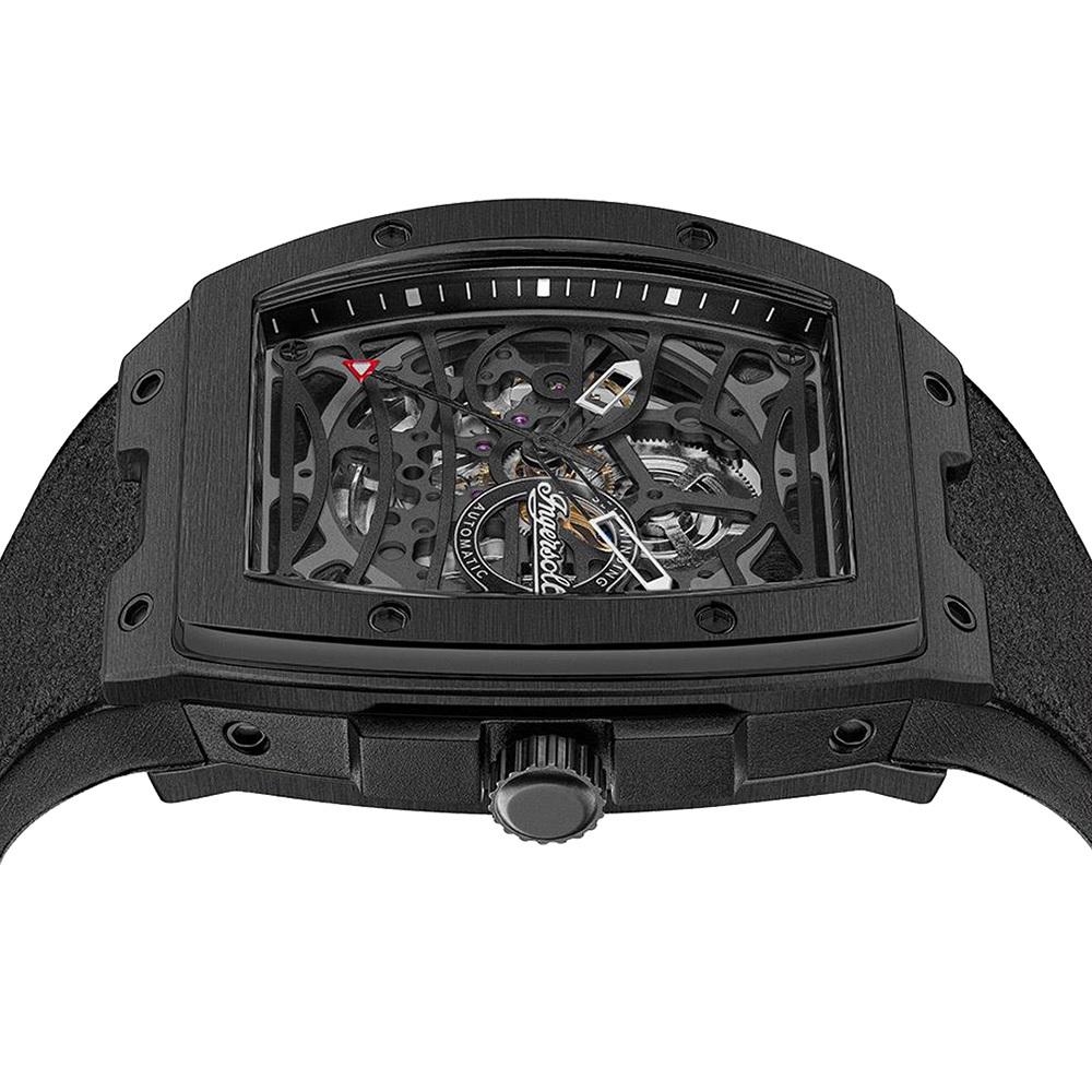 Ingersoll【The Outrider先驅者系列】前後鏤空的設計讓使用者得以清晰看到機芯的每一個齒輪咬合、每一次擺輪的跳動。這不僅僅是設計美感,更是 Ingersoll 對機械藝術的自信 ,全錶殼採用不鏽精鋼拉絲與拋光混合工藝,棱角分明,卻不失手感溫潤。外圈的金屬切面設計,彷彿老底特律工廠的鋼鐵光澤,帶有美式機械的力量感。搭配黑色真皮錶帶,經典又百搭,讓它既能駕馭西裝,也能陪你走在牛仔外套與靴子的街頭。
