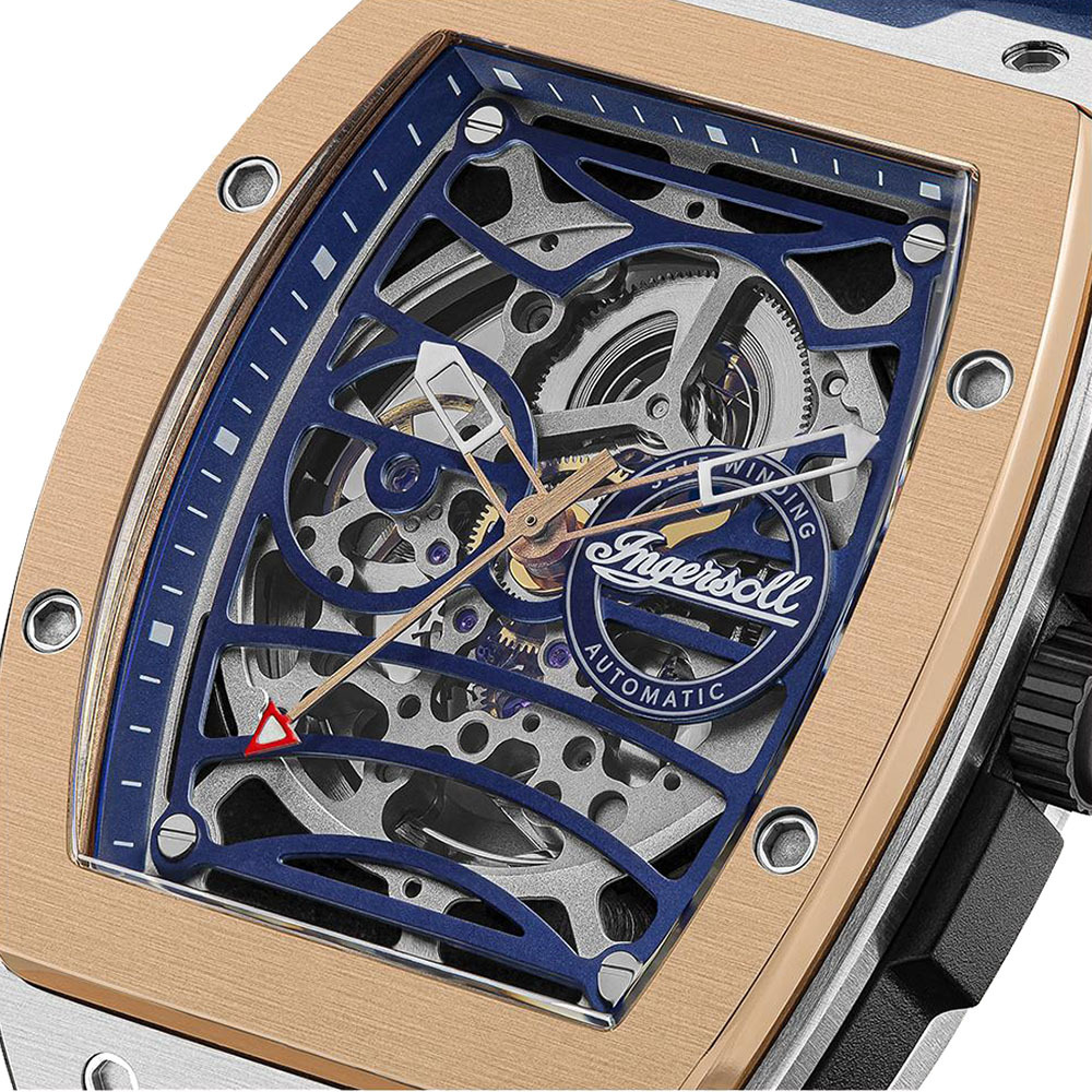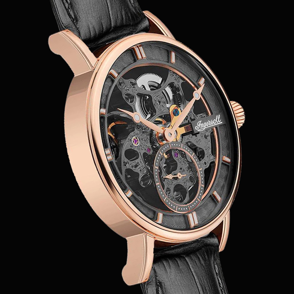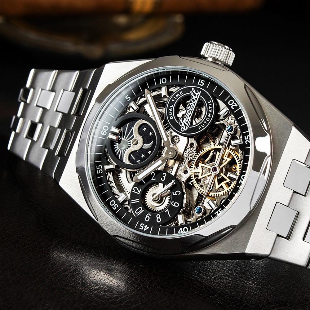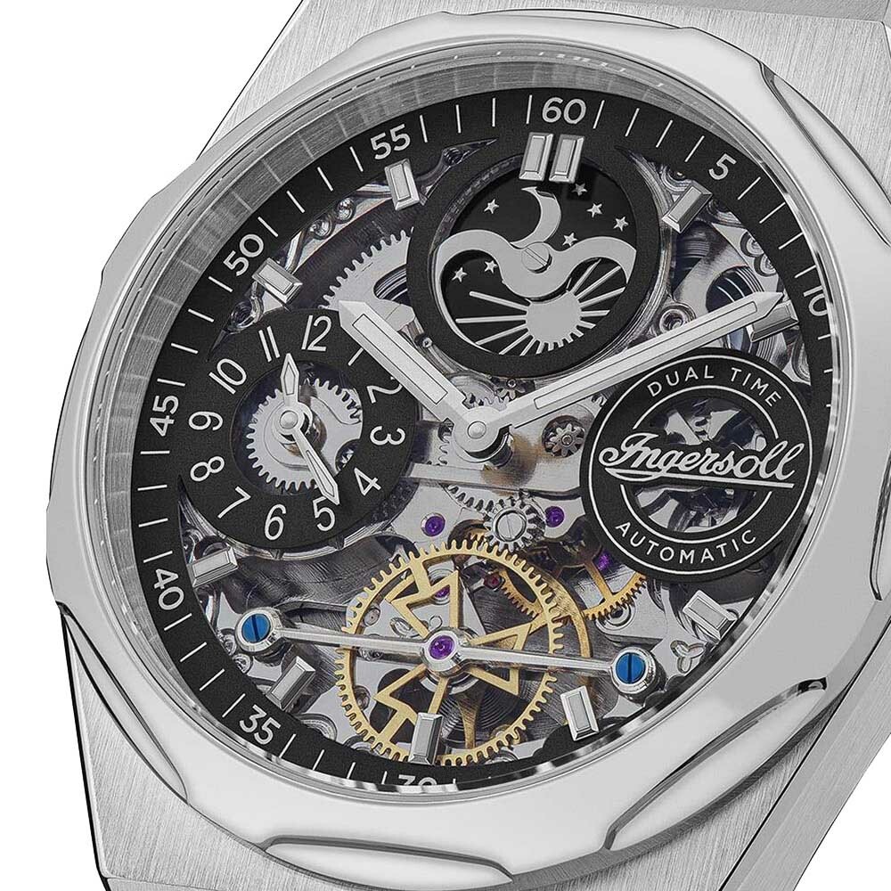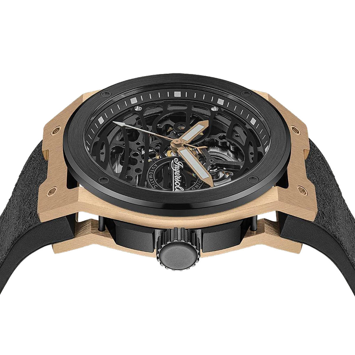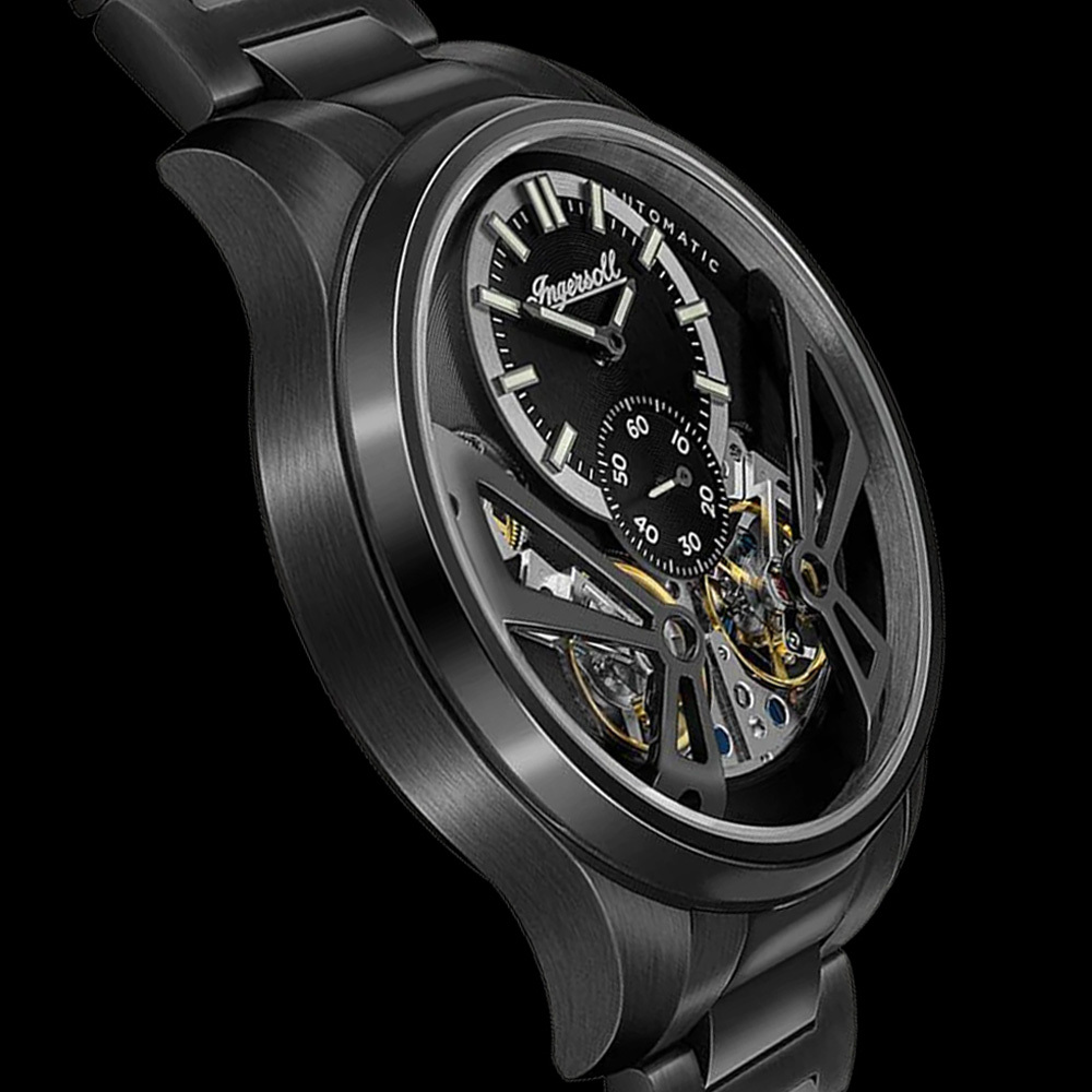 Ingersoll【The Outrider先驅者系列】前後鏤空的設計讓使用者得以清晰看到機芯的每一個齒輪咬合、每一次擺輪的跳動。這不僅僅是設計美感,更是 Ingersoll 對機械藝術的自信 ,全錶殼採用不鏽精鋼拉絲與拋光混合工藝,棱角分明,卻不失手感溫潤。外圈的金屬切面設計,彷彿老底特律工廠的鋼鐵光澤,帶有美式機械的力量感。搭配黑色真皮錶帶,經典又百搭,讓它既能駕馭西裝,也能陪你走在牛仔外套與靴子的街頭。