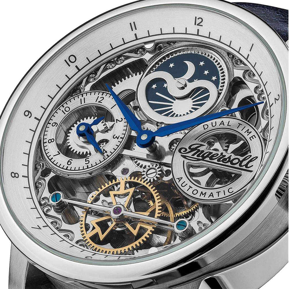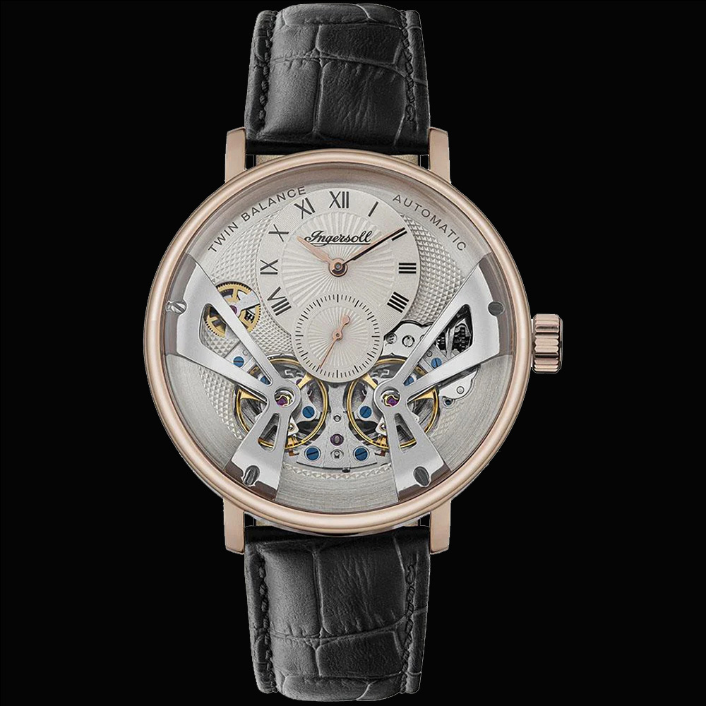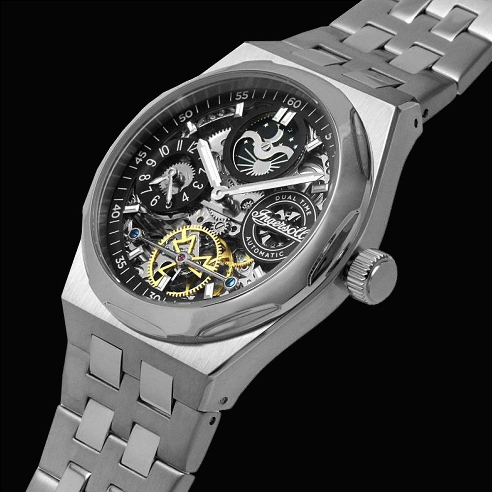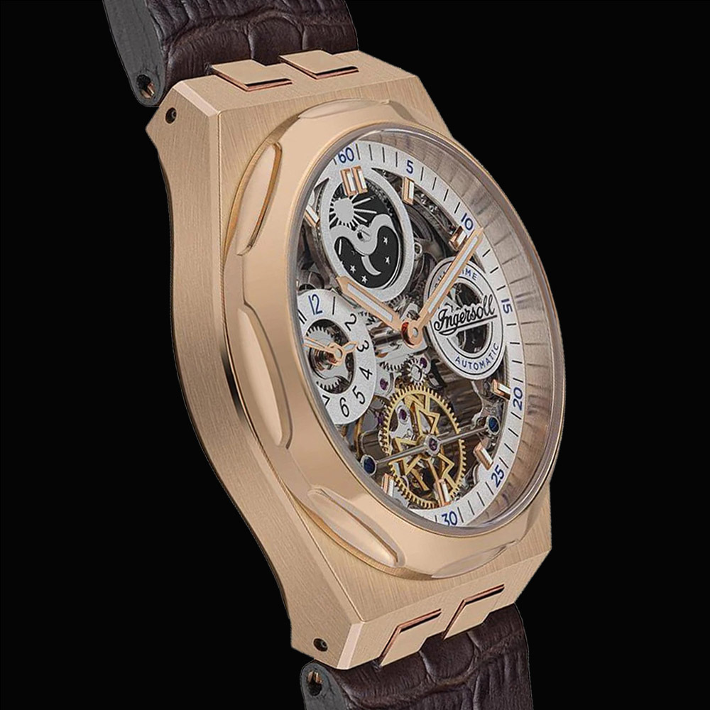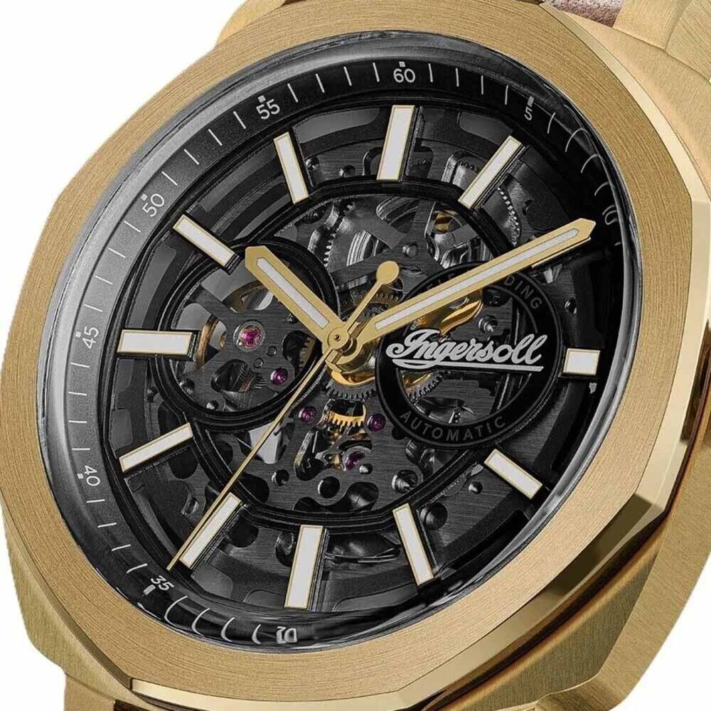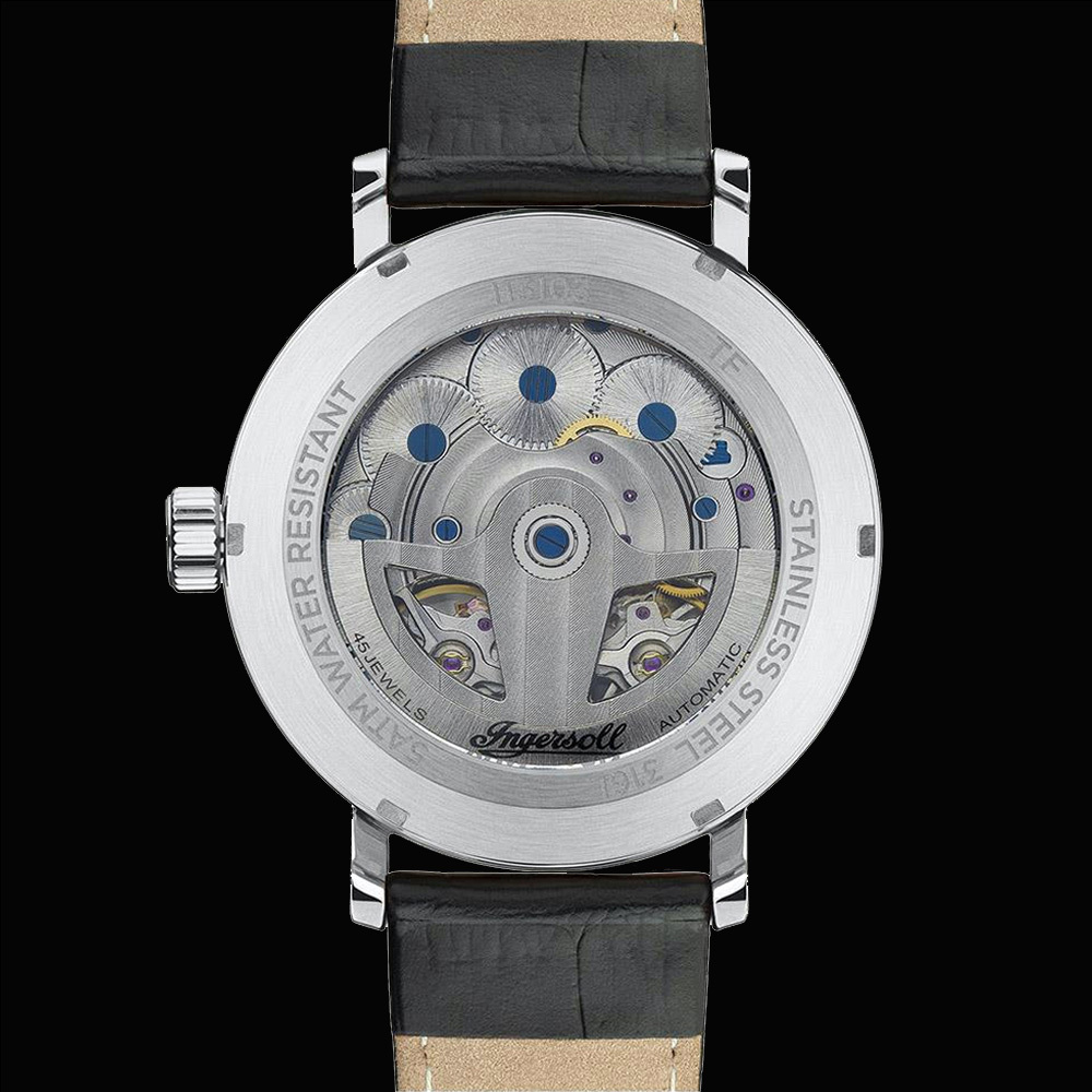 Ingersoll【The Outrider先驅者系列】前後鏤空的設計讓使用者得以清晰看到機芯的每一個齒輪咬合、每一次擺輪的跳動。這不僅僅是設計美感,更是 Ingersoll 對機械藝術的自信 ,全錶殼採用不鏽精鋼拉絲與拋光混合工藝,棱角分明,卻不失手感溫潤。外圈的金屬切面設計,彷彿老底特律工廠的鋼鐵光澤,帶有美式機械的力量感。搭配黑色真皮錶帶,經典又百搭,讓它既能駕馭西裝,也能陪你走在牛仔外套與靴子的街頭。