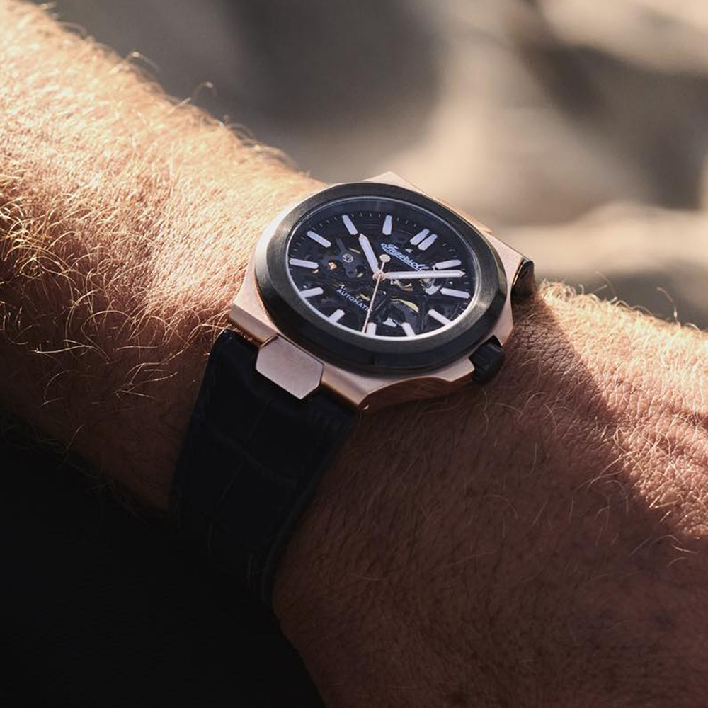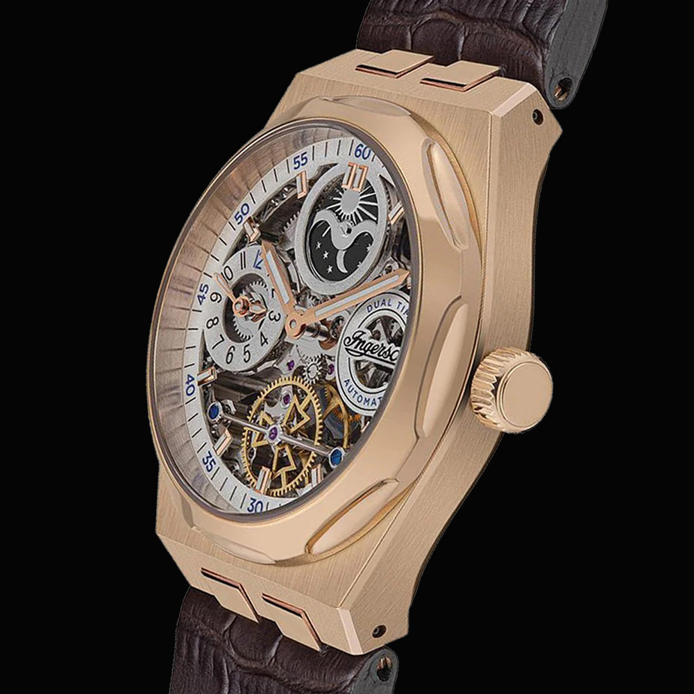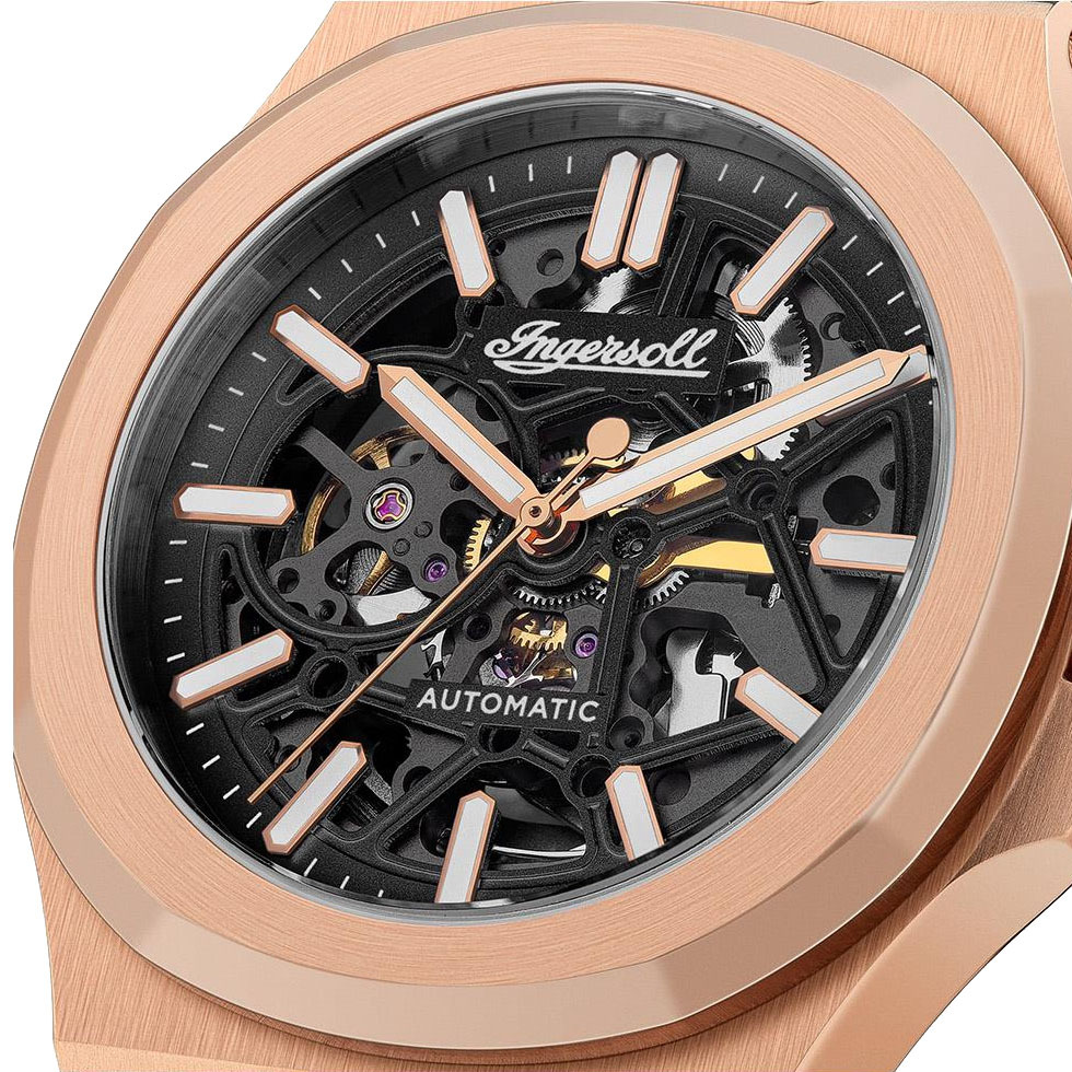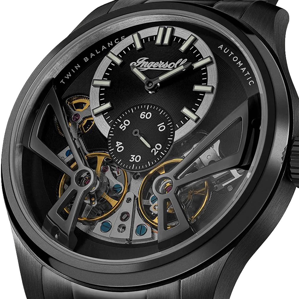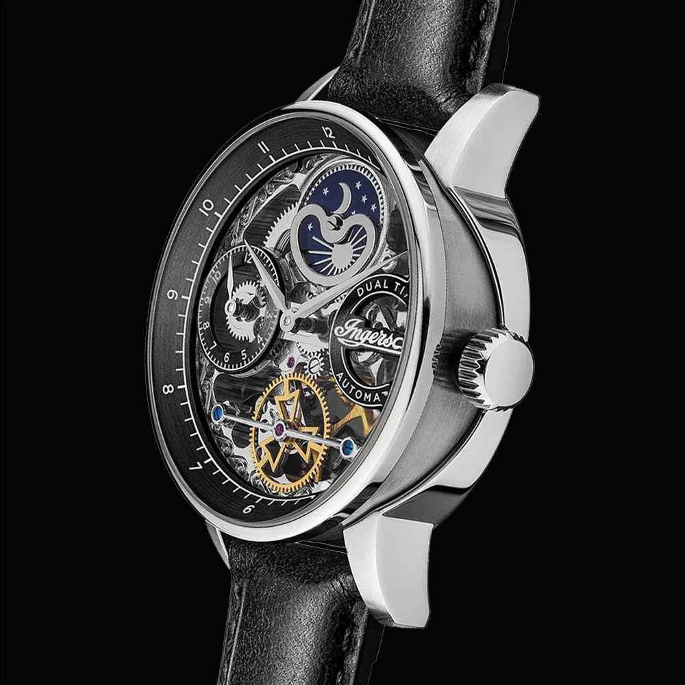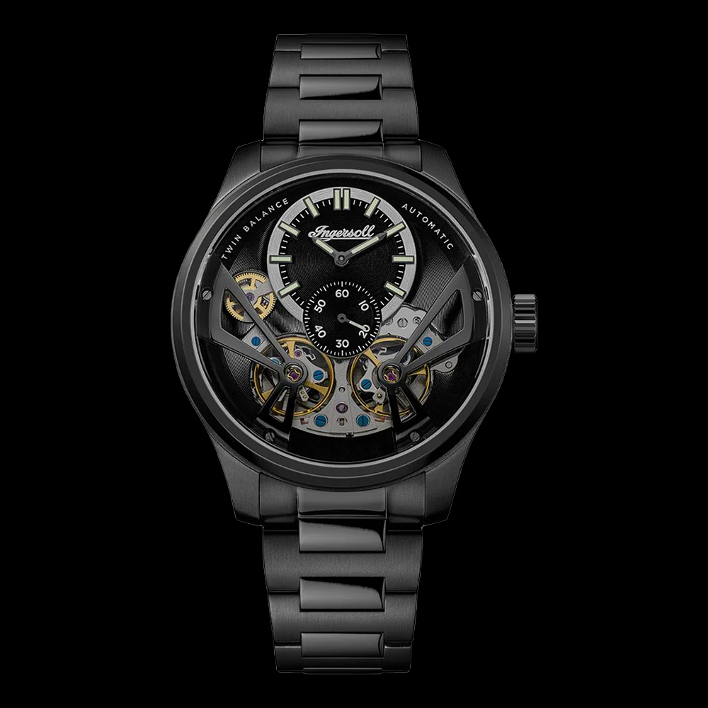Ingersoll【The Outrider先驅者系列】前後鏤空的設計讓使用者得以清晰看到機芯的每一個齒輪咬合、每一次擺輪的跳動。這不僅僅是設計美感,更是 Ingersoll 對機械藝術的自信 ,全錶殼採用不鏽精鋼拉絲與拋光混合工藝,棱角分明,卻不失手感溫潤。外圈的金屬切面設計,彷彿老底特律工廠的鋼鐵光澤,帶有美式機械的力量感。搭配黑色真皮錶帶,經典又百搭,讓它既能駕馭西裝,也能陪你走在牛仔外套與靴子的街頭。