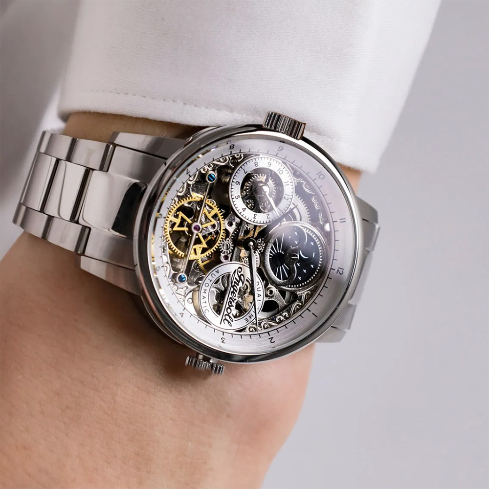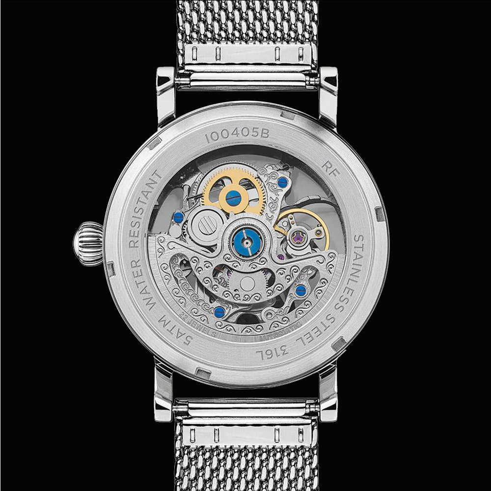 以品牌母公司創辦人為名的The Herald「經典鏤空系列」錶款,以40mm的錶徑呈現濃厚的古典懷錶風格。面盤下方醒目的小秒針盤的設計,猶如展翅的蝴蝶;鏤空半透的機芯夾板佈滿不規則的機刻雕花,營造出古樸的層次感。The Herald英雄錶款共有不鏽鋼配黑灰面盤,以及不鏽鋼鍍玫瑰金配淺灰面盤兩種選擇,並備有不鏽鋼編織帶及小牛真皮錶帶以供消費者多元選擇。