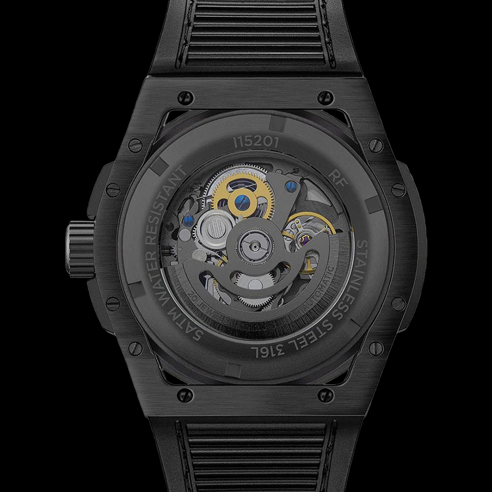 >> 黑色PVD電鍍不鏽精鋼錶殼流露出沉穩卻神祕的品牌魅力,而底蓋適宜的微彎曲線,精準地服貼手腕,搭配柔軟的氟化橡膠錶帶,提供完美平衡的舒適佩戴感。