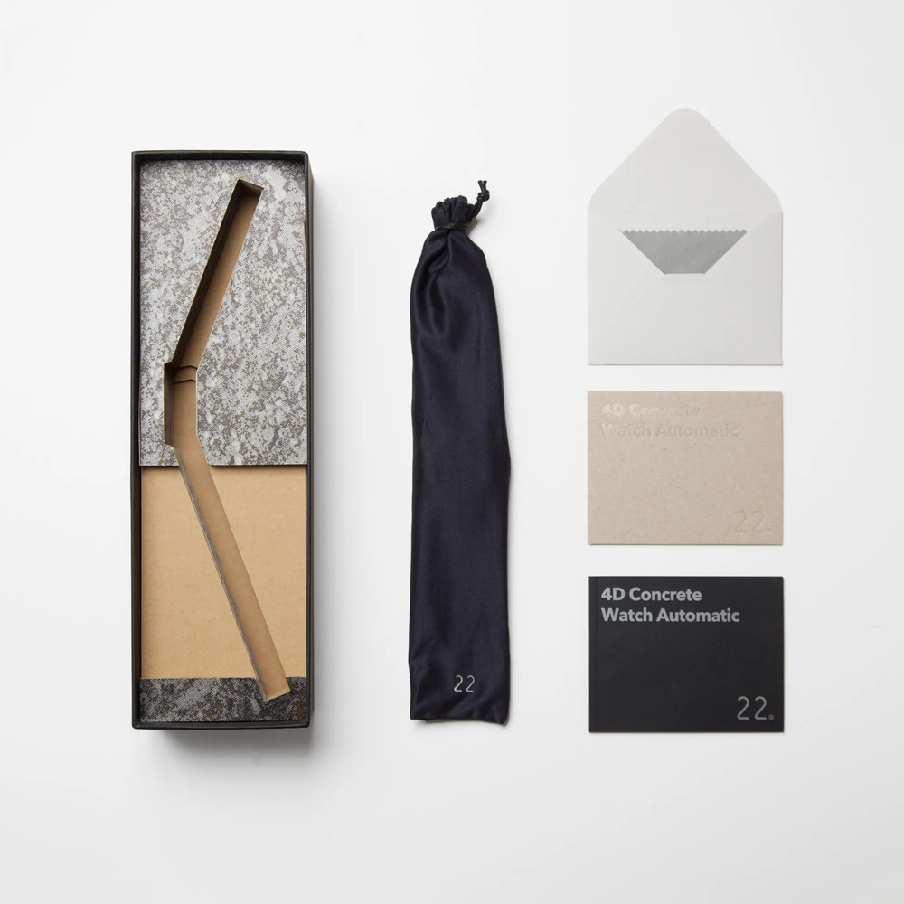 清水模工法為水泥工藝的極致展現,為呈現細緻原始的迷人肌理,絕對仰賴細緻的模具與精密的施工,22STUDIO所有清水模錶盤皆於台北迪化街總部手工製作,獨家專屬配方水泥,添加永續回收骨材,能快速凝結成型、收縮率小、強度高。